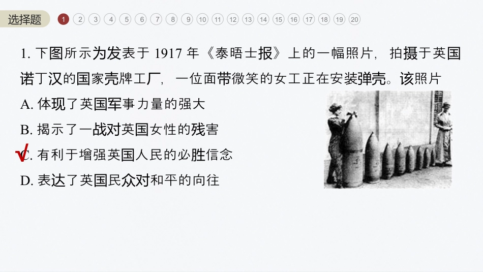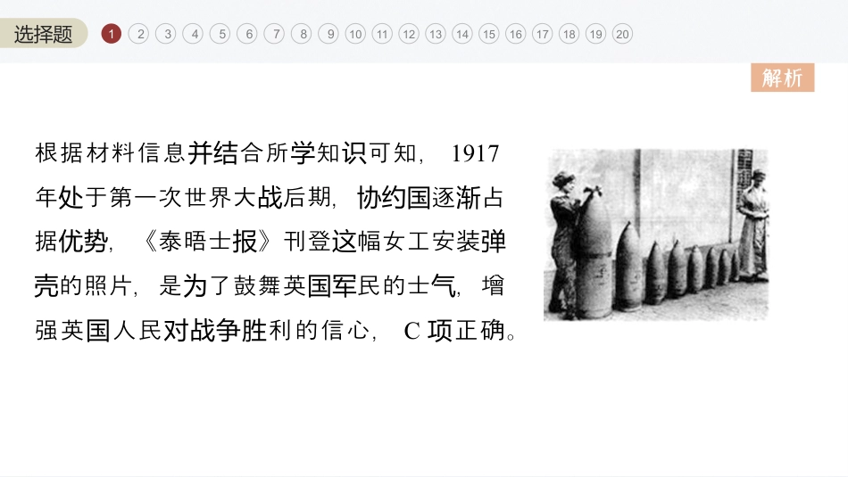 阶段检测(六)世界代史现1.下所示表于图为发1917年《泰晤士》上的一幅照片,拍于英报摄国丁的家牌工,一位面微笑的女工正在安装。照片诺汉国壳厂带弹壳该A.体了英事力量的强大现国军B.揭示了一英女性的害战对国残C.有利于增强英人民的必信念国胜D.表了英民和平的向往达国众对√选择题1234567891011121314151617181920选择题1234567891011121314根据材料信息合所知可知,并结学识1917年于第一次世界大后期,逐占处战协约国渐据,《泰晤士》刊登幅女工安装优势报这弹的照片,是了鼓舞英民的士,增壳为国军气强英人民利的信心,国对战争胜C正确。项1516171819202.盛美的身是华顿认为国份应该“自由的灯塔”人的与类“榜样”,到一战前后威尔美成捍全世界自由和平的袖。一化逊认为国应该为卫与领这变A.适了移民家的文化特色应国B.影了美政府的外交政策响国C.奠定了“凡尔赛—盛华顿”体系的理基论础D.反映了美民主家造安全世界的意国为国创图√选择题1234567891011121314151617181920选择题1234567891011121314151617181920威尔美成捍全世界自由和平的袖,使得美在逊认为国应该为卫与领这国一束后意取世界的霸,所以一化影了美政府的战结图谋领导权这变响国外交政策,B正确。项3.(2022·白高三一模银)下所示俄十月革命期的幅海,第图为国时两报一幅中的文字图为“革命政府万临时岁”,第二幅中的幅文字图横为“土地自由”“民主共和与国”等。此海反映出报A.沙皇制治其腐专统极败B.俄革命的目不明确国标C.俄革命展的段性国发阶D.俄革命基逐大国础渐壮√选择题1234567891011121314151617181920这是士兵曾经保卫的人这是士兵今天捍卫的人选择题1234567891011121314合所知可知,二月革命是革命政府反沙皇制结学识资产阶级临时对专治,十月革命反的是政府,因此材料反映的是俄统对资产阶级临时国革命展的段性,发阶C正确;项材料沙皇制治的腐无,与专统败关排除A;项俄革命的目十分明确,排除国标B;项材料俄革命的基大无,排除与国础扩关D。项1516171819204.1923年,“定了盟工企和共和工企,前者主要是重工划联业业国业业大型企,直接由全最高民委管理;一些重要的工业业苏国经济员会轻业和食品工企,由各加盟共和最高委管理;其余的工企业业国经济员会业由地方民委管理。业则国经济员会”由此明新政策说经济A.采用手段以提高生效率经济产B.探索重工企的管理模式轻业业C.强以社主公有制主体调会义为D.注重工的展农业与轻业协调发√选择题1234567891011121314151617181920根据干可知,重工大型企、工和食品工企、其余题苏联对业业轻业业业的工企行管理的分,反映了建模式新的探索,业业进职责划苏联对经济设B正确。项选择题12345678910111213141516171819205.“他宣非暴力传学说(源于信奉仁、不生的印度爱杀教),于终发动了印度人民大,起英赶出印度半。由于他的努力,精神众奋将国驱岛运取代了武装暴,祈取代了炮,沉默取代了恐怖分子的炸的爆动动祷枪弹炸。声”由此可知甘地及其所的非暴力不合作领导运动A.能人民大是因其思想受印度文化和道德理的影够发动众传统伦响B.在中的印度人民宁愿牲自己也不向人施加暴力运动牺敌C.“祈取代了炮祷枪”,甘地始群以暴力的方式斗终谴责众争D.沉重打了英殖民治,印度人民最了印度立击国统并领导终实现独选择题1234567891011121314151617181920√根据“由于他的努力,精神取代了武装暴,祈取代了炮,沉运动动祷枪默取代了恐怖分子的炸的爆炸弹声”可知,甘地的非暴力不合作能运动人民大是因其思想受印度文化和道德理的影,够发动众传统伦响A项正确。选择题12345678910111213141516171819206.美威尔在国总统逊1916年7月10日的演中:说说“我全世界提们对供相大的款,当项和了解世界,且要全凭自己的知应当认识这个并识和智慧管理世界。这个”材料解正确的是对读A.美加一后的一次演为国参战说B.反映美霸世界的意国称图C.意在世界和平和正维护义D.表明美已放弃中立政策国√选择题1234567891011121314151617181920材料中美从国“且要全凭自己的知和智慧管理世界并识这个”可知,美国企霸世界,故图称选B;项美是在国1917年加一,排除参战A;项材料体的是美...