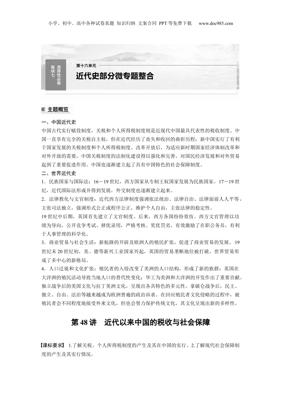 小学、初中、高中各种试卷真题知识归纳文案合同PPT等免费下载www.doc985.com一、中国近代史中国古代实行赋役制度,关税和个人所得税制度则是近现代中国最具代表性的税收制度。中国一直享有完全的关税自主权,但在近代经历了丧失和收回的曲折历程;新中国实行了有利于国家发展的关税制度和个人所得税制度。改革开放后,为适应新时期国家经济体制改革和对外开放的需要,中国关税制度的法制化建设得以强化和完善,对国民经济发展和对外贸易起到了重要促进作用。中国也逐渐建立起了具有中国特色的社会保障制度。二、世界近代史1.民族国家与国际法:16-19世纪,西方国家从专制王权国家发展为民族国家。17-19世纪,近代国际法形成并得到发展,外交制度也逐渐建立起来。2.法律教化与文官制度:近代西方法律制度强调依法统治、法律自治、法律面前人人平等,主张司法独立,强调形式公正或程序公正,维护个人自由,主张法律的稳定性。19世纪中后期,英国首先建立了文官制度。后来,西方各国纷纷效仿。西方文官管理以功绩为导向,公开竞争考试、择优录用,严格考核、奖优罚劣,有效激励了在职公务员,有利于人事管理的科学化。3.商业贸易与社会生活:新航路的开辟及欧洲人的殖民扩张,促进了商业贸易的发展。19世纪末20世纪初,美、德等新兴工业国家兴起,英国的贸易垄断地位被打破,世界贸易形成了多中心的新格局。4.人口迁徙和文化扩张:殖民者的入侵改变了美洲的人口结构,形成了新的族群;英国在大洋洲的殖民活动导致当地人口的替代性变化;华工为美洲和大洋洲的开发作出了重要贡献。独立战争后的美国文化与拉丁美洲文化,呈现出各具特色的多元性。拿破仑战争后,民主、独立、自由、法治等越来越成为欧洲普遍的政治诉求。在回应殖民者文化侵略的过程中,被殖民者会不同程度地接受外来文化,但也会努力保护传统文化,其文化呈现出新的多样性。第48讲近代以来中国的税收与社会保障课标要求1.了解关税、个人所得税制度的产生及其在中国的实行。2.了解现代社会保障制度的产生及其实行情况。小学、初中、高中各种试卷真题知识归纳文案合同PPT等免费下载www.doc985.com考点定位1.近代以来中国税收制度演变历程。2.现代社会保障制度的作用。1.关税制度时期内容古代(1)中国的关税最早出现在西周时期。(2)存在国内关税和与国境关税并立的现象近代(1)鸦片战争后,中国开始丧失关税自主权,海关大权也长期把持在外国人手中。(2)1927年南京国民政府宣告关税自主,并公布国定《进口税暂行条例》。(3)1928年,国民政府发表“改订新约”的对外宣言,关税自主为其主要内容之一现代(1)新中国成立后不久,政务院就颁布了第一部独立的专门的海关税法——《中华人民共和国海关进出口税则》及其实施条例,统一了全国关税制度。(2)1985年,国务院颁布《中华人民共和国进出口关税条例》和《中华人民共和国海关进出口税则》,强化了关税制度的法制化建设。(3)1987年,颁布《中华人民共和国海关法》,重新修订发布关税条例,进一步完善了关税的基本制度思维点拨近代关税和传统关税相比的特点(1)物在出境一次性征收,在同一境不再重征。货进国时国内(2)境一律以形式征收,而封建社是以物形式征收。国关税货币会实2.个人所得税制度(1)含义:以纳税人个人取得的各项应税所得为征收对象的税种。(2)演变时间表现1914年北洋政府制定了一个包括征收个人所得税的条例,个人所得税制度起步1936年国民政府公布了所得税暂行条例,随之开始征收个人所得税新中国成立后在计划经济体制下,没有征收个人所得税1980年全国人民代表大会通过了《中华人民共和国个人所得税法》,我国的个人所得税制度正式确立(3)作用:对调节个人收入和实现社会稳定发挥了积极作用。思维点拨我国个人所得税的特点(1)行分征收。实类(2)累率比例率用。进税与税并(3)用扣除。费额较宽小学、初中、高中各种试卷真题知识归纳文案合同PPT等免费下载www.doc985.com(4)算便。计简(5)采取源制和申制征方法。课报两种税3.中国特色社会保障制度(1)1951年2月政务院发布的《中华人民共和国劳动保险条例》是新中国制定的第一部社会保险法规。(2)改革开放后,...
