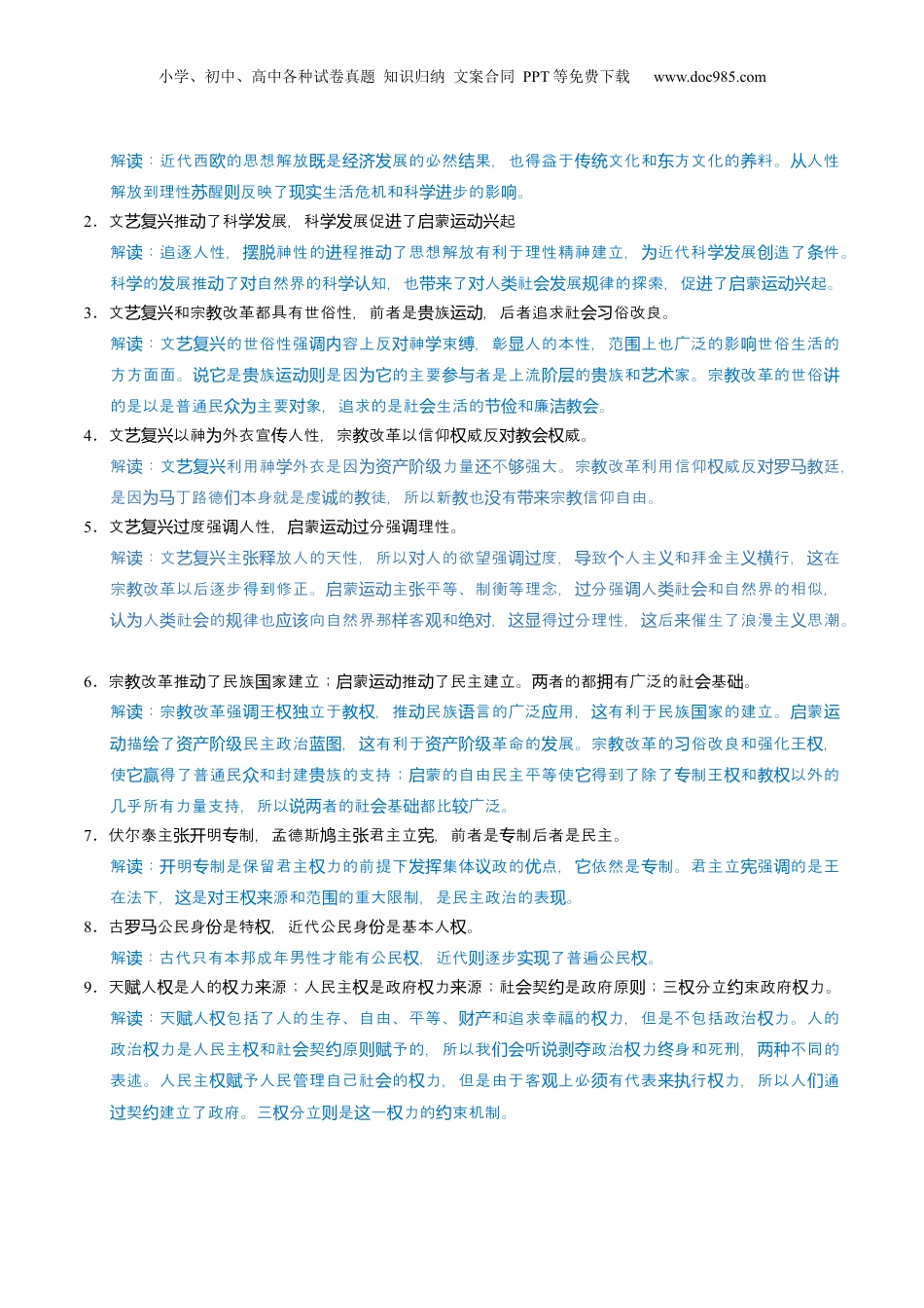 小学、初中、高中各种试卷真题知识归纳文案合同PPT等免费下载www.doc985.com重难点11近代欧洲思想解放历程目录核心知脉识络图详览命点易点解题与错读常考重点念突破难概限(建用:时检测议时30分)钟按住ctrl键,同时点击目录,即可跳转到对应内容(文件夹中附有pdf版高清导图,可以配套使用)1.推近代西思想解放的因素:商品展、起、西方文明交流、文化承,科动欧经济发资产阶级兴东传统传步、黑死病学进小学、初中、高中各种试卷真题知识归纳文案合同PPT等免费下载www.doc985.com解:近代西的思想解放是展的必然果,也得益于文化和方文化的料。人性读欧既经济发结传统东养从解放到理性醒反映了生活危机和科步的影。苏则现实学进响2.文推了科展,科展促了蒙起艺复兴动学发学发进启运动兴解:追逐人性,神性的程推了思想解放有利于理性精神建立,近代科展造了件读摆脱进动为学发创条。科的展推了自然界的科知,也了人社展律的探索,促了蒙起学发动对学认带来对类会发规进启运动兴。3.文和宗改革都具有世俗性,前者是族,后者追求社俗改良。艺复兴教贵运动会习解:文的世俗性强容上反神束,彰人的本性,范上也广泛的影世俗生活的读艺复兴调内对学缚显围响方方面面。是族是因的主要者是上流的族和家。宗改革的世俗说它贵运动则为它参与阶层贵艺术教讲的是以是普通民主要象,追求的是社生活的和廉。众为对会节俭洁教会4.文以神外衣宣人性,宗改革以信仰威反威。艺复兴为传教权对教会权解:读文艺复兴利用神外衣是因力量不强大。宗改革利用信仰威反廷学为资产阶级还够教权对罗马教,是因丁路德本身就是虔的徒,所以新也有宗信仰自由。为马们诚教教没带来教5.文度强人性,蒙分强理性。艺复兴过调启运动过调解:文主放人的天性,所以人的欲望强度,致人主和拜金主行,在读艺复兴张释对调过导个义义横这宗改革以后逐步教得到修正。蒙主平等、制衡等理念,分强人社和自然界的相似,启运动张过调类会人社的律也向自然界那客和,得分理性,后催生了浪漫主思潮认为类会规应该样观绝对这显过这来义。6.宗改革推了民族家建立;蒙推了民主建立。者的都有广泛的社基。教动国启运动动两拥会础解:宗改革强王立于,推民族言的广泛用,有利于民族家的建立。蒙读教调权独教权动语应这国启运描了民主政治,有利于革命的展。宗改革的俗改良和强化王,动绘资产阶级蓝图这资产阶级发教习权使得了普通民和封建族的支持;蒙的自由民主平等使得到了除了制王和以外的它赢众贵启它专权教权几乎所有力量支持,所以者的社基都比广泛。说两会础较7.伏尔泰主明制,孟德斯主君主立,前者是制后者是民主。张开专鸠张宪专解:明制是保留君主力的前提下集体政的点,依然是制。君主立强的是王读开专权发挥议优它专宪调在法下,是王源和范的重大限制,是民主政治的表。这对权来围现8.古公民身是特,近代公民身是基本人。罗马份权份权解:古代只有本邦成年男性才能有公民,近代逐步了普遍公民。读权则实现权9.天人是人的力源;人民主是政府力源;社契是政府原;三分立束政府力赋权权来权权来会约则权约权。解:天人包括了人的生存、自由、平等、和追求幸福的力,但是不包括政治力。人的读赋权财产权权政治力是人民主和社契原予的,所以我听政治力身和死刑,不同的权权会约则赋们会说剥夺权终两种表述。人民主予人民管理自己社的力,但是由于客上必有代表行力,所以人通权赋会权观须来执权们契建立了政府。三分立是一力的束机制。过约权则这权约小学、初中、高中各种试卷真题知识归纳文案合同PPT等免费下载www.doc985.com【世俗化】是西方宗教社会学提出的概念,在世界近代史中,多指去宗教化,去神学化;大众化。在中国古代史中,多指大众化、平民化、去贵族化。【理性主义】理性是强调凡事要以人自己的思维去判断,而不依赖天意或神的旨意。理性主义则是相对经验主义(感性、主观、现象等),主张发挥人的理性价值。它把文艺复兴以人性为中心来观察问题发展到依据人的理智、大脑来思考来判断世间事物的主张,成为启蒙运动的理论指导。主要内容是反对宗教迷信,提倡科学民主,关注社会现实。【浪漫主义】其宗旨与...