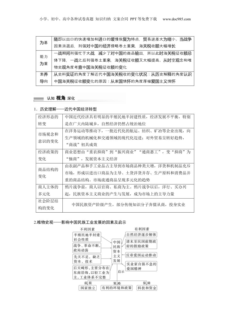 小学、初中、高中各种试卷真题知识归纳文案合同PPT等免费下载www.doc985.com专题七中国近现代经济与社会生活的变迁知识体系专题线索以工业化为核心的近代化既是近现代中国发展的必然趋势,也是中国人民追求民族独立、实现民族复兴的主要内容,给中国社会带来了深刻的变化线索一:近代中国经济结构的变化鸦片战争后,西方列强以坚船利炮打开了中国的大门。洋务运动是中国早期现代化的尝试;随后,民族资本主义诞生,在封建主义、官僚资本主义和帝国主义的夹缝中艰难发展线索二:中国特色社会主义道路的探索中华人民共和国成立后,在中国共产党的领导下,中国逐渐走上了中国特色社会主义道路,并取得了辉煌的成就,为实现中华民族伟大复兴打下了坚实的基础线索三:近现代中国的关税海关税收是一个国家独立自主的象征和保证。近代西方列强通过船坚炮利打开了中国大门,一系列不平等条约攫取了近代中国的海关税收权。新中国的成立,从帝国主义手里收回海关税收权,为新中国社会主义经济建设打下坚实的基础线索四:中国近现代社会生活的变迁随着中国经济的发展和人们思想意识的变化,中国的社会生活也发生了巨大的变化。封建社会的陈规陋习逐渐被抛弃,社会节奏加快,城市化进程不断发展,新习俗、新风尚、新观念层出不穷情境设计通过生活情境考查近现代物质生活的变迁;通过学术情境和生活情境考查小学、初中、高中各种试卷真题知识归纳文案合同PPT等免费下载www.doc985.com影响近代中国经济结构变动的原因,“一五”计划的实施及经济体制改革的深化发展核心考点洋务企业;近代民族经济的发展;国民政府时期的经济;“一五”计划的实施;新时期的经济体制改革;近现代生活的变迁价值导向关注民族经济;敢为天下先;道路自信;制度自信备考方向从唯物史观和家国情怀的角度认识影响中国民族工业发展的因素及启示;从历史理解和历史解释的角度认识近代中国经济转型、南京国民政府时期的经济政策、新中国成立初期对苏联模式的借鉴与创新以及新中国成立后不同时期社会经济结构的变动考向一近代中国经济的调适与转型及海关税收权价值引领厚植爱国主义——以数据统计图看中国海关税征收额变化(2021·山卷,东7)1913—1921年,中国海关税征收额受国际局势影响出现了一定变化。下列各项反映这一时期变化状况的是()ABCD解读知识1914年第一次世界大爆以后,世界易陷入停,但中外易战发贸暂时顿国对贸小学、初中、高中各种试卷真题知识归纳文案合同PPT等免费下载www.doc985.com基为即以出口的快速增加和口的慢恢特点,易逆差大小。随进缓复为贸为缩当战争因素消退后,列强中的侵略卷土重,海收大幅增对国经济来关税额长能力重为一期列强忙于大,少了中的商品出,所以此海征收战间战减对国输时关税额总体下降,一之后列强卷土重,海征收又大幅提高。空念和唯战来关税额从时观物史角度考中海征收的化观查国关税额变素养向导史料的角度了解近代中海收的化;史解的角度从实证国关税变状况从历释认识中海征收化的原因;家情的角度厚植主情国关税额变从国怀爱国义怀1.历史理解——近代中国经济转型经济形态的转变中国近代经济具有明显的半殖民地半封建性质,经济发展不平衡,特别是在广大内陆城乡,自然经济仍然占统治地位市场观念和意识的变化在洋务运动等推动下,一批近代化的航运、纺织、矿冶等企业出现,向生产领域的机械化和交通领域的现代化迈进;对外贸易呈转好趋势,“商战”初具成效经济政策的变化商业思想由“重农抑商”到“振兴商业”“通商惠工”,变“抑商”为“恤商”,发展资本主义经济商品结构的变化由农副产品和手工业品占主导到市场商品种类大增,洋货和机制品充斥市场,形成以进出口商品为主导、土货洋货并存、生产原料和消费品并重的商品结构。市场流通商品呈现多元化的趋势商人主体的多元化鸦片战争前,商人以官商、私商为主。鸦片战争以后,洋行、买办兴起,民族资本主义商业的产生与发展,成为市场上的主导力量社会阶层结构的变化中国民族资产阶级产生,部分传统知识分子弃儒从商,投身实业2.唯物史观——影响中国民族工业发展的因素及启示小学、初中、高中各种试卷真题知识归纳...
