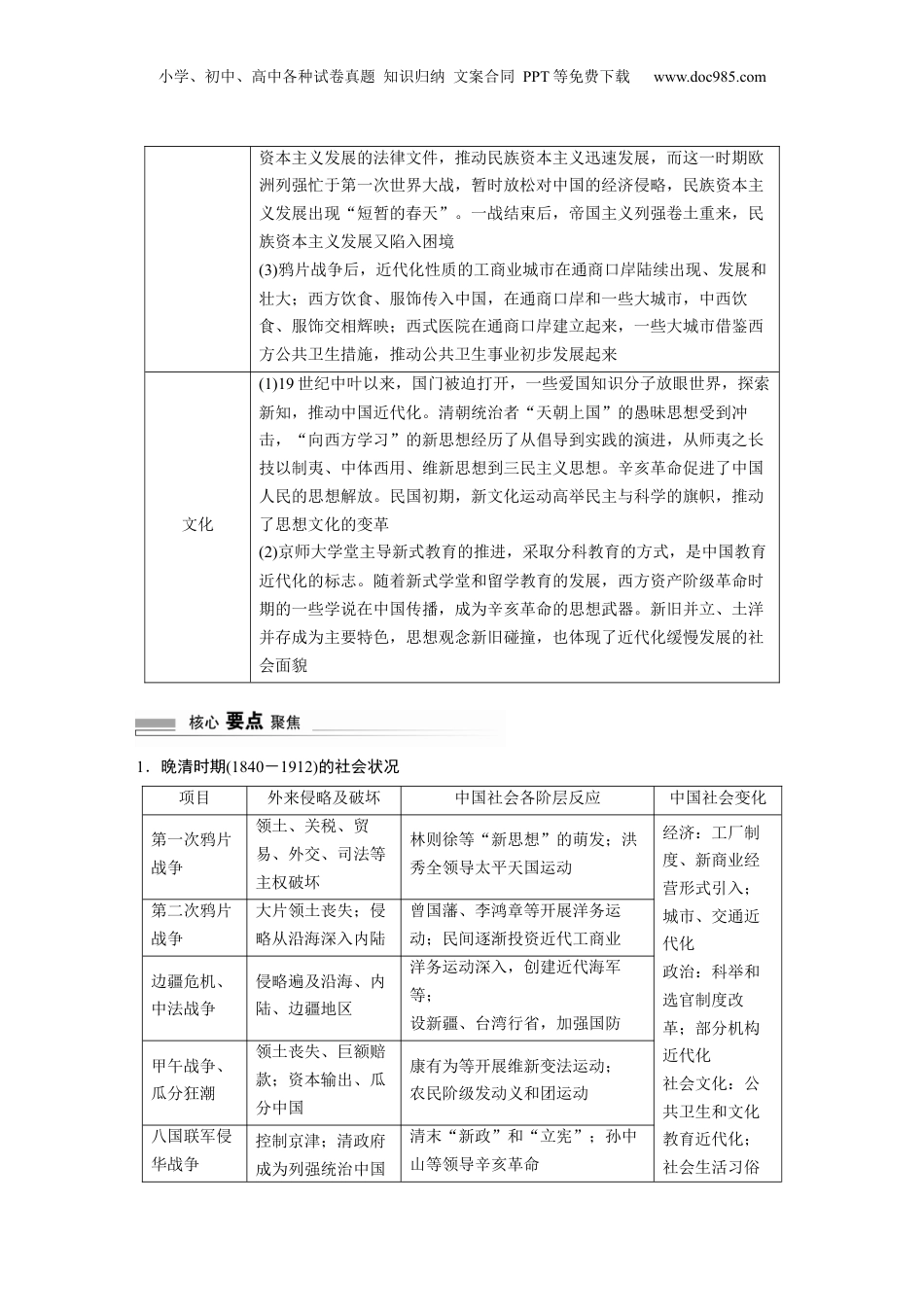 小学、初中、高中各种试卷真题知识归纳文案合同PPT等免费下载www.doc985.com微专题1中华文明的沉沦与上升——旧民主主义革命时期1840年鸦片战争至1919年五四运动是中国旧民主主义革命时期,落后的农业文明遭受先进的工业文明的冲击,中国开启了近代化的历程政治(1)晚清时期,西方列强发动侵华战争,中国的主权遭到破坏,半殖民地半封建化程度不断加深。为挽救民族危机和统治危机,清政府先后推行“戊戌新政”和“清末新政”,在一定程度上推动了中国近代化的进程,但最终失败。晚清时期,在镇压太平天国运动和兴办洋务的过程中,汉族官僚势力上升,逐渐成为官僚队伍的主体;鸦片战争后,产生于西方的外交制度和国际法逐渐引入中国,中国古代的宗藩体系逐渐瓦解;中国开始丧失关税自主权,中国国境关税的海关大权也长期把持在外国人手中(2)辛亥革命和中华民国的建立改变了中国历史的进程,资产阶级共和制在中国建立;《中华民国临时约法》以法律的形式确立了资产阶级共和国的国家政治制度和政权组织形式(3)北洋军阀统治时期政党政治活跃;孙中山等资产阶级革命派为维护民主共和进行的斗争先后失败。军阀割据造成中央权威受到削弱,一方面,美日等国趁机加紧对华侵略,给中华民族带来了深重的灾难;另一方面也为革命势力的发展和新思想的出现创造了相对有利的环境经济与社会生活(1)鸦片战争以后,中国逐渐卷入资本主义世界市场,成为西方的原料产地和商品倾销市场,买办阶层出现;新的商业经营形式被引入中国,银行、股份制企业、证券机构、百货公司等出现。19世纪70年代以后,近代海上运输、铁路运输发展起来,京杭大运河的地位下降,深刻影响了中国的经济格局。19世纪中后期,洋务派创办了一系列近代企业,引进了西方的工厂制度。后来,一批民族资本家开办工厂,中国民族工业初步发展起来(2)辛亥革命后,南京临时政府大力提倡发展实业,开始着手经济法制的建设;北洋政府颁布一系列经济法规。民国政府颁布的一系列促进民族小学、初中、高中各种试卷真题知识归纳文案合同PPT等免费下载www.doc985.com资本主义发展的法律文件,推动民族资本主义迅速发展,而这一时期欧洲列强忙于第一次世界大战,暂时放松对中国的经济侵略,民族资本主义发展出现“短暂的春天”。一战结束后,帝国主义列强卷土重来,民族资本主义发展又陷入困境(3)鸦片战争后,近代化性质的工商业城市在通商口岸陆续出现、发展和壮大;西方饮食、服饰传入中国,在通商口岸和一些大城市,中西饮食、服饰交相辉映;西式医院在通商口岸建立起来,一些大城市借鉴西方公共卫生措施,推动公共卫生事业初步发展起来文化(1)19世纪中叶以来,国门被迫打开,一些爱国知识分子放眼世界,探索新知,推动中国近代化。清朝统治者“天朝上国”的愚昧思想受到冲击,“向西方学习”的新思想经历了从倡导到实践的演进,从师夷之长技以制夷、中体西用、维新思想到三民主义思想。辛亥革命促进了中国人民的思想解放。民国初期,新文化运动高举民主与科学的旗帜,推动了思想文化的变革(2)京师大学堂主导新式教育的推进,采取分科教育的方式,是中国教育近代化的标志。随着新式学堂和留学教育的发展,西方资产阶级革命时期的一些学说在中国传播,成为辛亥革命的思想武器。新旧并立、土洋并存成为主要特色,思想观念新旧碰撞,也体现了近代化缓慢发展的社会面貌1.晚清时期(1840-1912)的社会状况项目外来侵略及破坏中国社会各阶层反应中国社会变化第一次鸦片战争领土、关税、贸易、外交、司法等主权破坏林则徐等“新思想”的萌发;洪秀全领导太平天国运动经济:工厂制度、新商业经营形式引入;城市、交通近代化政治:科举和选官制度改革;部分机构近代化社会文化:公共卫生和文化教育近代化;社会生活习俗第二次鸦片战争大片领土丧失;侵略从沿海深入内陆曾国藩、李鸿章等开展洋务运动;民间逐渐投资近代工商业边疆危机、中法战争侵略遍及沿海、内陆、边疆地区洋务运动深入,创建近代海军等;设新疆、台湾行省,加强国防甲午战争、瓜分狂潮领土丧失、巨额赔款;资本输出、瓜分中国康有为等开展维新变法运动;农民阶级发动义和团运动八国联军侵...