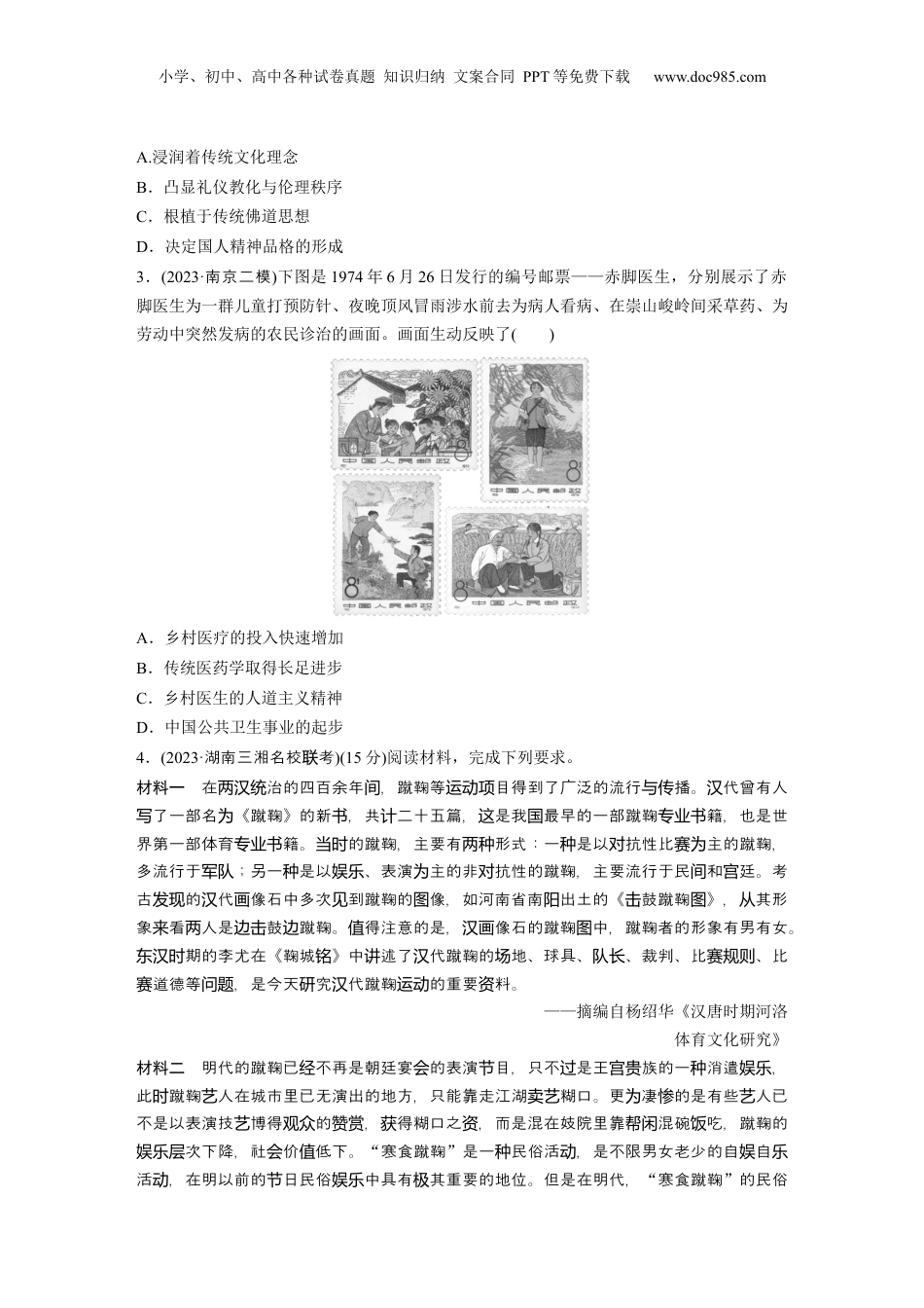 小学、初中、高中各种试卷真题知识归纳文案合同PPT等免费下载www.doc985.com(二)贯彻五育并举促进全面发展1.热点情境引领在“六一”童到之,中共中央、家主席、中央委主席近平国际儿节来际总书记国军习来到北京育英校,看望慰生。近平强,少年童是祖的未,是中民族学问师习总书记调儿国来华的希望。新代中童是有志向、有想,、,感恩、友善,敢时国儿应该梦爱学习爱劳动懂懂创新、敢斗,德智体美全面展的好童。在全育大中,近平重点强,奋劳发儿国教会习总书记调以凝聚人心、完善人格、人力、培育人才、造福人民工作目,培德智体美全面开发为标养劳展的社主建者和接班人。发会义设2.命题视角1.劳动精神和实践(2023·湖北卷)象形文字在一定程度上可以反映创字时的生态环境、经济生活和思想观念等。下表是“农”字的演变历程,其创意是在树木众多的地方以蜃(蚌壳)制工具从事劳作。“农”字的创制可反映当时()A.天人合一的宇宙观念B.渔猎采集的劳动方式小学、初中、高中各种试卷真题知识归纳文案合同PPT等免费下载www.doc985.comC.形神兼备的书画艺术D.原始农耕的生产状况2.审美能力与修养(2023·海南卷)琼剧源于明代传入的“军戏”。它以中板为主,融会了多种外来剧种的声腔和曲牌,到20世纪30年代才有现名。有戏谚云:“生脚儒雅且潇洒,旦脚文静又婉娇。彩旦辣,花生刁,书僮天真梅香飘。”独特的文化内蕴和表演形式使其远播粤、桂等地以及东南亚一些国家。这一历程主要反映()A.故土情结助推文化传承B.人口迁徙促进文化交流C.商路畅通带动文化传播D.艺术形态彰显文化魅力3.健康观念和意识(2023·北京卷)1954年,政务院发布通知,要求政府机关人员“在每天上午和下午的工作时间中各抽出十分钟做工间操”。随后,国家体委也公布并推行了第一套少年广播体操和儿童广播体操,很快成为中小学生每日必做的早操和课间操。这表明()A.政府意在减少劳动和学习时间B.竞技体育精神深入社会各行业C.民众逐渐接受了休闲娱乐观念D.政府高度重视增强民众的体质1.(2022·岭高三考铁联)崇尚耕读的明代学者吴与弼教导未早起劳作的弟子:“秀才若为懒惰,即他日何从到伊川(程颐)门下?又何从到孟子门下?”清代思想家颜元认为:“吾用力农事,不遑食寝,邪妄之念,亦自不起。”由此可知()A.明清时期士农界限已经被打破B.劳动的道德教化价值受到重视C.中国文化的耕读传统初步形成D.体现了重农抑商政策不断强化2.(2023·坊模潍拟)武术是中国传统的体育项目。下表体现了中华武术蕴含的独特魅力,由此可知中华武术()技击观以静制动、以柔克刚、后发先制、性命双修健身观形神合一、内外兼修、内养性情、外练筋骨意境观形意统合、形神兼备、天人合一、物我两忘抱拳礼右手握拳,寓意尚武;左手掩拳,寓意崇德小学、初中、高中各种试卷真题知识归纳文案合同PPT等免费下载www.doc985.comA.浸润着传统文化理念B.凸显礼仪教化与伦理秩序C.根植于传统佛道思想D.决定国人精神品格的形成3.(2023·南京二模)下图是1974年6月26日发行的编号邮票——赤脚医生,分别展示了赤脚医生为一群儿童打预防针、夜晚顶风冒雨涉水前去为病人看病、在崇山峻岭间采草药、为劳动中突然发病的农民诊治的画面。画面生动反映了()A.乡村医疗的投入快速增加B.传统医药学取得长足进步C.乡村医生的人道主义精神D.中国公共卫生事业的起步4.(2023·湖南三湘名校考联)(15分)阅读材料,完成下列要求。材料一在治的四百余年,蹴鞠等目得到了广泛的流行播。代曾有人两汉统间运动项与传汉了一部名《蹴鞠》的新,共二十五篇,是我最早的一部蹴鞠籍,也是世写为书计这国专业书界第一部体育籍。的蹴鞠,主要有形式:一是以抗性比主的蹴鞠,专业书当时两种种对赛为多流行于;另一是以、表演主的非抗性的蹴鞠,主要流行于民和廷。考军队种娱乐为对间宫古的代像石中多次到蹴鞠的像,如河南省南出土的《鼓蹴鞠》,其形发现汉画见图阳击图从象看人是鼓蹴鞠。得注意的是,像石的蹴鞠中,蹴鞠者的形象有男有女来两边击边值汉画图。期的李尤在《鞠城》中述了代蹴鞠的地、球具、、裁判、比、比东汉时铭讲汉场队长赛规则道德等,是...