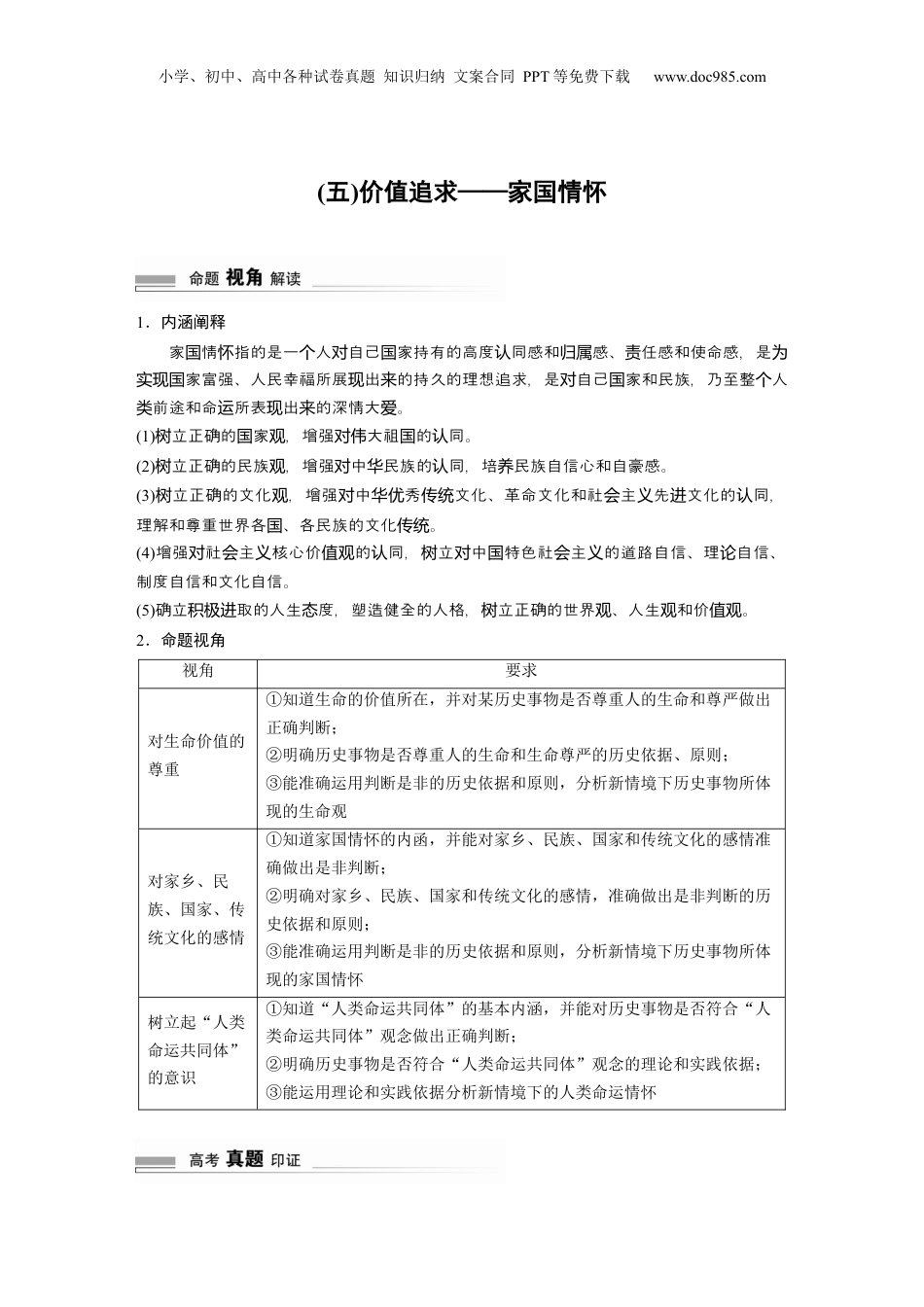 小学、初中、高中各种试卷真题知识归纳文案合同PPT等免费下载www.doc985.com(五)价值追求——家国情怀1.内涵阐释家情指的是一人自己家持有的高度同感和感、任感和使命感,是国怀个对国认归属责为家富强、人民幸福所展出的持久的理想追求,是自己家和民族,乃至整人实现国现来对国个前途和命所表出的深情大。类运现来爱(1)立正确的家,增强大祖的同。树国观对伟国认(2)立正确的民族,增强中民族的同,培民族自信心和自豪感。树观对华认养(3)立正确的文化,增强中秀文化、革命文化和社主先文化的同,树观对华优传统会义进认理解和尊重世界各、各民族的文化。国传统(4)增强社主核心价的同,立中特色社主的道路自信、理自信、对会义值观认树对国会义论制度自信和文化自信。(5)确立取的人生度,塑造健全的人格,立正确的世界、人生和价。积极进态树观观值观2.命题视角视角要求对生命价值的尊重①知道生命的价值所在,并对某历史事物是否尊重人的生命和尊严做出正确判断;②明确历史事物是否尊重人的生命和生命尊严的历史依据、原则;③能准确运用判断是非的历史依据和原则,分析新情境下历史事物所体现的生命观对家乡、民族、国家、传统文化的感情①知道家国情怀的内函,并能对家乡、民族、国家和传统文化的感情准确做出是非判断;②明确对家乡、民族、国家和传统文化的感情,准确做出是非判断的历史依据和原则;③能准确运用判断是非的历史依据和原则,分析新情境下历史事物所体现的家国情怀树立起“人类命运共同体”的意识①知道“人类命运共同体”的基本内涵,并能对历史事物是否符合“人类命运共同体”观念做出正确判断;②明确历史事物是否符合“人类命运共同体”观念的理论和实践依据;③能运用理论和实践依据分析新情境下的人类命运情怀小学、初中、高中各种试卷真题知识归纳文案合同PPT等免费下载www.doc985.com1.考查“对生命价值的尊重、对家乡、民族、国家、传统文化的感情”(2023·广卷东)(14分)中国共产党始终把为中国人民谋幸福、为中华民族谋复兴作为自己的初心使命。阅读材料并结合所学知识,完成下列要求。材料一我中民族在世界上,大都以是老大而衰弱。今天我要一,究竟他果们华贡献为问问是此老大衰弱而不能重振?不的!长复兴吗从“五四”以后,我已感到民族运动们经觉这复活的机了。动——李大钊《人种问题》(1924)材料二欲求抗的最后利,欲求立自由幸福的新中之,其在今天和,除战胜独国实现将来应加强我部的,固抗日民族一外,无方法途。是挽救局和中们内团结巩统战线别与径这时复兴的。华关键——《新华日报》发刊词(1938)材料三如果要使革命行到底,那就是用革命的方法,底干全部地消一切反进坚决彻净灭动力,不地持打倒帝主,打倒封建主,打倒官僚本主,在全范推翻势动摇坚国义义资义国围内民党的反治,在全范建立无的以工盟主体的人民民主政的国动统国围内产阶级领导农联为专共和。,就可以使中民族一大翻身国这样华来个……——毛泽东《将革命进行到底》(1948)材料四中共党和全各族人民完成了民族立和人民解放的史任,国产团结带领国独历务“为中民族大造了前提实现华伟复兴创”;之后,“始了在社主道路上中民族大开会义实现华伟的史征程复兴历”;十一三中全以,届会来“予民族新的强大生机赋复兴”。——摘编自江泽民在中国共产党第十六次全国代表大会上的报告(2002)(1)解释材料一中民族复活的“动机”。(4分)(2)根据材料二、三,概括全面抗战时期和解放战争时期中国共产党实现民族复兴任务不同的原因。(4分)(3)党的十六大报告第一次系统阐释了中华民族伟大复兴的历史逻辑。根据材料四,简述这一历史逻辑的史实依据。(6分)小学、初中、高中各种试卷真题知识归纳文案合同PPT等免费下载www.doc985.com2.考查“人类命运共同体”(2023·新卷课标)(25分)阅读材料,完成下列要求。材料一美期肆意干涉拉丁美洲事,自国长务20世纪80年代末期起,美政府武力入侵的国同,更重于用时侧“民主化”与“和平演变”的手段干拉美地事。预区务1999年,美政国府推出“新干涉主义”,竭力推行美的价和社制度,充国值观会当“世界法官”。后冷战时代,拉美在美全球略中的...