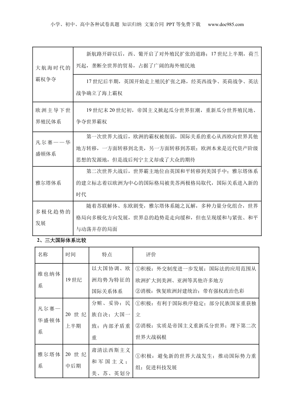 小学、初中、高中各种试卷真题知识归纳文案合同PPT等免费下载www.doc985.com热点话题05时代变局与大国担当【链接热点】2023年大国战略竞争和对抗持续升温、全球安全形势面临着更加复杂紧张的严峻态势。美国在印太地区推出并实施全面围堵中国的“印太战略”,极大地影响了印太地缘格局,佩洛西窜访中国台湾、美国参议院5月16日通过《台湾国际团结法案》在内的掏空“一中”政策行动,实质性改变了中美关系;俄乌冲突持续发酵,欧洲地缘政治重回冷战对抗格局;巴以冲突激化,也门政局动荡外溢效应明显,朝鲜半岛暗流涌动,国际局势稳定和世界和平面临罕见冲击。在这一时代背景下,中国充分展示了负责任大国的作用和魄力,推动沙特和伊朗建交,积极参与巴以冲突调解,建立中国-中亚命运共同,举办中国共产党与世界政党高层对话会,积极推动中美关系朝着竞争但不对抗的方向发展,为世界和平与稳定做出了重要贡献。【链接知识】一、近代以来国际法演变二、近代国际秩序演变1、近代以来欧美主导的资本主义世界体系小学、初中、高中各种试卷真题知识归纳文案合同PPT等免费下载www.doc985.com大航海时代的霸权争夺新航路开辟以后,西、葡开启了对外殖民扩张的道路;17世纪上半期,荷兰兴起,垄断全世界的贸易,占据了广阔的海外殖民地17世纪后半期,英国开始走上殖民扩张之路,经英西战争、英荷战争、英法战争确立了海上霸权欧洲主导下世界殖民体系19世纪末20世纪初,帝国主义掀起瓜分世界狂潮,重新瓜分世界殖民地、争夺世界霸权凡尔赛——华盛顿体系第一次世界大战后,欧洲的霸权被削弱,国际关系的重心从西欧向世界其他地方转移,一方面转移到北美,另一方面转移到苏联;欧洲本来是近代资产阶级思想的发源地,但是战后列宁主义却成了大众的期待雅尔塔体系第二次世界大战后,世界霸主地位由英国和平转移到美国手中;雅尔塔体系的建立标志着以欧洲为中心的国际格局被美苏两极格局取代,国际关系进入新的时代多极化趋势的发展随着苏联解体、东欧剧变,雅尔塔体系随之瓦解,多种力量分化组合,世界格局向多极化方向发展,世界总的趋势是走向缓和,但也呈现缓和与紧张、和平与动荡并存的局面2、三大国际体系比较名称时间特点评价维也纳体系19世纪以大国协调、欧洲均势为特征的国际关系体系①积极:外交制度进一步发展;国际法的应用范围从欧洲扩大到美洲、亚洲等其他许多地方②消极:恢复欧洲封建统治;带有强权政治色彩凡尔赛—华盛顿体系20世纪上半期分赃、妥协;民族自决;大国一致;内部矛盾重重①积极:有利于国际秩序稳定;部分民族国家重获独立②消极:实质是帝国主义重新瓜分世界;埋下第二次世界大战祸根雅尔塔体系20世纪中后期肃清法西斯主义和军国主义;美、苏、英划分①积极:避免新的世界大战发生;推动国际势力重组;促进科技发展小学、初中、高中各种试卷真题知识归纳文案合同PPT等免费下载www.doc985.com势力范围;成立联合国②消极:该体系是大国相互妥协的产物,带有明显的强权政治色彩,严重损害了一些国家的利益3、世界秩序变迁的影响因素①世界政治格局的演变和中心舞台转移的根源在于生产力发展的变化。②世界政治格局变化的主要原因是格局中主角力量的消长以及力量对比的变化。国家力量是决定世界政治格局的一个基本因素,而充当世界政治格局主角的国家力量的平衡是相对的。③世界政治格局变化的直接动因是主要国家对自己国家利益的考虑以及对外政策的调整,在最大限度上保障本国或国家集团的安全利益。④世界政治格局的变化都与主要国家社会制度之间的斗争和改变相联系。三、新中国外交发展历程1、外交总原则:独立自主的和平外交2、发展历程(1)20世纪50年代①政策:50年代初:一边倒、另起炉灶、打扫干净屋子再请客——50年代中:和平共处五项原则②原因:两大阵营对峙,以美国为首的帝国主义国家对华采取政治上不承认、经济上封锁禁运、军事上包围威胁、外交上孤立的政策。③特点:由意识形态外交逐步转向国家利益外交④重点事件:和平共处五项原则、日内瓦会议、万隆会议⑤作用:掀起两次次建交高潮,同社会主义国家、部分西方国家和大量第三世界国家建交,使新...