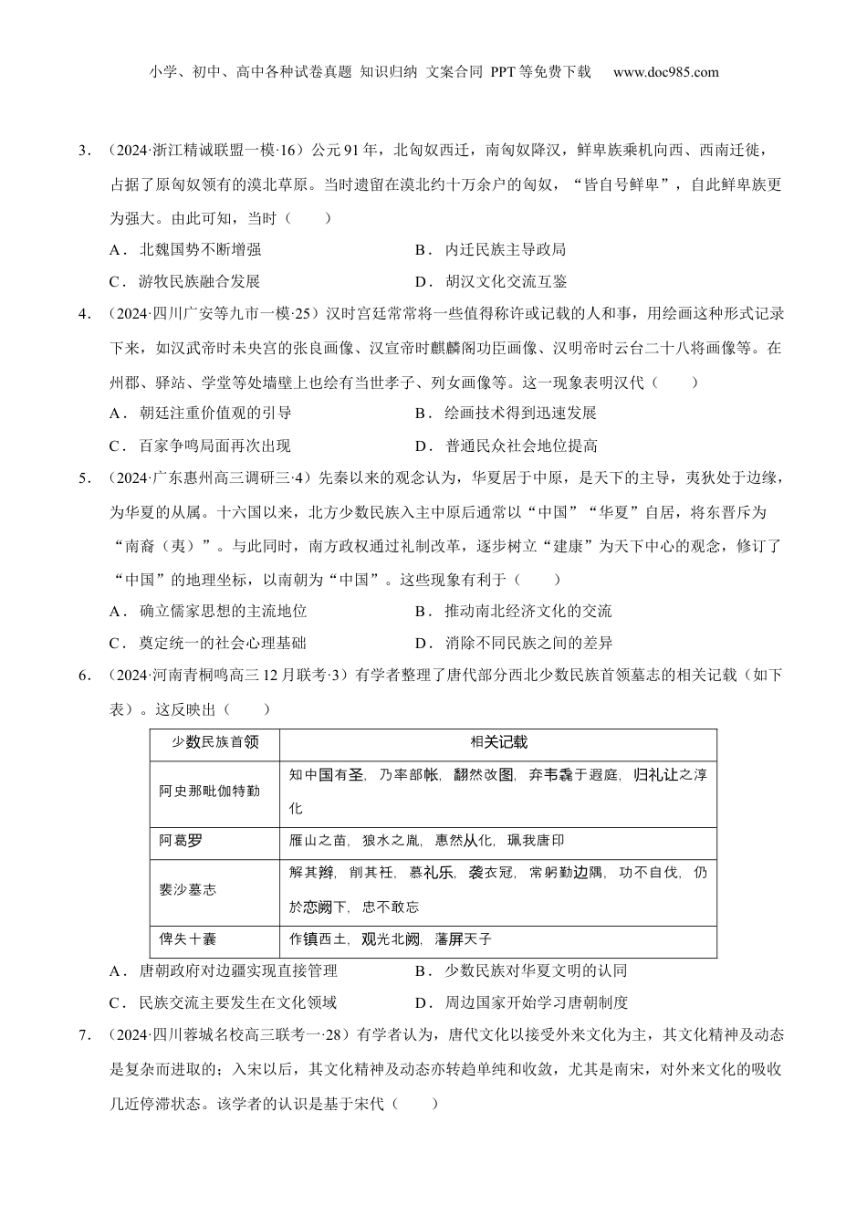 小学、初中、高中各种试卷真题知识归纳文案合同PPT等免费下载www.doc985.com热点话题04家国情怀【链接热点】2017年新一轮课程改革启动以来,家国情怀作为五大核心素养之一被写入了历史课程标准。这既体现了培养学生中华民族的责任感、使命感的要求,也反映了塑造学生积极进取的人生态度的目标,是当下历史教学的关键方向,在高考试题中也是高频出现的命题热点。其中主要值得关注的话题包括:先秦时期中华民族多元一体格局的形成、封建社会家国一体模式的治理特点、近代民族意识的觉醒、现代社会主义建设“四个自信”认知。【链接知识】【限时检测】(建议用时:45分钟)1.(2024·新高考七省联考·2)《管子·小匡》中有“东夷、西戎、南蛮、北狄、中国诸侯”并举的记述,并认为华夏(“中国”)居中,为五方的核心,“五方之民”共“天下”的观念升华。这一记述反映出()A.百家争鸣的盛况B.传统秩序遭到破坏C.华夏认同的增强D.社会矛盾不断激化2.(2024·辽宁高三12月联考·1)《国语·鲁语上》记载,夏、商、周王族祭祀的时候,不仅祭祀本族的先王先公,而且将本族来源与黄帝族系联系起来,自认是黄帝族系的后裔。这些记载()A.说明祭祀活动为王权所轻视B.为政治活动染了神权色彩C.利于论证华夏文明的延续性D.源于宗法制度对血缘的强调小学、初中、高中各种试卷真题知识归纳文案合同PPT等免费下载www.doc985.com3.(2024·浙江精诚联盟一模·16)公元91年,北匈奴西迁,南匈奴降汉,鲜卑族乘机向西、西南迁徙,占据了原匈奴领有的漠北草原。当时遗留在漠北约十万余户的匈奴,“皆自号鲜卑”,自此鲜卑族更为强大。由此可知,当时()A.北魏国势不断增强B.内迁民族主导政局C.游牧民族融合发展D.胡汉文化交流互鉴4.(2024·四川广安等九市一模·25)汉时宫廷常常将一些值得称许或记载的人和事,用绘画这种形式记录下来,如汉武帝时未央宫的张良画像、汉宣帝时麒麟阁功臣画像、汉明帝时云台二十八将画像等。在州郡、驿站、学堂等处墙壁上也绘有当世孝子、列女画像等。这一现象表明汉代()A.朝廷注重价值观的引导B.绘画技术得到迅速发展C.百家争鸣局面再次出现D.普通民众社会地位提高5.(2024·广东惠州高三调研三·4)先秦以来的观念认为,华夏居于中原,是天下的主导,夷狄处于边缘,为华夏的从属。十六国以来,北方少数民族入主中原后通常以“中国”“华夏”自居,将东晋斥为“南裔(夷)”。与此同时,南方政权通过礼制改革,逐步树立“建康”为天下中心的观念,修订了“中国”的地理坐标,以南朝为“中国”。这些现象有利于()A.确立儒家思想的主流地位B.推动南北经济文化的交流C.奠定统一的社会心理基础D.消除不同民族之间的差异6.(2024·河南青桐鸣高三12月联考·3)有学者整理了唐代部分西北少数民族首领墓志的相关记载(如下表)。这反映出()少民族首数领相关记载阿史那毗伽特勤知中有,乃率部,翻然改,弃毳于遐庭,之淳国圣帐图韦归礼让化阿葛罗雁山之苗,狼水之胤,惠然化,珮我唐印从裴沙墓志解其,削其衽,慕,衣冠,常躬勤隅,功不自伐,仍辫礼乐袭边於下,忠不敢忘恋阙俾失十囊作西土,光北,藩天子镇观阙屏A.唐朝政府对边疆实现直接管理B.少数民族对华夏文明的认同C.民族交流主要发生在文化领域D.周边国家开始学习唐朝制度7.(2024·四川蓉城名校高三联考一·28)有学者认为,唐代文化以接受外来文化为主,其文化精神及动态是复杂而进取的;入宋以后,其文化精神及动态亦转趋单纯和收敛,尤其是南宋,对外来文化的吸收几近停滞状态。该学者的认识是基于宋代()小学、初中、高中各种试卷真题知识归纳文案合同PPT等免费下载www.doc985.comA.对外交往几近停滞B.理学强化了民族本位C.科举制度逐渐僵化D.固守传统的华夷观念8.(2024·甘肃一模·4)宋初,统治者对民间印刷出版书籍采取了相对宽松的政策。但自1090年开始,朝廷就不断颁布政策,要求民间书籍刊印必须遵守规矩,不得私自刻印、传播议论时政和边疆军事的会要、实录等。此举主要目的是()A.加强思想专制B.促进国家统一C.配合变法运动D.维护国家安全9.(202...