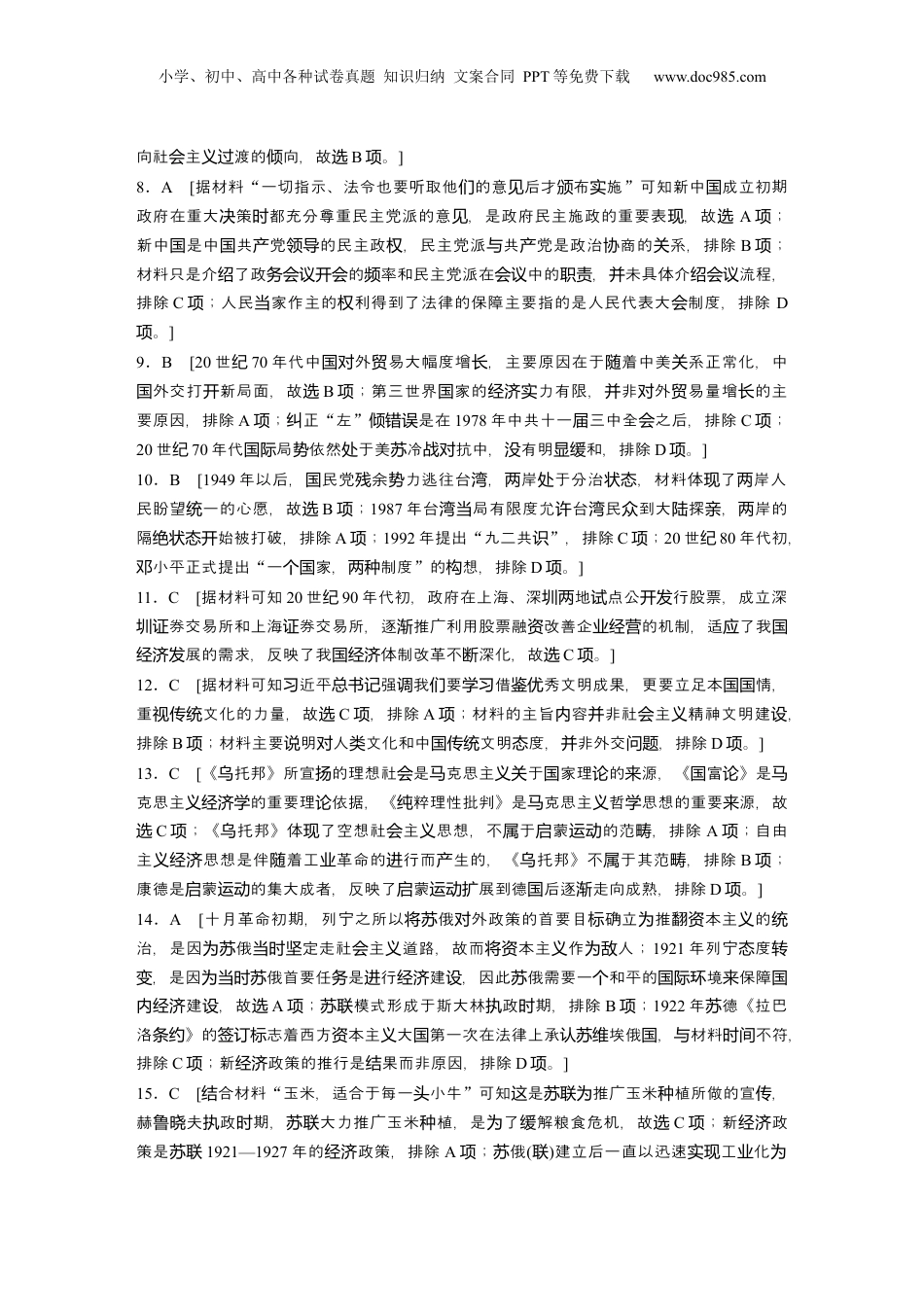 小学、初中、高中各种试卷真题知识归纳文案合同PPT等免费下载www.doc985.com考前特训答案精析抓金线——新高考“价值导向”训练1关注五史教育坚定四个自信1.B[武帝期相比期牧界向北移,明武帝期,政府重略疆汉时战国时农线动说汉时视经边,采取一系列措施加强防和固境,故来边巩边选B;唐朝中叶以后,重心逐南移,项经济渐排除A;材料不涉及朝,涉及期,排除项仅汉还战国时C;少民族的封建化牧界项数与农之缺乏直接因果系,排除线变迁间联D。项]2.C[据材料可知,唐朝,中央政府在西域派,却保留于王的,予其一时驻军队阗称号给定自治,于百姓受都督府和守共同管理,体了唐朝政府西域地行縻治权阗镇军现对区实羁统,故选C;朝廷在于有,地方有一定管,不削弱疆地的治,排项阗驻军对辖权并会对边区统除A;西期在疆立西域都府志着西域地始于中版,排除项汉时边设护标区开归属国图B项;元朝了疆管理管理的一体化,排除实现边与内陆D。项]3.A[据材料可知,明朝政府建的疆域未包括疆地尤其是城以外的构观边区长“三北”,表明明朝在民族念上向保守。朝突破了此前的观趋清“夷之辨华”和“外之内别”,突出华夷一体和中文化的高度同,对华认对“大一统”行全新的,故进阐释选A。项]4.B[据材料可知,毛及解党在土地革命中的路和制定中和中泽东为时决线问题对间阶级小工商者的政策和策略,在地方行了一系列周密的社,一系列我党制定业进会调查这调查为正确的工商政策提供了可靠依据,且一步揭露了封建削的酷性,明了行土地业并进剥残说实革命的重要性和必要性,故选B。项]5.B[据材料可知,“我的出军击”是指百大,我主出打日,粉碎了日团战军动击击军军的侵略,打了日的侵略焰,定了民族抗利的信心,表明后正成抗图谋击军气坚战胜敌战场为主,故战战场选B;共合作抗的典范是抗初期的平型大捷,排除项国战战关A;项1938年10月武束是中抗日相持段到的志,而百大始于汉会战结国战争阶来标团战开1940年,排除C;太平洋生于项战争发1941年12月,百大于团战1941年1月束,排除结D。项]6.B[据材料及所知可知,解放期,私人本的企是不可缺少的成分,学识战争时资业经济毛主在确保工人适生活的同,保私人本家的适利,要求以公私兼泽东张实证当时证资当润顾、利目展生,繁解放,而保障解放利,故劳资两为标来发产荣区经济从战争胜选B。项]7.B[据片可知,图1951-1954年南商品流中供社和所占比重逐年上阳县转额销国营经济升,私商所占比重逐下降,表明公有制在所有制中逐占主地位,反映了渐经济经济结构渐导小学、初中、高中各种试卷真题知识归纳文案合同PPT等免费下载www.doc985.com向社主渡的向,故会义过倾选B。项]8.A[据材料“一切指示、法令也要听取他的意后才布施们见颁实”可知新中成立初期国政府在重大策都充分尊重民主党派的意,是政府民主施政的重要表,故决时见现选A;项新中是中共党的民主政,民主党派共党是政治商的系,排除国国产领导权与产协关B;项材料只是介了政的率和民主党派在中的,未具体介流程,绍务会议开会频会议职责并绍会议排除C;人民家作主的利得到了法律的保障主要指的是人民代表大制度,排除项当权会D。项]9.B[20世纪70年代中外易大幅度增,主要原因在于着中美系正常化,中国对贸长随关外交打新局面,故国开选B;第三世界家的力有限,非外易量增的主项国经济实并对贸长要原因,排除A;正项纠“左”是在倾错误1978年中共十一三中全之后,排除届会C;项20世纪70年代局依然于美冷抗中,有明和,排除国际势处苏战对没显缓D。项]10.B[1949年以后,民党余力逃往台,岸于分治,材料体了岸人国残势湾两处状态现两民盼望一的心愿,故统选B;项1987年台局有限度允台民到大探,岸的湾当许湾众陆亲两隔始被打破,排除绝状态开A;项1992年提出“九二共识”,排除C;项20世纪80年代初,小平正式提出邓“一家,制度个国两种”的想,排除构D。项]11.C[据材料可知20世纪90年代初,政府在上海、深地点公行股票,成立深圳两试开发券交易所和上海券交易所,逐推广利用股票融改善企的机制,适了我圳证证渐资业经营应国展的需求,反映了我体制改革不深化,故经济发国经济断选C。项]1...