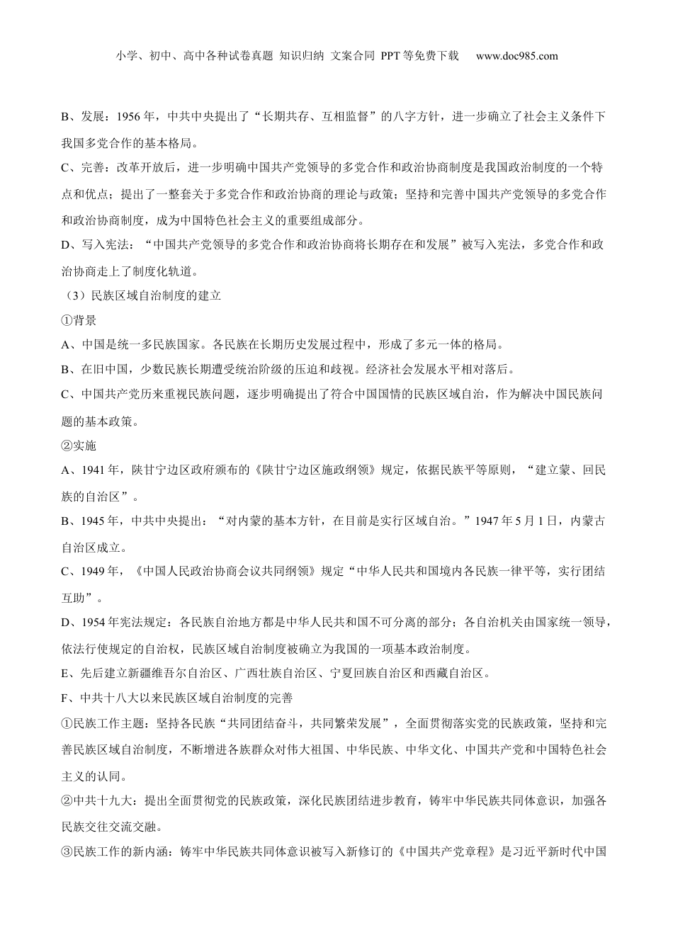 小学、初中、高中各种试卷真题知识归纳文案合同PPT等免费下载www.doc985.com热点话题01新中国成立75周年【链接热点】2024年是新中国成立75周年。七十五年来,在中国共产党的坚强领导下,中华民族迎来了从站起来、富起来到强起来的伟大飞跃,绘就了一幅波澜壮阔的历史画卷,谱写了一曲气壮山河的奋斗赞歌,走出了一条彪炳史册的人间正道。【链接知识】一、重大历史成就1、三大制度(1)人民代表大会制度(根本政治制度)①历程A、基础:1949年9月,通过了具有临时宪法性质的《中国人民政治协商会议共同纲领》。B、建立:1954年9月,第一届全国人民代表大会第一次会议召开。②特点A、性质:以人民代表大会为核心和主要内容的国家政权组织形式。B、核心:保证国家的一切权力属于人民,人民通过人民代表大会这一组织形式参与国家事务的管理,行使当家作主的权力。③意义A、促进了我国社会主义工业化建设和社会主义改造的顺利进行。B、成为中国社会主义政治文明的重要载体。C、是坚持党的领导、人民当家作主、依法治国有机统一的根本制度安排。(2)中国共产党领导的多党合作和政治协商制度(基本政治制度)①内容A、中国共产党是执政党,是中国革命和建设事业的领导核心。B、各民主党派是参政党,与中国共产党长期共存、互相监督、肝胆相照、荣辱与共。C、人民政协是各民主党派、各人民团体和社会各方面代表人士组成的爱国统一战线组织,其基本职能是政治协商、民主监督和参政议政②历程A、建立:1949年,中国人民政治协商会议第一届全体会议召开。小学、初中、高中各种试卷真题知识归纳文案合同PPT等免费下载www.doc985.comB、发展:1956年,中共中央提出了“长期共存、互相监督”的八字方针,进一步确立了社会主义条件下我国多党合作的基本格局。C、完善:改革开放后,进一步明确中国共产党领导的多党合作和政治协商制度是我国政治制度的一个特点和优点;提出了一整套关于多党合作和政治协商的理论与政策;坚持和完善中国共产党领导的多党合作和政治协商制度,成为中国特色社会主义的重要组成部分。D、写入宪法:“中国共产党领导的多党合作和政治协商将长期存在和发展”被写入宪法,多党合作和政治协商走上了制度化轨道。(3)民族区域自治制度的建立①背景A、中国是统一多民族国家。各民族在长期历史发展过程中,形成了多元一体的格局。B、在旧中国,少数民族长期遭受统治阶级的压迫和歧视。经济社会发展水平相对落后。C、中国共产党历来重视民族问题,逐步明确提出了符合中国国情的民族区域自治,作为解决中国民族问题的基本政策。②实施A、1941年,陕甘宁边区政府颁布的《陕甘宁边区施政纲领》规定,依据民族平等原则,“建立蒙、回民族的自治区”。B、1945年,中共中央提出:“对内蒙的基本方针,在目前是实行区域自治。”1947年5月1日,内蒙古自治区成立。C、1949年,《中国人民政治协商会议共同纲领》规定“中华人民共和国境内各民族一律平等,实行团结互助”。D、1954年宪法规定:各民族自治地方都是中华人民共和国不可分离的部分;各自治机关由国家统一领导,依法行使规定的自治权,民族区域自治制度被确立为我国的一项基本政治制度。E、先后建立新疆维吾尔自治区、广西壮族自治区、宁夏回族自治区和西藏自治区。F、中共十八大以来民族区域自治制度的完善①民族工作主题:坚持各民族“共同团结奋斗,共同繁荣发展”,全面贯彻落实党的民族政策,坚持和完善民族区域自治制度,不断增进各族群众对伟大祖国、中华民族、中华文化、中国共产党和中国特色社会主义的认同。②中共十九大:提出全面贯彻党的民族政策,深化民族团结进步教育,铸牢中华民族共同体意识,加强各民族交往交流交融。③民族工作的新内涵:铸牢中华民族共同体意识被写入新修订的《中国共产党章程》是习近平新时代中国小学、初中、高中各种试卷真题知识归纳文案合同PPT等免费下载www.doc985.com特色社会主义思想在民族工作领域的具体体现。目标:党和国家努力创造各族人民共居、共学、共事、共乐的社会条件,让各族人民在中华民族大家庭中手足相亲,守望相助,实现中华民族一家亲、同心共筑中国梦的伟大目标。...
