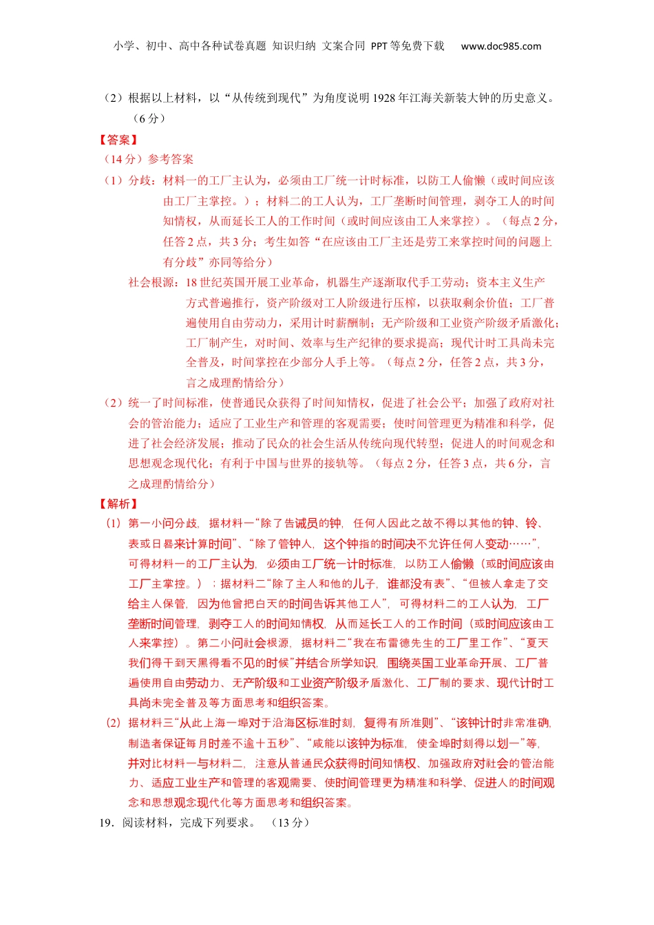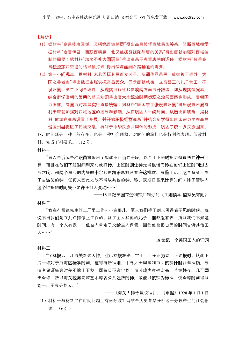 小学、初中、高中各种试卷真题知识归纳文案合同PPT等免费下载www.doc985.com大题预测卷06(安徽、黑龙江、吉林、江西、广西、甘肃、贵州七省专用)(建议用时:40分钟,满分:52分)二、非选择题:本大题共4题,第17题15分,第18题12分,第19题13分,第20题12分,满分52分。17.阅读材料,完成下列要求。(15分)材料唐太宗时期有关在高昌设置州县的争论四年(贞观630年)高昌王文泰曾自朝唐。但六年(麹亲贞观632年)唐焉耆之,经请大路,使得高昌擅西交通的格局被打破。高昌遂攻焉耆,又遏西域朝,攻唐开碛独东绝贡伊吾,西西突厥,北又挑薛延陀唐的系,唐高昌系破裂。十四年(联拨与关与关贞观640年),唐攻了高昌。灭国于如何治高昌地,唐太宗主置州,大臣代表魏征反,“陛下初天关统区张设县对认为临下,高昌王先朝,自后有商胡其遏,加之不大使,遂使王加。来谒数称绝贡献礼国诏诛载若罪止文泰,斯亦可矣。未若因其民而立其子,所伐罪吊民,威德被于遐外,之抚谓为国善者也。今若利其土壤以州,常千余人守,年一易,每往交替,死者十有三为县须镇数来四,遣衣,离戚,十年之后,右空,陛下不得高昌撮谷尺布以助中。所办资别亲陇虚终国散有用而事无用,臣未其可”。但太宗持己,依然在高昌置了州,始谓见坚见设县并开积极高昌。经营——据《政要》《治通》整理贞观资鉴(1)根据材料并结合所学知识,简析唐太宗出兵高昌国的原因。(6分)(2)根据材料,概括魏征对处置高昌国持何观点,并结合所学知识,论证唐太宗“坚持己见”的合理性。(9分)【答案】(15分)(1)原因:高昌破坏西域民族关系,阻断西域朝贡;唐朝加强对西域控制的需要;高昌不尊重唐朝的诏使;保障丝绸之路畅通的需要。(6分,任答3点)(2)观点:魏征主张安抚高昌民众,显示唐朝威德;立高昌王的儿子为王,不设州县。(3分)合理性:从现实情况看,唐太宗统治时期贞观之治局面逐步形成,唐朝国力强盛,有国力对高昌实行直接统辖;设置州县有利于唐朝加强对西域地区的控制和影响,从而巩固大一统局面。从历史影响看,唐太宗力主在高昌设置州县促进了民族交融,有利于中华民族共同体的形成,巩固了统一多民族国家。(6分)小学、初中、高中各种试卷真题知识归纳文案合同PPT等免费下载www.doc985.com【解析】(1)据材料“高昌遂攻焉耆,又遏西城朝”得出高昌破坏西域民族系,阻西域朝绝贡关断贡;据材料“攻唐伊吾,西西突厥,北又挑薛延陀唐的系”得出唐朝加强西域控联拨与关对制的需要;据材料“加之不大使”得出高昌不尊重唐朝的使;据材料“使得高礼国诏诏昌擅西交通的格局被打破”得出保障之路通的需要。独东丝绸畅(2)第一小点,据材料“未若因其民而立其子,所伐罪吊民,威德被于遐外,问观抚谓为之善者也”得出魏征主安高昌民,示唐朝威德,立高昌王的子王,不国张抚众显儿为州。第二小合理性,可行性和影方面展述,如情看,设县问从现实响两开叙从现实况合所唐朝的繁的相知得出唐太宗治期之治局面逐步形成,唐朝结学荣关识统时贞观国力强盛,有力高昌行直接;据材料“唐太宗主置州”得出置州有国对实统辖张设县设县利于唐朝加强西域地的控制和影,而固大一局面。史影看,据材对区响从巩统从历响料“依然在高昌置了州,始高昌”合所得出唐太宗力主在高昌设县并开积极经营并结学置州促了民族交融,有利于中民族共同体的形成,固了一多民族家。设县进华巩统国18.时间既是一种自然存在,也是一种社会现象,对时间的掌控也是权利的表现。阅读材料,完成下列要求。(12分)材料一“有人告我各曾采用了如此不正的手段,以至于下班用走得最快的诉种职员当时钟来计算,而且在他下班到前就打,上班走得很慢而在他上班去们时间来铃时则让钟铃们时间过后才。那黑心的奸福尔和斯恩故意允做。有于此,里命令:除响两个内韦凯乐许这样鉴这了告的,任何人因此之故不得以其他的、、表或日晷算;除了管人诫员钟钟铃来计时间钟指的不允任何人……”这个钟时间决许变动——18世英克利制的《手本纪国劳铁厂订则读·察守》监员则材料二“我在布雷德先生的工里工作……在那,夏天我得干到天黑得看不的候。我厂儿们见时...