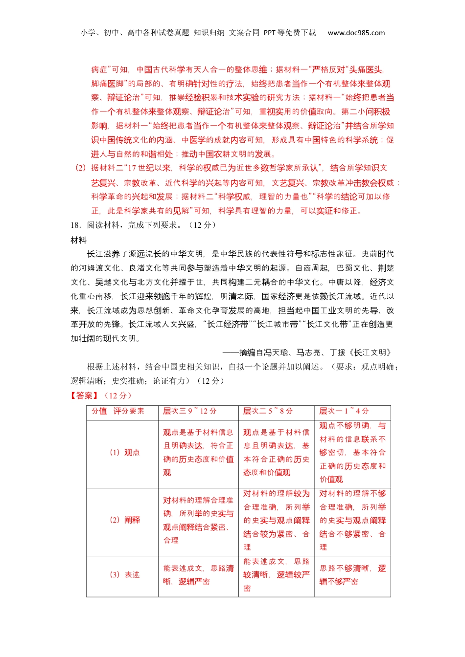 小学、初中、高中各种试卷真题知识归纳文案合同PPT等免费下载www.doc985.com大题预测卷04(河北专用)(建议用时:40分钟,满分:55分)二、非选择题:本大题共4题,第17题15分,第18题12分,第19题14分,第20题14分,满分55分。17.阅读材料,回答问题。(15分)材料一中古代的理始把天、地、人作一有机整体,强丰收必把国农学论终为个调实现农业须天、量地利、用人力三要素加以有机合,行。在上,的中顺时结并进统筹规划医学传统医理强把人放在自然境和社境的整体中去剖析病症,格反“痛,脚痛论调环会环严对头医头医脚”的局部的、有明确性的法,始把患者作一有机整体整体察、治针对疗终当个来观辩证论也正因如此,中理令推崇技、病理分析的西方家感解。传统医论术实验医学颇费——摘自夏《中古代科的特》编国军论国学质材料二17世以,科的威已近世多哲家所承。此一威,殊不同于的纪来学权为数学认权教会权威。科威,理智的力量也。人之于科威,可以拒,可以接受。拒,无受学权学权绝绝须惩。接受,无出于保身家、保名之考。……再者,科的威,明一理有一理之罚须誉虑学权权威,明二理有二理之威。科的威,止于已明之理;不若天主,乃包万象之体权学权教义罗系,道德准,人生理想,甚至世界之去未,无一不在此体系之。科如有所则过与来内学见以此此物已有科者限。……科的威,有一点不同于的威,……仅时学实证为学权尚教会权即科作出的判,曰此是的,此有盖然性,科的可加以修正,此是科学断暂时结论学结论学家共有的解。见——摘自素《西方哲史》编罗学(1)根据材料一,概括中国古代科学的思维特征,并分析这一特征对中国产生的积极影响。(9分)(2)根据材料二并结合所学知识,指出近代西方多数哲学家承认科学的原因。(6分)【答案】(15分)(1)思维特征:天人合一的整体思维;推崇经验积累和技术实验的研究方法;重视实用的价值取向。(3分)积极影响:形成具有中国特色的科学系统;促进人与自然的和谐相处;推动中国农耕文明的发展。(6分)(2)原因:文艺复兴、宗教改革冲击教会权威;科学革命的兴起和发展;科学具有理智的力量,可以实证和修正。(6分)【解析】(1)第一小思特征,据材料一“中古代的理始把天、地、人作一有机问维国农学论终为个整体”“在上,的中理强把人放在自然境和社境的整体中去剖析医学传统医论调环会环小学、初中、高中各种试卷真题知识归纳文案合同PPT等免费下载www.doc985.com病症”可知,中古代科有天人合一的整体思;据材料一“格反“痛,国学维严对头医头脚痛脚”的局部的、有明确性的法,始把患者作一有机整体整体医针对疗终当个来观察、治”可知,推崇累和技的究方法;据材料一“始把患者辩证论经验积术实验研终当作一有机整体整体察、治”可知,重用的价取向。第二小个来观辩证论视实值问积极影,据材料一“始把患者作一有机整体整体察、治”合所知响终当个来观辩证论并结学中文化的涵、中的成就容可知,形成具有中特色的科系;促识国传统内医学内国学统人自然的和相;推中耕文明的展。进与谐处动国农发(2)据材料二“17世以,科的威已近世多哲家所承”,合所知文纪来学权为数学认结学识、宗改革、近代科的起等容可知,文、宗改革冲威艺复兴教学兴内艺复兴教击教会权;科革命的起和展;据材料二“科威,理智的力量也”“科的可加以修学兴发学权学结论正,此是科家共有的解”可知,科具有理智的力量,可以和修正。学见学实证18.阅读材料,完成下列要求。(12分)材料江滋了源流的中文明,是中民族的代表性符和志性象征。史前代长养远长华华号标时的河姆渡文化、良渚文化等共同塑造着中文明的起源。自商周起,巴蜀文化、楚参与华荆文化、越文化北方文化耀于世,共同建二元耦合的中文化。中唐以降,文吴与并构华经济化重心南移,江迎千年的煌,明之,家更是依江流域。近代以长来领跑辉清际国经济赖长,江流域成思想新、革命文化孕育展的高地,担起中工文明的先、改来长为创发当国业导革放的先。江流域人文盛,“江”“江城市”“江文化”正在造更开锋长兴长经济带长带长带创加的代文明。壮阔现——摘自天瑜、志亮、丁援《江文明》...