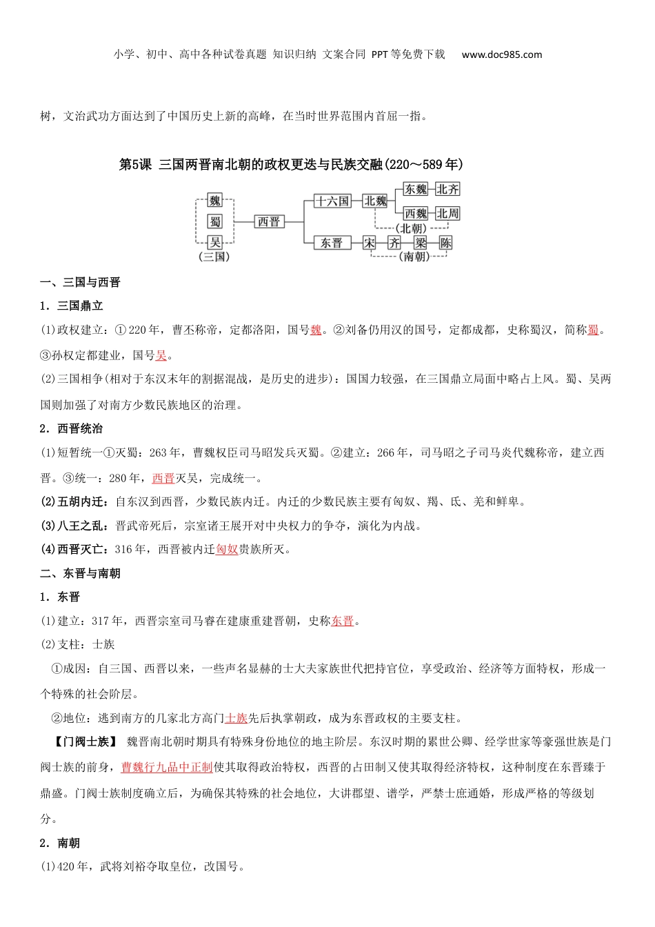 小学、初中、高中各种试卷真题知识归纳文案合同PPT等免费下载www.doc985.com【背记手册】高中历史全册最新核心知识必背清单(中外历史纲要上、下册)02三国两晋南北朝的民族交融与隋唐统一多民族封建国家的发展【课程标准】1.了解三国两晋南北朝时期政权更迭的历史脉络、民族交融、制度创新和区域开发。2.了解隋唐时期封建社会的高度繁荣,认识隋唐时期的民族交融与区域开发的新成就。3.认识三国两晋南北朝至隋唐时期的制度变化与创新。4.认识三国两晋南北朝至隋唐时期思想文化领域的新成就。【时空坐标】【总体特征】1.分裂统一:除西晋外,三国两晋南北朝时期,中国几乎都处于分裂状态;隋唐王朝结束了分裂割据,开创了封建大一统的盛世局面;五代十国时期,中国再度陷于分裂割据时期。2.民族交融:三国两晋南北朝时期,中国掀起了民族交融的高潮,期间,北魏孝文帝改革顺应了北方民族交融的历史趋势;隋唐王朝的民族政策比较开明,进一步推动了统一多民族封建国家的发展。3.创新发展:从三国至唐朝,封建专制主义中央集权的制度、逐渐演进,不断创新,颇有建树,如三省六部制、科举制等。4.重心南移:北方战乱不断,促使人口南迁,江南地区得到进一步开发,为经济重心的南移提供了条件,南北经济趋向平衡。5.三教合流:魏晋时期,佛教、道教盛行,冲击了儒学的正统地位,同时,儒、释、道三教相互融合吸收,促进了中国古代思想文化的进一步发展。6.历史高峰:隋唐时期,国力强盛,疆域开拓,经济繁荣,民族往来和对外交往活跃,制度上也有重要建小学、初中、高中各种试卷真题知识归纳文案合同PPT等免费下载www.doc985.com树,文治武功方面达到了中国历史上新的高峰,在当时世界范围内首屈一指。第5课三国两晋南北朝的政权更迭与民族交融(220~589年)一、三国与西晋1.三国鼎立(1)政权建立:①220年,曹丕称帝,定都洛阳,国号魏。②刘备仍用汉的国号,定都成都,史称蜀汉,简称蜀。③孙权定都建业,国号吴。(2)三国相争(相对于东汉末年的割据混战,是历史的进步):国国力较强,在三国鼎立局面中略占上风。蜀、吴两国则加强了对南方少数民族地区的治理。2.西晋统治(1)短暂统一①灭蜀:263年,曹魏权臣司马昭发兵灭蜀。②建立:266年,司马昭之子司马炎代魏称帝,建立西晋。③统一:280年,西晋灭吴,完成统一。(2)五胡内迁:自东汉到西晋,少数民族内迁。内迁的少数民族主要有匈奴、羯、氐、羌和鲜卑。(3)八王之乱:晋武帝死后,宗室诸王展开对中央权力的争夺,演化为内战。(4)西晋灭亡:316年,西晋被内迁匈奴贵族所灭。二、东晋与南朝1.东晋(1)建立:317年,西晋宗室司马睿在建康重建晋朝,史称东晋。(2)支柱:士族①成因:自三国、西晋以来,一些声名显赫的士大夫家族世代把持官位,享受政治、经济等方面特权,形成一个特殊的社会阶层。②地位:逃到南方的几家北方高门士族先后执掌朝政,成为东晋政权的主要支柱。【门阀士族】魏晋南北朝时期具有特殊身份地位的地主阶层。东汉时期的累世公卿、经学世家等豪强世族是门阀士族的前身,曹魏行九品中正制使其取得政治特权,西晋的占田制又使其取得经济特权,这种制度在东晋臻于鼎盛。门阀士族制度确立后,为确保其特殊的社会地位,大讲郡望、谱学,严禁士庶通婚,形成严格的等级划分。2.南朝(1)420年,武将刘裕夺取皇位,改国号。小学、初中、高中各种试卷真题知识归纳文案合同PPT等免费下载www.doc985.com(2)此后170年间,南方先后经历了宋、齐、梁、陈四个王朝,合称“南朝”。(3)四个王朝均定都建康,加上先前在此定都的吴和东晋,又统称为六朝。3.江南开发(1)原因:①劳动力与技术因素:北方人口南迁,带去了充足的劳动力和先进的生产技术②自然环境:江南地区雨量充沛,气候温润,土地肥沃,具有发展农业的优越条件③社会环境:江南地区战争相对较少,社会秩序比较安定(2)影响:促进了江南地区的开发,为经济重心南移奠定了基础;促进了民族交融;加强了南北经济联系。4.疆域变迁(1)东晋南朝之交:一度将势力范围扩展到黄河南岸附近,但随后在军事上渐处下风,又退回到淮水一线。(2)陈朝:只能保有长江以南,上...