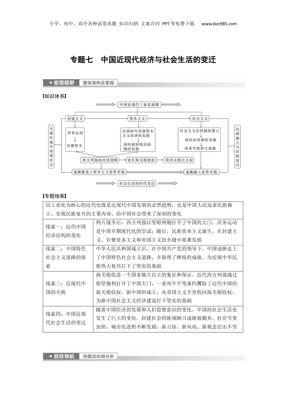 小学、初中、高中各种试卷真题知识归纳文案合同PPT等免费下载www.doc985.com专题七中国近现代经济与社会生活的变迁知识体系专题线索以工业化为核心的近代化既是近现代中国发展的必然趋势,也是中国人民追求民族独立、实现民族复兴的主要内容,给中国社会带来了深刻的变化线索一:近代中国经济结构的变化鸦片战争后,西方列强以坚船利炮打开了中国的大门。洋务运动是中国早期现代化的尝试;随后,民族资本主义诞生,在封建主义、官僚资本主义和帝国主义的夹缝中艰难发展线索二:中国特色社会主义道路的探索中华人民共和国成立后,在中国共产党的领导下,中国逐渐走上了中国特色社会主义道路,并取得了辉煌的成就,为实现中华民族伟大复兴打下了坚实的基础线索三:近现代中国的关税海关税收是一个国家独立自主的象征和保证。近代西方列强通过船坚炮利打开了中国大门,一系列不平等条约攫取了近代中国的海关税收权。新中国的成立,从帝国主义手里收回海关税收权,为新中国社会主义经济建设打下坚实的基础线索四:中国近现代社会生活的变迁随着中国经济的发展和人们思想意识的变化,中国的社会生活也发生了巨大的变化。封建社会的陈规陋习逐渐被抛弃,社会节奏加快,城市化进程不断发展,新习俗、新风尚、新观念层出不穷小学、初中、高中各种试卷真题知识归纳文案合同PPT等免费下载www.doc985.com情境设计通过生活情境考查近现代物质生活的变迁;通过学术情境和生活情境考查影响近代中国经济结构变动的原因,“一五”计划的实施及经济体制改革的深化发展核心考点洋务企业;近代民族经济的发展;国民政府时期的经济;“一五”计划的实施;新时期的经济体制改革;近现代生活的变迁价值导向关注民族经济;敢为天下先;道路自信;制度自信备考方向从唯物史观和家国情怀的角度认识影响中国民族工业发展的因素及启示;从历史理解和历史解释的角度认识近代中国经济转型、南京国民政府时期的经济政策、新中国成立初期对苏联模式的借鉴与创新以及新中国成立后不同时期社会经济结构的变动考向一近代中国经济的调适与转型及海关税收权价值引领厚植爱国主义——以数据统计图看中国海关税征收额变化(2021·山卷,东7)1913—1921年,中国海关税征收额受国际局势影响出现了一定变化。下列各项反映这一时期变化状况的是()解读知识1914年第一次世界大爆以后,世界易陷入停,但中外易战发贸暂时顿国对贸小学、初中、高中各种试卷真题知识归纳文案合同PPT等免费下载www.doc985.com基为即以出口的快速增加和口的慢恢特点,易逆差大小。随进缓复为贸为缩当战争因素消退后,列强中的侵略卷土重,海收大幅增对国经济来关税额长能力重为一期列强忙于大,少了中的商品出,所以此海征收战间战减对国输时关税额总体下降,一之后列强卷土重,海征收又大幅提高。空念和唯战来关税额从时观物史角度考中海征收的化观查国关税额变素养向导史料的角度了解近代中海收的化;史解的角度从实证国关税变状况从历释认识中海征收化的原因;家情的角度厚植主情国关税额变从国怀爱国义怀答案A1.历史理解——近代中国经济转型经济形态的转变中国近代经济具有明显的半殖民地半封建性质,经济发展不平衡,特别是在广大内陆城乡,自然经济仍然占统治地位市场观念和意识的变化在洋务运动等推动下,一批近代化的航运、纺织、矿冶等企业出现,向生产领域的机械化和交通领域的现代化迈进;对外贸易呈转好趋势,“商战”初具成效经济政策的变化商业思想由“重农抑商”到“振兴商业”“通商惠工”,变“抑商”为“恤商”,发展资本主义经济商品结构的变化由农副产品和手工业品占主导到市场商品种类大增,洋货和机制品充斥市场,形成以进出口商品为主导、土货洋货并存、生产原料和消费品并重的商品结构。市场流通商品呈现多元化的趋势商人主体的多元化鸦片战争前,商人以官商、私商为主。鸦片战争以后,洋行、买办兴起,民族资本主义商业的产生与发展,成为市场上的主导力量社会阶层结构的变化中国民族资产阶级产生,部分传统知识分子弃儒从商,投身实业2.唯物史观——影响中国民族工业发展的因素及启示小学、初中、高中各种试卷真题知识归...