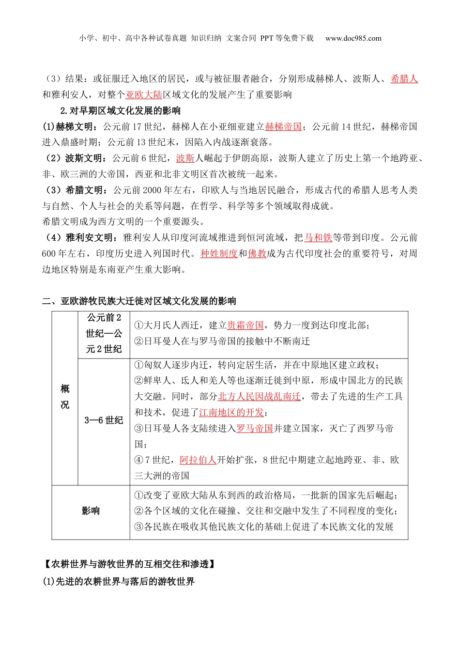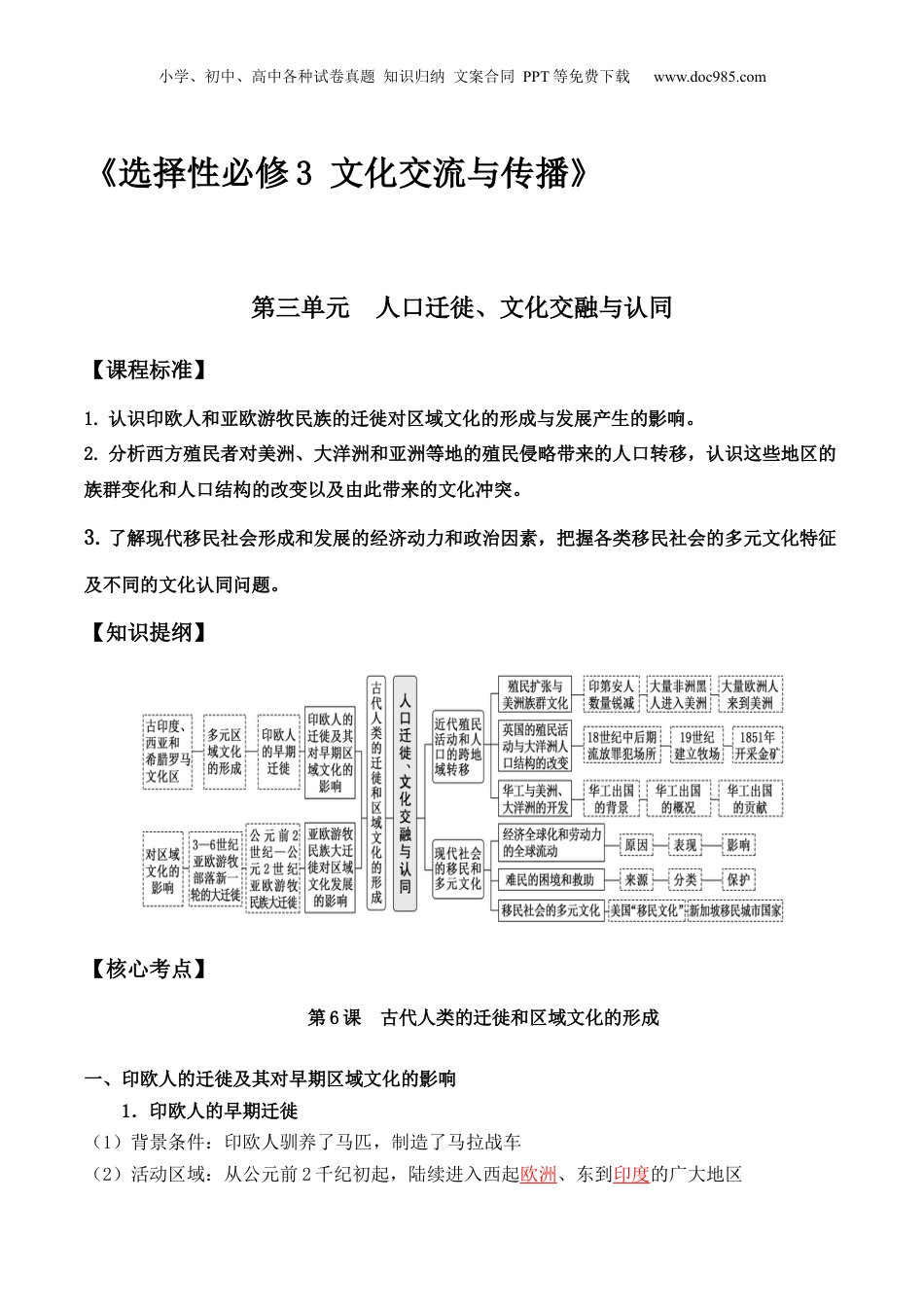 小学、初中、高中各种试卷真题知识归纳文案合同PPT等免费下载www.doc985.com《选择性必修3文化交流与传播》第三单元人口迁徙、文化交融与认同【课程标准】1.认识印欧人和亚欧游牧民族的迁徙对区域文化的形成与发展产生的影响。2.分析西方殖民者对美洲、大洋洲和亚洲等地的殖民侵略带来的人口转移,认识这些地区的族群变化和人口结构的改变以及由此带来的文化冲突。3.了解现代移民社会形成和发展的经济动力和政治因素,把握各类移民社会的多元文化特征及不同的文化认同问题。【知识提纲】【核心考点】第6课古代人类的迁徙和区域文化的形成一、印欧人的迁徙及其对早期区域文化的影响1.印欧人的早期迁徙(1)背景条件:印欧人驯养了马匹,制造了马拉战车(2)活动区域:从公元前2千纪初起,陆续进入西起欧洲、东到印度的广大地区小学、初中、高中各种试卷真题知识归纳文案合同PPT等免费下载www.doc985.com(3)结果:或征服迁入地区的居民,或与被征服者融合,分别形成赫梯人、波斯人、希腊人和雅利安人,对整个亚欧大陆区域文化的发展产生了重要影响2.对早期区域文化发展的影响(1)赫梯文明:公元前17世纪,赫梯人在小亚细亚建立赫梯帝国;公元前14世纪,赫梯帝国进入鼎盛时期;公元前13世纪末,因陷入内战逐渐衰落。(2)波斯文明:公元前6世纪,波斯人崛起于伊朗高原,波斯人建立了历史上第一个地跨亚、非、欧三洲的大帝国,西亚和北非文明区首次被统一起来。(3)希腊文明:公元前2000年左右,印欧人与当地居民融合,形成古代的希腊人思考人类与自然、个人与社会的关系等问题,在哲学、科学等多个领域取得成就。希腊文明成为西方文明的一个重要源头。(4)雅利安文明:雅利安人从印度河流域推进到恒河流域,把马和铁等带到印度。公元前600年左右,印度历史进入列国时代。种姓制度和佛教成为古代印度社会的重要符号,对周边地区特别是东南亚产生重大影响。二、亚欧游牧民族大迁徙对区域文化发展的影响概况公元前2世纪—公元2世纪①大月氏人西迁,建立贵霜帝国,势力一度到达印度北部;②日耳曼人在与罗马帝国的接触中不断南迁3—6世纪①匈奴人逐步内迁,转向定居生活,并在中原地区建立政权;②鲜卑人、氐人和羌人等也逐渐迁徙到中原,形成中国北方的民族大交融。同时,部分北方人民因战乱南迁,带去了先进的生产工具和技术,促进了江南地区的开发;③日耳曼人各支陆续进入罗马帝国并建立国家,灭亡了西罗马帝国;④7世纪,阿拉伯人开始扩张,8世纪中期建立起地跨亚、非、欧三大洲的帝国影响①改变了亚欧大陆从东到西的政治格局,一批新的国家先后崛起;②各个区域的文化在碰撞、交往和交融中发生了不同程度的变化;③各民族在吸收其他民族文化的基础上促进了本民族文化的发展【农耕世界与游牧世界的互相交往和渗透】(1)先进的农耕世界与落后的游牧世界小学、初中、高中各种试卷真题知识归纳文案合同PPT等免费下载www.doc985.com①农耕世界:广泛使用铁器工具,农耕不断发展;手工业成就突出,纺织、冶金及金属加工、制陶、造船等已普遍存在,精神文化亦获相当成就;社会组织比较完备;呈现出政治、经济、文化诸方面的先进性。②游牧世界:仍处于原始闭塞状态,畜牧业为主要生产部门,偶有农耕,几乎无手工业,所需农产品及手工产品多从农耕世界取得。比之农耕世界社会经济相对落后。(2)两大世界交流与渗透的方式①和平友好:主流交往方式。农耕世界的农产品和手工产品输入游牧民族,并带去农耕世界的思想文化、生活方式以及社会管理制度等。东西方各帝国还在边界地区建立治所或据点,这对游牧民族的进化起着积极作用;同样,游牧民族的牲畜、皮革、毛类、乳肉制品以及战马、战车、舞乐等也输入农耕世界,对推动农耕世界物质和精神生活都起了积极作用。②暴力冲突:指两大世界的互相敌对、暴力劫掠、侵略和征服等。农耕世界国家常以上国和优秀民族自居,鄙视游牧民族,常以“蛮人”“蛮族”相称。(3)两大世界交流的结果:两大世界之间闭塞状况突破,人类文明地区不断扩大。【世界性民族大迁徙的作用】(1)改变了农耕世界和游牧世界的历史格局,从宏观上讲是两大世界互相交融、互相影...