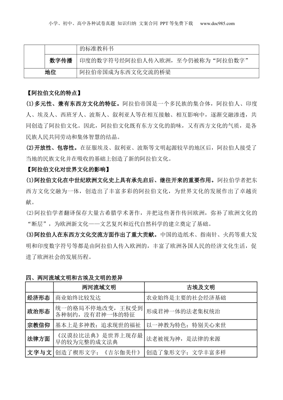 小学、初中、高中各种试卷真题知识归纳文案合同PPT等免费下载www.doc985.com《选择性必修3文化交流与传播》第二单元丰富多样的世界文化【课程标准】1.理解古代西亚孕育的两河流域文化和古代北非孕育的埃及文化在人类文化史上的开创性意义。2.了解古希腊、古罗马文化史欧洲文化的源头;西欧基督教文化和拜占庭、俄罗斯的东正教文化是中古时期欧洲两个主要的区域文化。3.了解古代南亚的印度文化、东亚的朝鲜和日本文化,以及因大洋阻隔而独立发展的美洲印第安文化,理解文化的地域类型。【知识提纲】【核心考点】第3课古代西亚、非洲文化一、古代西亚文化领域成就地位文字楔形文字迄今所知世界上最早的文字文学《吉尔伽美什》目前所知世界上最早的史诗建筑苏美尔人的泥偶雕像、亚述帝—小学、初中、高中各种试卷真题知识归纳文案合同PPT等免费下载www.doc985.com艺术国的王宫、波斯王宫等法律古巴比伦王国的《汉谟拉比法典》反映古巴比伦王国政治、社会和经济等多方面情况,是研究古代两河流域历史重要资料二、古代埃及文化1.存续时间:公元前3100年左右初步实现统一,文明绵延约3000年。2.文化成就(1)象形文字①来源于最初的象形字,由表音符号、表意符号和限定符号组成。②约形成于公元前4千纪末,一直使用到公元4世纪。在此期间,象形文字经历了多种变化。(2)文学作品:神话包括世界诞生和人类起源等内容诗歌大多是宗教诗,也有爱情诗哲理故事传达着埃及人的人生观和世界观散文故事包含寓言和传记等3.建筑艺术:①受到宗教较大影响。②法老们还修建了众多神庙,表达自己对神的敬畏。③祭司们宣扬法老是神的化身,法老则赐予神庙大量财富。4.科学和技术:①古代埃及人发明了世界上最早的太阳历。太阳历是古代世界最精确的历法之一。古罗马的凯撒在制定儒略历时,吸收了埃及历法的成就。②在数学、医学等方面,埃及人也颇有建树。三、阿拉伯文化背景①到8世纪阿拉伯帝国已征服从伊比利亚半岛到印度北部的广大地区;②阿拉伯人继承和融合了古代埃及、西亚、希腊、罗马以及印度等地的文化遗产,结合阿拉伯人的风俗、语言和传统,创造了阿拉伯文化成就文学①诗歌:举行诗歌比赛,获胜的诗歌会用金水书写在布上,悬挂在克尔白神庙的墙壁上,名为“悬诗”;②故事集《天方夜谭》数学伊本·穆萨的《积分和方程计算法》,把代数学发展为独立学科成就天文学白塔尼修正了计算太阳和部分行星轨道的方法,证明了发生日环食的可能性。著有《萨比天文历表》医学伊本·西那的《医典》是一部医学百科全书,传入欧洲后长期用作医学小学、初中、高中各种试卷真题知识归纳文案合同PPT等免费下载www.doc985.com的标准教科书数字传播印度的数字符号经阿拉伯人传入欧洲,至今仍被称为“阿拉伯数字”地位阿拉伯帝国成为东西文化交流的桥梁【阿拉伯文化的特点】(1)多元性、兼有东西方文化的特征。阿拉伯帝国是一个多民族的集合体,阿拉伯人、印度人、埃及人、西班牙人、波斯人、叙利亚人等在相互接触、相互影响中,逐渐交融渗透,共同创造了阿拉伯文化。因此,阿拉伯文化既有东方文化的韵味,又有西方文化的气质,是各民族人民共同劳动和集体智慧的结晶。(2)开放性、包容性。在征服埃及、叙利亚、波斯等文明起源较早的地区后,阿拉伯人接受了当地的民族文化并在吸收的基础上创造了新的阿拉伯文化。【阿拉伯文化对世界文化的影响】(1)阿拉伯文化在中世纪欧洲文化史上具有承先启后、继往开来的重要作用。阿拉伯学者把东西方文化交融为一体,创造出了丰富多彩的阿拉伯文化,为世界文化的发展作出了卓越贡献。(2)阿拉伯学者翻译保存大量古希腊学术著作,并把这些著作传回欧洲,弥补了欧洲文化的“断层”,为欧洲新文化——文艺复兴和近代自然科学的建立奠定了基础。(3)阿拉伯人在东西方文化交流方面作出了重大贡献。中国的造纸术、指南针、火药等重大发明和印度数字符号等都是由阿拉伯人传入欧洲的,丰富了欧洲各国人民的经济文化生活,促进了欧洲社会的发展历程。四、两河流域文明和古埃及文明的差异两河流域文明古埃及文明经济形态商业始终比较发达农业始终是主要的社会经济基础政治形态统一的格局不停地改...