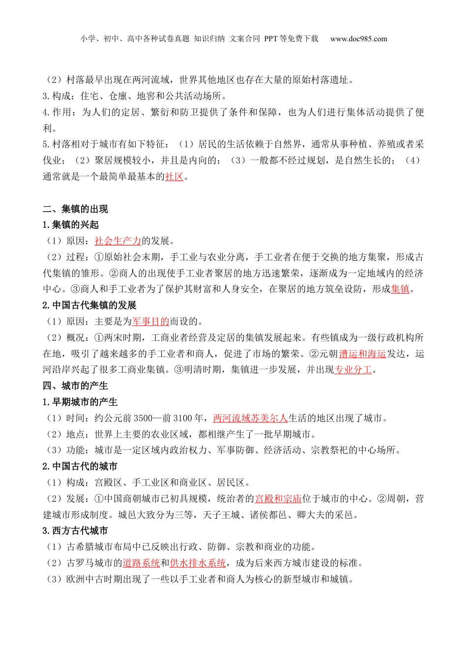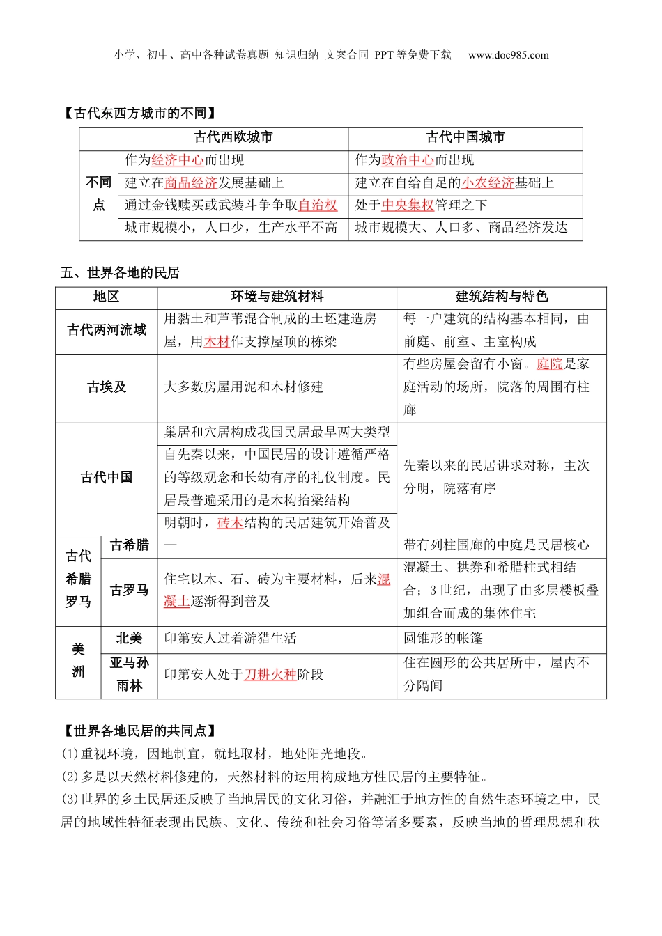 小学、初中、高中各种试卷真题知识归纳文案合同PPT等免费下载www.doc985.com《选择性必修2经济与社会生活》第四单元村落、城镇与居住环境【课程标准】1.了解人类居住条件的变迁及各地民居的差异及其特征;了解古代的村落、集镇和城市形成的原因及影响。2.了解近代以来城市化进程中人们居住条件和生活环境的改善及问题。【知识提纲】【核心考点】第10课古代的村落、集镇和城市【城市的产生对人类社会发展和人们生活的影响】(1)城市的产生与政治密切相关,一般都有城墙,对政治局势的稳定起到了重要作用。(2)城市的产生,使得人口、手工业生产、商品交换以及财富集中,促进了工商业的发展。(3)城市的防御性设施、水利工程、道路等设施的修建,有利于人类居住;推动城市化进程。(4)为人们参与政治、经济、文化、宗教、体育和艺术等群体生活创造了条件,有利于文化思想交汇,有利于推动文明的进步。一、村落的产生1.发展历程:人类居住形式经历了从穴居、巢居、半穴居到地面筑屋的演变。2.原因:(1)农业出现以后,人们筑屋定居,形成具有相当数量和规模的聚居点——村落。小学、初中、高中各种试卷真题知识归纳文案合同PPT等免费下载www.doc985.com(2)村落最早出现在两河流域,世界其他地区也存在大量的原始村落遗址。3.构成:住宅、仓廪、地窖和公共活动场所。4.作用:为人们的定居、繁衍和防卫提供了条件和保障,也为人们进行集体活动提供了便利。5.村落相对于城市有如下特征:(1)居民的生活依赖于自然界,通常从事种植、养殖或者采伐业;(2)聚居规模较小,并且是内向的;(3)一般都不经过规划,是自然生长的;(4)通常就是一个最简单最基本的社区。二、集镇的出现1.集镇的兴起(1)原因:社会生产力的发展。(2)过程:①原始社会末期,手工业与农业分离,手工业者在便于交换的地方集聚,形成古代集镇的雏形。②商人的出现使手工业者聚居的地方迅速繁荣,逐渐成为一定地域内的经济中心。③商人和手工业者为了保护其财富和人身安全,在聚居的地方筑垒设防,形成集镇。2.中国古代集镇的发展(1)原因:主要是为军事目的而设的。(2)概况:①两宋时期,工商业者经营及定居的集镇发展起来。有些镇成为一级行政机构所在地,吸引了越来越多的手工业者和商人,促进了市场的繁荣。②元朝漕运和海运发达,运河沿岸兴起了很多工商业集镇。③明清时期,集镇进一步发展,并出现专业分工。四、城市的产生1.早期城市的产生(1)时间:约公元前3500—前3100年,两河流域苏美尔人生活的地区出现了城市。(2)地点:世界上主要的农业区域,都相继产生了一批早期城市。(3)功能:城市是一定区域内政治权力、军事防御、经济活动、宗教祭祀的中心场所。2.中国古代的城市(1)构成:宫殿区、手工业区和商业区、居民区。(2)发展:①中国商朝城市已初具规模,统治者的宫殿和宗庙位于城市的中心。②周朝,营建城市形成制度。城邑大致分为三等,天子王城、诸侯都邑、卿大夫的采邑。3.西方古代城市(1)古希腊城市布局中已反映出行政、防御、宗教和商业的功能。(2)古罗马城市的道路系统和供水排水系统,成为后来西方城市建设的标准。(3)欧洲中古时期出现了一些以手工业者和商人为核心的新型城市和城镇。小学、初中、高中各种试卷真题知识归纳文案合同PPT等免费下载www.doc985.com【古代东西方城市的不同】古代西欧城市古代中国城市不同点作为经济中心而出现作为政治中心而出现建立在商品经济发展基础上建立在自给自足的小农经济基础上通过金钱赎买或武装斗争争取自治权处于中央集权管理之下城市规模小,人口少,生产水平不高城市规模大、人口多、商品经济发达五、世界各地的民居地区环境与建筑材料建筑结构与特色古代两河流域用黏土和芦苇混合制成的土坯建造房屋,用木材作支撑屋顶的栋梁每一户建筑的结构基本相同,由前庭、前室、主室构成古埃及大多数房屋用泥和木材修建有些房屋会留有小窗。庭院是家庭活动的场所,院落的周围有柱廊古代中国巢居和穴居构成我国民居最早两大类型先秦以来的民居讲求对称,主次分明,院落有序自先秦以来,中国民居的设计遵循严格的等级观念和长幼有序的礼仪制...