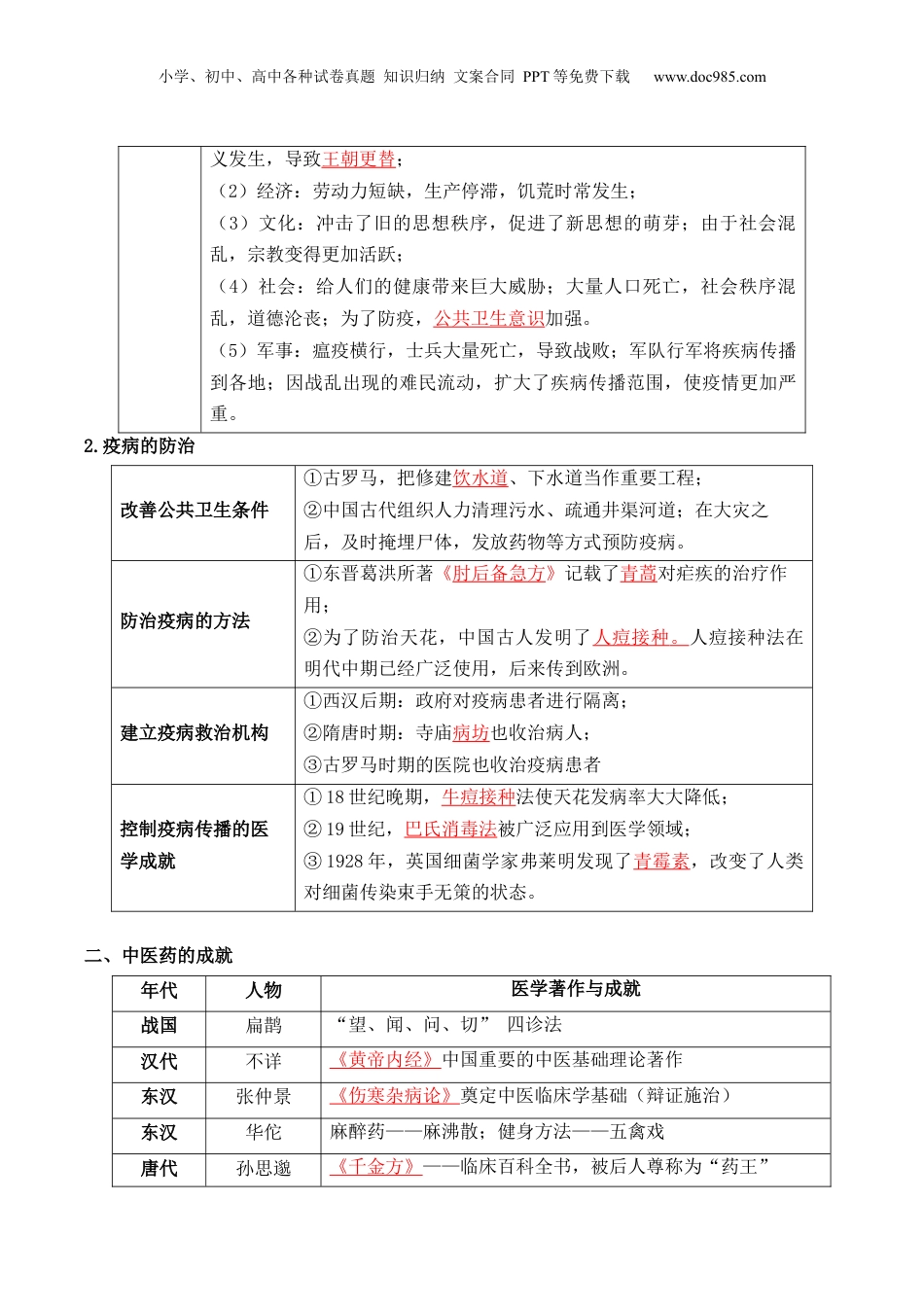 小学、初中、高中各种试卷真题知识归纳文案合同PPT等免费下载www.doc985.com《选择性必修2经济与社会生活》第六单元医疗与公共卫生【课程标准】1.知道古代疫病的流行及其影响;了解中医药的主要成就与西医在中国的传播、发展过程。2.了解现代医疗卫生体系的建立、发展及其对社会生活的影响。【知识提纲】【核心考点】第14课历史上的疫病与医学成就一、历史上的疫病1.疫病及影响疫病天花①古埃及时期,天花席卷尼罗河沿岸;②18世纪时,欧洲天花肆虐,俄国彼得二世、法国路易十五等多位君主就死于天花。③中国清朝的康熙皇帝也得过天花。④被天花传染的普通百姓不计其数。鼠疫①6世纪时,地中海沿岸暴发鼠疫,造成拜占庭帝国人口锐减一半;②14世纪时,欧洲鼠疫大流行,被称为“黑死病”,流行了3个世纪,欧洲人口死亡过半,导致劳动力短缺,生产停滞,欧洲许多地区发生严重饥荒。影响(1)政治:重要历史人物丧命,威胁政权统治;阶级矛盾激化,农民起小学、初中、高中各种试卷真题知识归纳文案合同PPT等免费下载www.doc985.com义发生,导致王朝更替;(2)经济:劳动力短缺,生产停滞,饥荒时常发生;(3)文化:冲击了旧的思想秩序,促进了新思想的萌芽;由于社会混乱,宗教变得更加活跃;(4)社会:给人们的健康带来巨大威胁;大量人口死亡,社会秩序混乱,道德沦丧;为了防疫,公共卫生意识加强。(5)军事:瘟疫横行,士兵大量死亡,导致战败;军队行军将疾病传播到各地;因战乱出现的难民流动,扩大了疾病传播范围,使疫情更加严重。2.疫病的防治改善公共卫生条件①古罗马,把修建饮水道、下水道当作重要工程;②中国古代组织人力清理污水、疏通井渠河道;在大灾之后,及时掩埋尸体,发放药物等方式预防疫病。防治疫病的方法①东晋葛洪所著《肘后备急方》记载了青蒿对疟疾的治疗作用;②为了防治天花,中国古人发明了人痘接种。人痘接种法在明代中期已经广泛使用,后来传到欧洲。建立疫病救治机构①西汉后期:政府对疫病患者进行隔离;②隋唐时期:寺庙病坊也收治病人;③古罗马时期的医院也收治疫病患者控制疫病传播的医学成就①18世纪晚期,牛痘接种法使天花发病率大大降低;②19世纪,巴氏消毒法被广泛应用到医学领域;③1928年,英国细菌学家弗莱明发现了青霉素,改变了人类对细菌传染束手无策的状态。二、中医药的成就年代人物医学著作与成就战国扁鹊“望、闻、问、切”四诊法汉代不详《黄帝内经》中国重要的中医基础理论著作东汉张仲景《伤寒杂病论》奠定中医临床学基础(辩证施治)东汉华佗麻醉药——麻沸散;健身方法——五禽戏唐代孙思邈《千金方》——临床百科全书,被后人尊称为“药王”小学、初中、高中各种试卷真题知识归纳文案合同PPT等免费下载www.doc985.com唐代政府《唐本草》世界上第一部由政府颁布的药典宋代王惟一针灸铜人——医学教学模型明代李时珍《本草纲目》“东方药学巨典”新中国政府广泛设立中医院与中医院校,掀起研究中医的高潮新中国专家整理中医典籍,提取青蒿素,获得诺贝尔医学奖三、西医在中国的传播1.西医的产生与发展(1)概况:近代以来,西医以化学、生物学、物理学等实验科学为依托,借助精密仪器及数据分析,在解剖学、诊断学、药学等方面取得很大成就。(2)产生:①17世纪,英国生理学家威廉·哈维著成《心血运动论》,揭示了血液循环规律;荷兰人列文虎克通过显微镜,对肉眼不可见的微生物进行了细致观察。②19世纪,人们将生理与临床结合起来,探索各种药物的功能和作用,创立了实验药理学。2.开始传入时间西医在中国传播情况明末清初西医传入中国,但影响有限鸦片战争后发展原因鸦片战争后,西学东渐;西医在实验医学及医学分科上的优势;外国教会、传教士的推动;适应西方列强殖民扩张的需要等表现(1)教会医院的建立:鸦片战争后,西式医院在通商口岸建立起来。其分科完备,技术先进,广受欢迎。(2)西医技术的引入:牛痘接种法、麻醉术、放射技术以及其他近代西医成就陆续被引入中国。(3)西医院校的建立:西医院校建立起来,把教学、科研与临床结合在一起,培养了相当数量的西医人才。(4)公共卫生的发展:①西方...