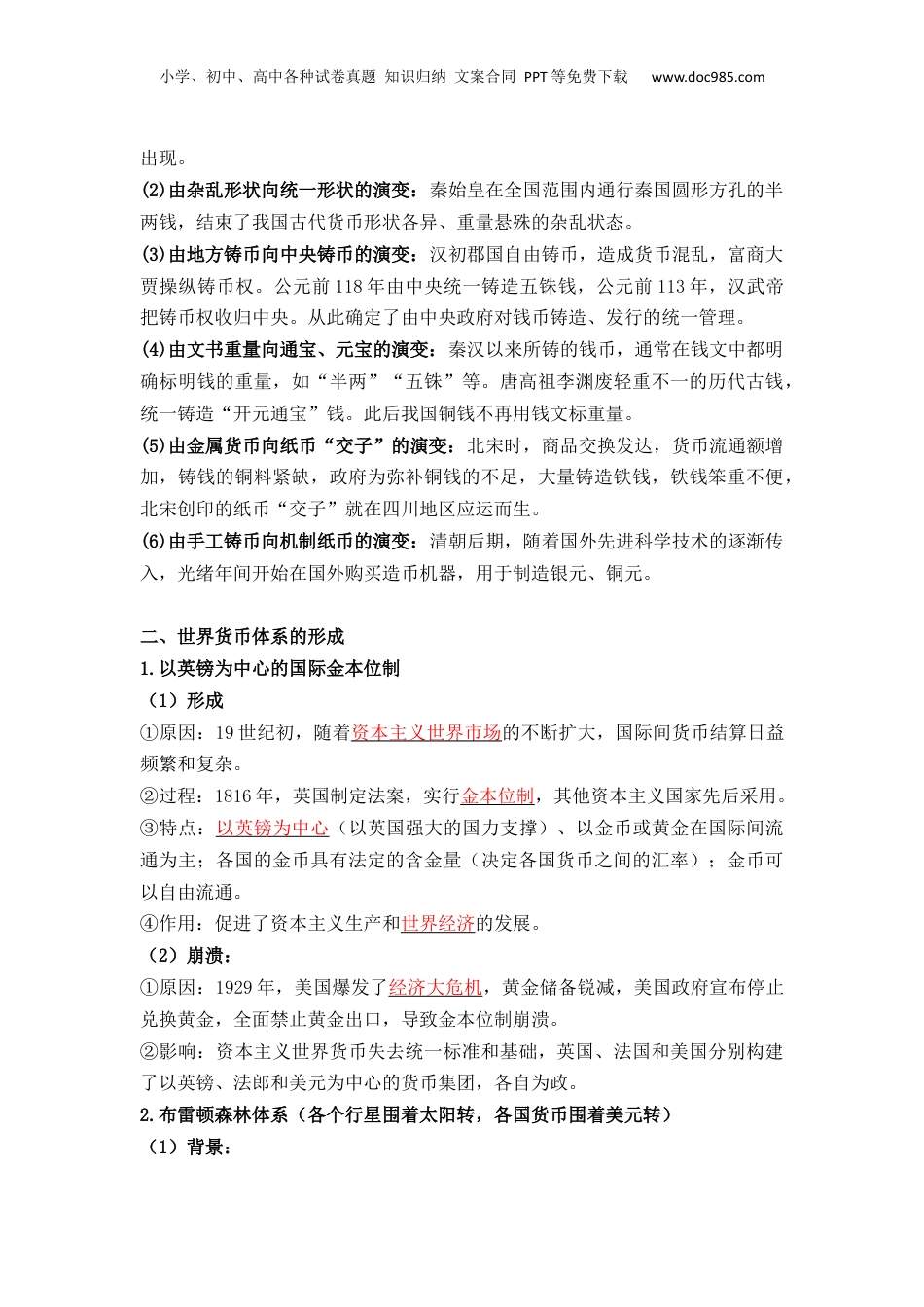 小学、初中、高中各种试卷真题知识归纳文案合同PPT等免费下载www.doc985.com《选择性必修1国家制度与社会治理》第五单元货币与赋税制度【课程标准】1.了解中外历史上货币的发行和使用情况,以及现代世界货币体系的形成。2.了解中国古代赋税制度的演变。3.了解关税、个人所得税制度的产生及其在中国的实行。【时空定位】【知识点】第15课货币的使用与世界货币体系的形成一、中国货币的演进历程1.古代(1)产生:中国古代最初被用作货币的可能是海贝。二里头遗址出土了海贝,还有用骨头、石头做成的仿制贝。(2)商朝后期:开始出现铜铸币。(3)春秋战国时期:各国分别使用布币、刀币、圜钱、蚁鼻钱等多种样式的铜铸币。(4)秦朝:将货币统一为圆形方孔钱,这种样式在此后被长期沿用。(5)北宋后期:①背景:铜钱流通量不足,无法满足商业贸易发展的需要,出现“钱荒”。②过程:北宋诞生了世界上最早的纸币,称为“交子”。③结果:交子与宋朝后来发行的其他纸币,都是作为辅币,与铜钱兼行。(6)元朝:①措施:将纸币作为单一流通货币来发行,称为“钞”。小学、初中、高中各种试卷真题知识归纳文案合同PPT等免费下载www.doc985.com②结果:元末滥印纸钞,导致恶性通货膨胀,财政崩溃。(7)明朝:①恢复铜钱、纸币并行的货币体制。②自明朝中期起,白银逐渐成为国家财政和民间交易的基本支付手段。(8)清朝:①措施:完全承认白银的法定货币地位,与铜钱兼用。②作用:白银货币化是商品经济发展的需要,推动了商品经济进一步发展。2.近代(1840~1949年)晚清开始铸造银元民国初期以银元为法定货币国共十年对峙时期国民政府实行法币改革时间1935年内容由银行、中国银行、交通银行(后加上中国农民银行)发行的钞票为法币,禁止银元的流通,将白银收为国有抗日战争和解放战争时期国统区法币崩溃,国民政府发行金圆券和银圆券;民间自动重新使用银元解放区华北人民政府于1948年12月1日在河北石家庄成立中国人民银行,开始统一发行人民币4.现代中国:人民币成为中华人民共和国的法定货币(1)背景:随着解放战争的顺利进行,中国共产党领导的各解放区迅速连成一片。形势的发展急需一种统一的货币来替代原来各根据地和解放区种类庞杂、折算不便的货币(地区间的经济联系增强,客观上要求货币的发行和流通由分散走向统一)。(2)产生:华北人民政府于1948年12月1日在河北石家庄成立中国人民银行,开始统一发行人民币。新中国成立后,人民币成为中华人民共和国的法定货币。(3)发展:从最初发行到1999年10月1日启用新版,人民币先后共发行了五套,形成纸币与金属币、普通纪念币与贵金属纪念币等多品种、多系列的货币体系。(4)影响:长期以来,人民币地位始终稳定,对国民经济发展作出重大贡献。同时,随着对外开放的扩大,人民币在国际货币体系中也发挥着越来越重要的作用。【中国古代货币演变的规律】(1)自然货币向人工货币的演变:中国古代最初以海贝作为货币,随着商品交换的发展,海贝已无法满足人们的需求,商朝后期开始用铜仿制海贝,人工货币小学、初中、高中各种试卷真题知识归纳文案合同PPT等免费下载www.doc985.com出现。(2)由杂乱形状向统一形状的演变:秦始皇在全国范围内通行秦国圆形方孔的半两钱,结束了我国古代货币形状各异、重量悬殊的杂乱状态。(3)由地方铸币向中央铸币的演变:汉初郡国自由铸币,造成货币混乱,富商大贾操纵铸币权。公元前118年由中央统一铸造五铢钱,公元前113年,汉武帝把铸币权收归中央。从此确定了由中央政府对钱币铸造、发行的统一管理。(4)由文书重量向通宝、元宝的演变:秦汉以来所铸的钱币,通常在钱文中都明确标明钱的重量,如“半两”“五铢”等。唐高祖李渊废轻重不一的历代古钱,统一铸造“开元通宝”钱。此后我国铜钱不再用钱文标重量。(5)由金属货币向纸币“交子”的演变:北宋时,商品交换发达,货币流通额增加,铸钱的铜料紧缺,政府为弥补铜钱的不足,大量铸造铁钱,铁钱笨重不便,北宋创印的纸币“交子”就在四川地区应运而生。(6)由手工铸币向机制纸币的演变:清朝后期,随着国外先进科学技术的逐渐传入,光绪年间开始在国外购买造币机器...