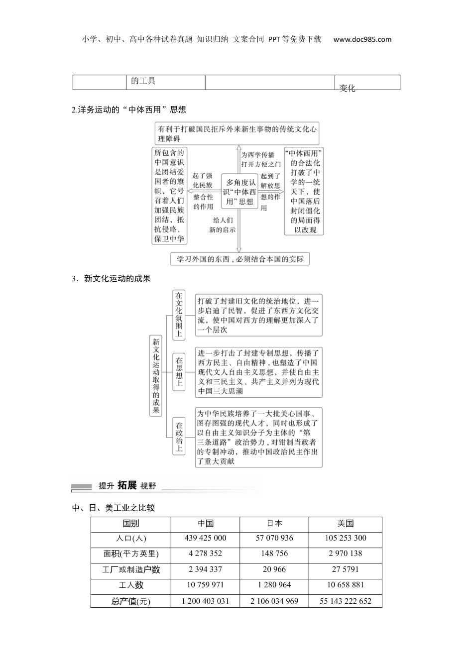 小学、初中、高中各种试卷真题知识归纳文案合同PPT等免费下载www.doc985.com微专题1中华文明的沉沦与上升——旧民主主义革命时期1840年鸦片战争至1919年五四运动是中国旧民主主义革命时期,落后的农业文明遭受先进的工业文明的冲击,中国开启了近代化的历程政治(1)晚清时期,西方列强发动侵华战争,中国的主权遭到破坏,半殖民地半封建化程度不断加深。为挽救民族危机和统治危机,清政府先后推行“戊戌新政”和“清末新政”,在一定程度上推动了中国近代化的进程,但最终失败。晚清时期,在镇压太平天国运动和兴办洋务的过程中,汉族官僚势力上升,逐渐成为官僚队伍的主体;鸦片战争后,产生于西方的外交制度和国际法逐渐引入中国,中国古代的宗藩体系逐渐瓦解;中国开始丧失关税自主权,中国国境关税的海关大权也长期把持在外国人手中(2)辛亥革命和中华民国的建立改变了中国历史的进程,资产阶级共和制在中国建立;《中华民国临时约法》以法律的形式确立了资产阶级共和国的国家政治制度和政权组织形式(3)北洋军阀统治时期政党政治活跃;孙中山等资产阶级革命派为维护民主共和进行的斗争先后失败。军阀割据造成中央权威受到削弱,一方面,美日等国趁机加紧对华侵略,给中华民族带来了深重的灾难;另一方面也为革命势力的发展和新思想的出现创造了相对有利的环境经济与社会生活(1)鸦片战争以后,中国逐渐卷入资本主义世界市场,成为西方的原料产地和商品倾销市场,买办阶层出现;新的商业经营形式被引入中国,银行、股份制企业、证券机构、百货公司等出现。19世纪70年代以后,近代海上运输、铁路运输发展起来,京杭大运河的地位下降,深刻影响了中国的经济格局。19世纪中后期,洋务派创办了一系列近代企业,引进了西方的工厂制度。后来,一批民族资本家开办工厂,中国民族工业初步发展起来(2)辛亥革命后,南京临时政府大力提倡发展实业,开始着手经济法制的建设;北洋政府颁布一系列经济法规。民国政府颁布的一系列促进民族小学、初中、高中各种试卷真题知识归纳文案合同PPT等免费下载www.doc985.com资本主义发展的法律文件,推动民族资本主义迅速发展,而这一时期欧洲列强忙于第一次世界大战,暂时放松对中国的经济侵略,民族资本主义发展出现“短暂的春天”。一战结束后,帝国主义列强卷土重来,民族资本主义发展又陷入困境(3)鸦片战争后,近代化性质的工商业城市在通商口岸陆续出现、发展和壮大;西方饮食、服饰传入中国,在通商口岸和一些大城市,中西饮食、服饰交相辉映;西式医院在通商口岸建立起来,一些大城市借鉴西方公共卫生措施,推动公共卫生事业初步发展起来文化(1)19世纪中叶以来,国门被迫打开,一些爱国知识分子放眼世界,探索新知,推动中国近代化。清朝统治者“天朝上国”的愚昧思想受到冲击,“向西方学习”的新思想经历了从倡导到实践的演进,从师夷之长技以制夷、中体西用、维新思想到三民主义思想。辛亥革命促进了中国人民的思想解放。民国初期,新文化运动高举民主与科学的旗帜,推动了思想文化的变革(2)京师大学堂主导新式教育的推进,采取分科教育的方式,是中国教育近代化的标志。随着新式学堂和留学教育的发展,西方资产阶级革命时期的一些学说在中国传播,成为辛亥革命的思想武器。新旧并立、土洋并存成为主要特色,思想观念新旧碰撞,也体现了近代化缓慢发展的社会面貌1.晚清时期(1840-1912)的社会状况项目外来侵略及破坏中国社会各阶层反应中国社会变化第一次鸦片战争领土、关税、贸易、外交、司法等主权破坏林则徐等“新思想”的萌发;洪秀全领导太平天国运动经济:工厂制度、新商业经营形式引入;城市、交通近代化政治:科举和选官制度改革;部分机构近代化社会文化:公共卫生和文化教育近代化;社会生活习俗第二次鸦片战争大片领土丧失;侵略从沿海深入内陆曾国藩、李鸿章等开展洋务运动;民间逐渐投资近代工商业边疆危机、中法战争侵略遍及沿海、内陆、边疆地区洋务运动深入,创建近代海军等;设新疆、台湾行省,加强国防甲午战争、瓜分狂潮领土丧失、巨额赔款;资本输出、瓜分中国康有为等开展维新变法运动;农民阶级发动义和团运动八国联军侵...
