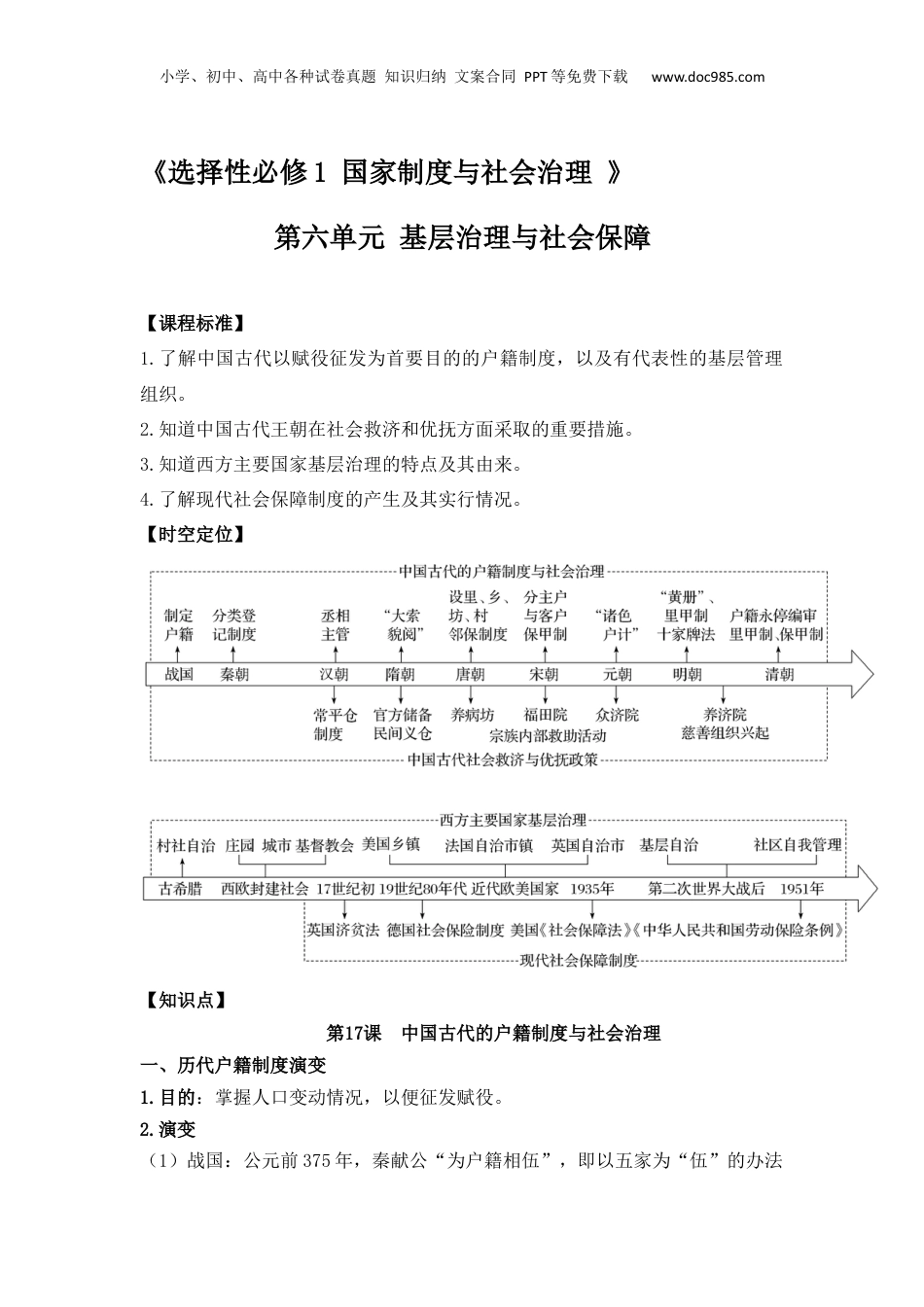 小学、初中、高中各种试卷真题知识归纳文案合同PPT等免费下载www.doc985.com《选择性必修1国家制度与社会治理》第六单元基层治理与社会保障【课程标准】1.了解中国古代以赋役征发为首要目的的户籍制度,以及有代表性的基层管理组织。2.知道中国古代王朝在社会救济和优抚方面采取的重要措施。3.知道西方主要国家基层治理的特点及其由来。4.了解现代社会保障制度的产生及其实行情况。【时空定位】【知识点】第17课中国古代的户籍制度与社会治理一、历代户籍制度演变1.目的:掌握人口变动情况,以便征发赋役。2.演变(1)战国:公元前375年,秦献公“为户籍相伍”,即以五家为“伍”的办法小学、初中、高中各种试卷真题知识归纳文案合同PPT等免费下载www.doc985.com编排户口。(2)秦朝:实行分类登记制度(体现等级性),除一般百姓的户籍外,还有宗亲贵族的宗室籍、官吏的宦籍、商贾的市籍等(3)汉朝:①丞相主管全国户籍工作,各级地方政府均有专门人员主管户籍。②户是政府征派赋役的单位,百姓编入户籍后,便成了封建国家的“编户齐民”。③政府定期进行人口调查。④东汉末年,战事频繁,人口流动加剧,豪强地主与国家争夺人口,户籍散乱。(4)隋朝:命州县官“大索貌阅”(即按户籍上登记的年龄与本人体貌进行核对,防止诈老诈小),重新核定户籍。(5)唐朝:唐承隋制,管理更严,户籍三年一造。(6)宋朝:户籍分主户与客户。主户指拥有土地、缴纳赋税的税户,客户指没有土地的佃户。(7)元朝:户口类型比较复杂,按职业划分,统称为“诸色户计”(划分标准包括职业、民族、宗教和社会地位等,带有民族压迫色彩),一旦定籍,世代相袭,不得变动。(8)明朝:①继承了元朝以职业定户籍的做法,户籍分民籍、军籍、匠籍等。②明朝户籍册称“黄册”,以里甲制为基础,每里一册,详列各户人口、田土、房屋(9)清朝:①普通户籍基本沿袭明制,户籍管理相对松弛。②清前期,赋役实行固定丁银、摊丁入亩后,户籍的作用大为削弱(户籍制度与赋役制度逐渐脱离)。③乾隆年间,朝廷谕令户籍永停编审,此后政府只是按照一定的组织制度等级人口数量。二、历代基层组织与社会治理1.基层组织(1)从秦汉到明清:县是最基层的行政机构,下设直接管理民众的基层组织。(2)秦汉:县下设乡和里。乡设三老,里设里正。后代沿袭这种乡里制度,稍小学、初中、高中各种试卷真题知识归纳文案合同PPT等免费下载www.doc985.com有变化。(3)唐朝:以百户为里,五里为乡,城内设坊,郊外设村,设里正、坊正、村正。(4)明朝:实行里甲制,十户为一甲,一百一十户为一里,设甲首、里长。2.社会治理(1)特点:注重建立基层民众的自我管理与相互监督机制。(2)演变(既是基层行政管理组织,也是征发兵役、徭役的基本单位)秦汉实行什伍组织,以五家为伍,十家为什,百家为里唐朝实行邻保制度,以四家为邻,五邻为保北宋实施保甲制明朝推行十家牌法,要求十家总编为一牌清朝清初实行里甲制,后来推行保甲制(3)趋势:兼具区划和户籍管理性质的乡里制与旨在维护社会治安的保甲制合一(由于摊丁入亩和不再编审户籍)。【东晋和宋朝户籍制度变化的原因】(1)社会动乱和人口流动打破了原有的户籍管理制度,封建政府无法掌握人口、田亩等信息。(2)封建土地私有制的发展,导致部分人口失去土地成为地主阶级依附阶层,无法承担赋役。(3)为保障赋役征发,封建政府不得不适应变化了的社会现实,重新制定新型户籍分类标准。【中国古代社会基层治理】(1)治安管理机构的设置较为固定,由乡里制向保甲制、由乡官制向职役制转变。国家对乡村治理的干预和控制逐步增强。乡村自治功能逐步减弱。(2)利用联保连坐与保甲法这样一些超强制的高压手段。(3)家族伦理和族规家法成为极为重要的非正式控制手段。(4)由乡民、村民组成的治安力量对维系一方治安起到了补充控制的作用。(5)兼具区划和户籍管理性质的乡里制、维护社会治安的保甲制,与乡约教化社会职能三者趋于合一。【中国古代户籍制度的特点】(1)分类管理:如秦朝分户籍、宗室籍、官籍、市籍等,明朝:民籍、军籍、小学、初中、高中各种试卷真题知识归纳文...