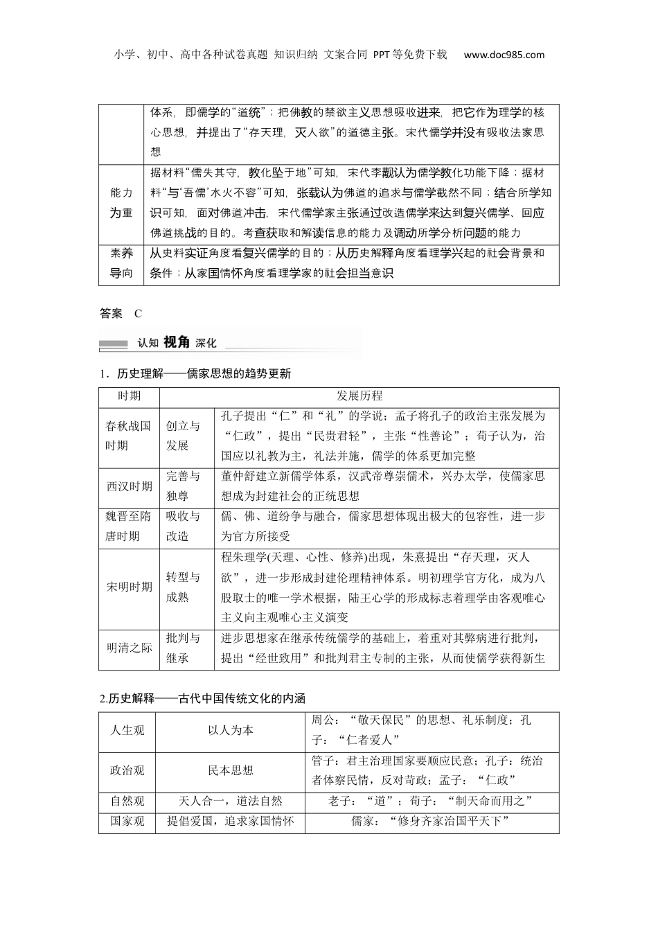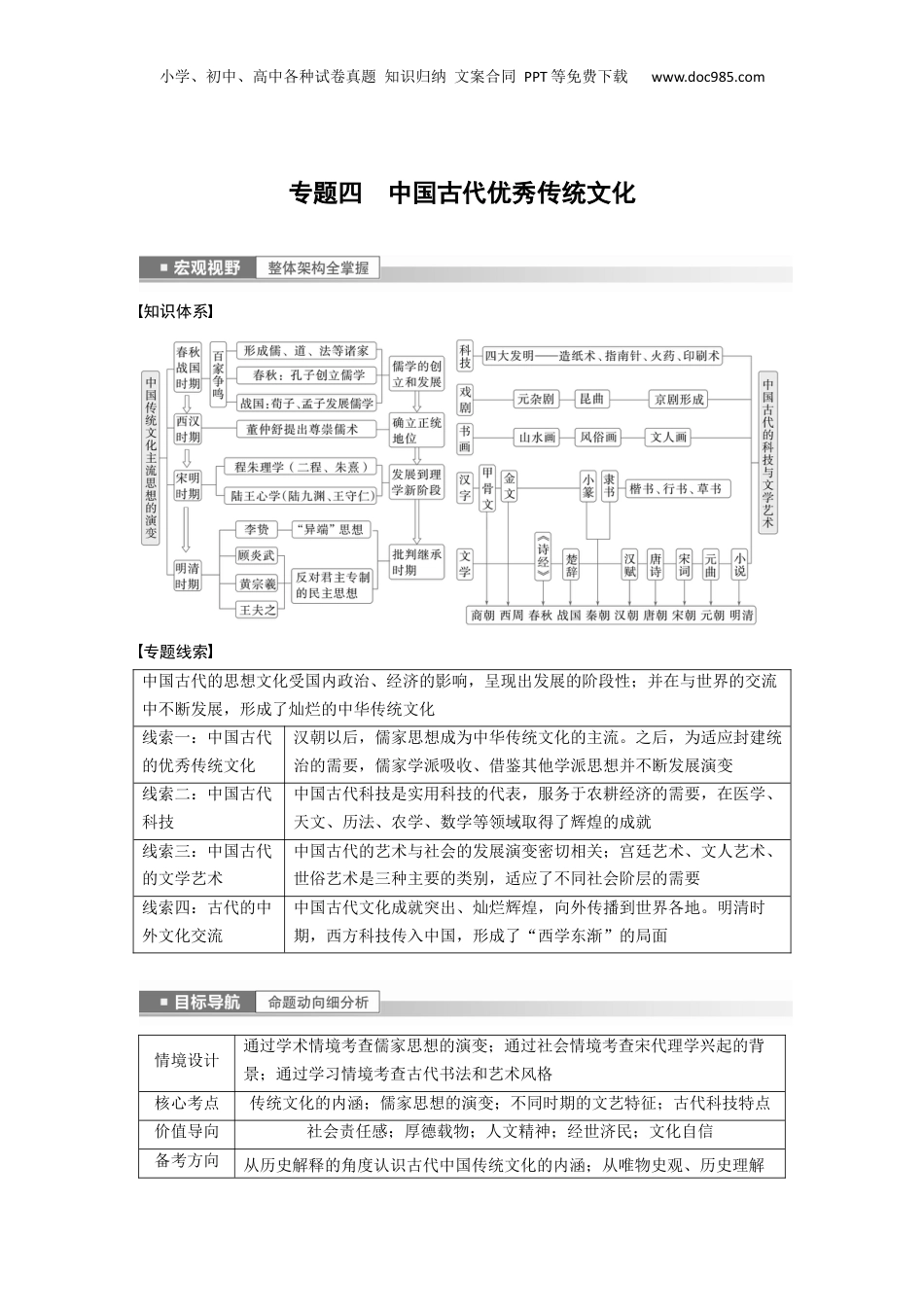 小学、初中、高中各种试卷真题知识归纳文案合同PPT等免费下载www.doc985.com专题四中国古代优秀传统文化知识体系专题线索中国古代的思想文化受国内政治、经济的影响,呈现出发展的阶段性;并在与世界的交流中不断发展,形成了灿烂的中华传统文化线索一:中国古代的优秀传统文化汉朝以后,儒家思想成为中华传统文化的主流。之后,为适应封建统治的需要,儒家学派吸收、借鉴其他学派思想并不断发展演变线索二:中国古代科技中国古代科技是实用科技的代表,服务于农耕经济的需要,在医学、天文、历法、农学、数学等领域取得了辉煌的成就线索三:中国古代的文学艺术中国古代的艺术与社会的发展演变密切相关;宫廷艺术、文人艺术、世俗艺术是三种主要的类别,适应了不同社会阶层的需要线索四:古代的中外文化交流中国古代文化成就突出、灿烂辉煌,向外传播到世界各地。明清时期,西方科技传入中国,形成了“西学东渐”的局面情境设计通过学术情境考查儒家思想的演变;通过社会情境考查宋代理学兴起的背景;通过学习情境考查古代书法和艺术风格核心考点传统文化的内涵;儒家思想的演变;不同时期的文艺特征;古代科技特点价值导向社会责任感;厚德载物;人文精神;经世济民;文化自信备考方向从历史解释的角度认识古代中国传统文化的内涵;从唯物史观、历史理解小学、初中、高中各种试卷真题知识归纳文案合同PPT等免费下载www.doc985.com的角度关注儒家思想的趋势更新;从历史解释的角度认识中国古代科技的发展及特点;从家国情怀的角度认识中国古代文学成就所反映的时代特色考向一中国传统文化主流思想的演变价值引领1传统文化——从文化融合角度看“百家争鸣”(2022·山卷,东1)战国时期,法家两大派之一的田齐法家主张“君臣上下贵贱皆从法”“君臣不用礼义教训则不祥。”这反映其思想特点是()A.尚法存礼B.尊法敬天C.崇德重法D.外儒内法解读知识基为春秋期的百家;法家的思想主战国时争鸣张能力重为据材料信息关键“君臣上下皆法贵贱从”“君臣不用不祥礼义教训则”可以看出,田法家的思想向,合所法家派特点,可以得出其齐倾结学别“法存尚礼”。考查取、解和信息的能力及用知和分析的能力获读调动运识问题素养向导史料角度看田法家从实证齐“法存尚礼”的特点;史理解角度看法家派思从历别想主张答案A价值引领2社会责任感——从儒学面临的挑战看宋代理学的兴起(2022·广卷,东4)魏晋以来佛教、道教广泛传播,宋人李觏认为原因在于“儒失其守,教化坠于地”;张载认为佛道追求的彼岸是虚幻的,与“吾儒”水火不容。由此可知,李觏、张载主张()A.儒法并用以维护君权B.立足考据以重建学风C.复兴儒学以回应挑战D.杂糅佛道以构建理学解读知识基为宋明理是佛道化的儒,主要表在:吸收借佛道的形而上,建学学现鉴教与教学儒理道德的形而上;借佛道二的体系,立儒家的道构学伦学鉴教传教创学说传小学、初中、高中各种试卷真题知识归纳文案合同PPT等免费下载www.doc985.com体系,即儒的学“道统”;把佛的禁欲主思想吸收,把作理的核教义进来它为学心思想,提出了并“存天理,人欲灭”的道德主。宋代儒有吸收法家思张学并没想能力重为据材料“儒失其守,化于地教坠”可知,宋代李儒化功能下降;据材觏认为学教料“与‘吾儒’水火不容”可知,佛道的追求儒截然不同;合所知张载认为与学结学可知,面佛道冲,宋代儒家主通改造儒到儒、回识对击学张过学来达复兴学应佛道挑的目的。考取和解信息的能力及所分析的能力战查获读调动学问题素养向导史料角度看儒的目的;史解角度看理起的社背景和从实证复兴学从历释学兴会件;家情角度看理家的社担意条从国怀学会当识答案C1.历史理解——儒家思想的趋势更新时期发展历程春秋战国时期创立与发展孔子提出“仁”和“礼”的学说;孟子将孔子的政治主张发展为“仁政”,提出“民贵君轻”,主张“性善论”;荀子认为,治国应以礼教为主,礼法并施,儒学的体系更加完整西汉时期完善与独尊董仲舒建立新儒学体系,汉武帝尊崇儒术,兴办太学,使儒家思想成为封建社会的正统思想魏晋至隋唐时期吸收与改造儒、佛、道纷争与融合,儒家思想体现出极大的包容...