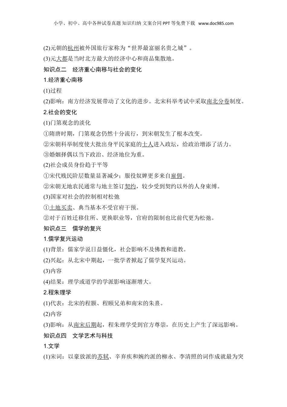 小学、初中、高中各种试卷真题知识归纳文案合同PPT等免费下载www.doc985.com第7讲辽宋夏金元的经济、社会和文化课程标准核心概念词提示通过认识辽宋夏金元在经济、文化与社会等方面的新变化,认识不同政权在统一多民族封建国家发展中的重要作用。1.辽宋夏金元的经济与社会:稻麦复种制、五大名窑、印刷业、榷场、纸币、临安、元代大运河、南北分卷制度、门第观念淡化2.辽宋夏金元的文化:程朱理学、格物致知、宋词、元曲、话本、活字印刷术、《授时历》、《农书》知识点一辽宋夏金元的农业、手工业和商业1.农业:宋朝时一年两熟的稻麦复种制在南方已相当普及。出现了固定种植某种经济作物的农户,对传统自然经济结构有一定突破。2.手工业(1)制瓷业:宋朝出现五大名窑,元朝出现青花瓷和釉里红。宋元时期瓷器成为中华文明新的物质象征。(2)矿冶业:煤的开采量很大,大大提高了金属冶炼的产量和质量。(3)印刷业:推动了文化的普及,带动了造纸业的发展。3.商业发展(1)特点:面向大众的基层市场蓬勃涌现。(2)表现4.城市繁荣(1)北宋东京和南宋临安人口均超出百万,市场活跃,交易频繁,娱乐活动丰富多彩。小学、初中、高中各种试卷真题知识归纳文案合同PPT等免费下载www.doc985.com(2)元朝的杭州被外国旅行家称为“世界最富丽名贵之城”。(3)元大都是当时北方最大的经济中心和商品集散地。知识点二经济重心南移与社会的变化1.经济重心南移(1)过程(2)影响:南方经济发展带动了文化的进步。北宋科举考试中采取南北分卷制度。2.社会的变化(1)门第观念的淡化①隋唐时期,门第观念仍然十分流行,到宋朝发生了根本改变。②宋朝科举制度使大批出身平民家庭的士人进入政坛,给政治增添了活力。③婚姻择偶以当下政治、经济地位为重。(2)社会成员身份趋于平等①宋代贱民阶层数量显著减少;服役奴婢更多来自雇佣。②宋朝无地农民通常与地主签订契约,较少受到契约以外的人身束缚。(3)国家对社会的控制相对松弛①土地买卖、典当基本不受官府干预。②对于百姓迁移住所、更换职业等,官府的限制也比前代更为松弛。知识点三儒学的复兴1.儒学复兴运动(1)背景:儒家学说日益僵化,社会影响不及佛教和道教。(2)兴起:从北宋中期起,一批学者掀起了儒学复兴运动。(3)内容(4)结果:理学或道学的学派影响逐渐增大。2.程朱理学(1)代表:北宋的程颢、程颐兄弟和南宋的朱熹。(2)内容(3)影响:从南宋后期起,程朱理学受到官方尊崇,在历史上产生了深远影响。知识点四文学艺术与科技1.文学(1)宋词:以豪放派的苏轼、辛弃疾和婉约派的柳永、李清照的词作成就最为突小学、初中、高中各种试卷真题知识归纳文案合同PPT等免费下载www.doc985.com出。(2)元曲:包括散曲和杂剧。元杂剧标志着中国古代戏曲艺术的成熟,代表作家有关汉卿、王实甫等。(3)话本:宋元时期,城市中说书演出非常盛行,说书底本称为话本。2.艺术(1)书法:宋元书法名家辈出,更加追求个性,不拘法度。(2)绘画:以山水画成就最为突出,注重意境和笔墨情趣,花鸟画、人物画水平也很高。3.科技(1)三大发明:北宋毕昇发明活字印刷术;火药被大量制造并用于军事;指南针广泛应用于航海。(2)其他4.文字:辽创制契丹大字、小字;金创制了女真文字;蒙古形成畏兀体蒙古文。八思巴改制藏文字母,创造出一套拼音符号,这是汉语拼音化的最早尝试。【链接·选择性必修3·P35-36、P63-64】知识点五古代人口迁徙与东西方交流1.第一次大迁徙:公元前2世纪—公元2世纪,面对匈奴扩张,大月氏人西迁,建立贵霜帝国。2.第二次大迁徙:3—6世纪,匈奴人、鲜卑人、氐人和羌人等逐渐迁徙到中原,形成中国北方的民族大交融。北人南迁,促进了江南的开发。3.蒙古西征:13世纪,蒙古三次西征,蒙古军队由东向西迁移。不同地域的移民自西东迁,进入中国中原地区,被称为“色目人”。4.蒙古西征与东西方交流(1)给当地社会经济带来严重破坏,但客观上推动了东西方的交流。如马可·波罗口述记录的《马可·波罗行纪》,大都的畏兀儿人列班·扫马到欧洲访问。(2)引发了较大规模的民族迁徙,亚欧内陆的民族分布产生了变化,一些地区的文化面貌有所改变。1.宋代耕作制度的变化,提...