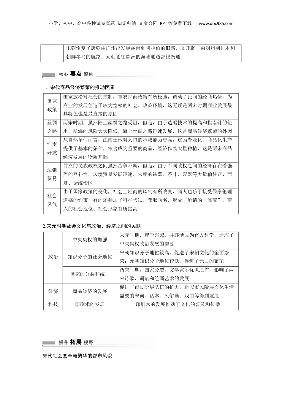 小学、初中、高中各种试卷真题知识归纳文案合同PPT等免费下载www.doc985.com微专题4中华文明的成熟与繁荣——辽宋夏金元时期辽宋夏金元时期(916—1368年),历经五代十国的分裂、辽宋夏金民族政权的并立,元朝走向统一。该时期封建国家由分裂逐步走向统一,民族交融进一步加强,封建经济继续发展,是中华文明逐步走向成熟的阶段政治宋朝加强中央集权,参知政事、枢密院和三司使分别分割宰相的行政权、军权和财权;设官分职体制中确立了职级与事类的分立体系,一定程度上保证了事权的明确与权力的集中;宋代科举制的进一步发展和崇文抑武政策的实施,使科举成为入仕的主要途径,大量平民阶层通过科举进入官僚集团。两宋时期,随着中央集权的加强,特权地主被庶族地主取代,佃农与地主的人身依附关系大大减弱。宋代制定严格的标准考核官员,监察制度的重要变化是台谏合一;宋代基本沿用唐朝法律体系,儒学人士以乡约教化乡里。北宋的统治危机主要表现在军事和财政两个方面;王安石变法一定程度上改变了宋朝积贫积弱的局面,但最终以失败告终。南宋偏安半壁江山的局面维持了较长的时间辽和西夏与北宋鼎峙,维持了较长时间统治的稳定;金朝入主中原,一度出现治世。蒙古建立元朝,完成了全国统一,行省制提高了行政效率,巩固了国家统一经济宋代,封建经济继续发展,农业、手工业的发展带来商品经济高度繁荣;南宋时期经济重心南移完成;对外交往以海路为主,海外贸易发达;坊市制度被打破,商业活动不再受时空限制;官府不再直接监管商业活动;北宋出现“交子”,与铜钱兼行。两宋时期,工商业者经营及定居的集镇发展起来封建生产方式向边疆地区进一步扩展,契丹、党项、女真等民族逐渐采用农业生产方式,边疆地区得到开发元代,将纸币作为单一流通货币来发行;漕运和海运发达,运河沿岸兴起很多工商业集镇科技思想文化宋元时期,科技成就突出,印刷术、指南针和火药三大发明基本成熟;宋代儒学复兴,更具哲学化和思辨化的程朱理学受到官方推崇;宋代书院是相对独立于官学之外的民间性学术研究和教育机构。随着市民阶层的崛起,两宋时期文学艺术平民化、世俗化的趋势更加明显,世俗文化逐渐成为文化艺术的主流民族关系和对外关系辽宋夏金元时期,民族政权并立,各政权之间有战有和,以和平交流为主,民族交融进一步加强;由民族政权并立、对峙到全国统一。辽南北面官制体现了因俗而治,兼顾不同民族的统治制度;元朝推行民族歧视和压迫政策,但不同民族的交往交流交融也得到了进一步加强小学、初中、高中各种试卷真题知识归纳文案合同PPT等免费下载www.doc985.com宋朝恢复了唐朝由广州出发经越南到阿拉伯的旧路,又开辟了由明州到日本和朝鲜半岛的航路。元朝通往欧洲的海陆通道都很畅通1.宋代商品经济繁荣的推动因素国家政策国家放松对社会的控制,重农抑商政策有所松弛,调动了民间的经商热情,为商业的发展创造了较为宽松的社会、政策环境,这无疑是两宋时期商业发展最具特色也是最直接的原因丝绸之路两宋时期,虽然陆上丝绸之路受阻,但是,由于造船技术的提高和指南针的使用,航海的风险大大降低,海上丝绸之路迅速发展,这是商品经济繁荣的外因江南开发从自然条件而言,江南土地对人口的承载能力更高,这为专业化、商品化生产提供了基本的条件,粮食成为重要的商品,经济作物大量种植,这是两宋商品经济发展的物质基础边疆贸易并立的民族政权之间虽然战争不断,但是,由于不同政权之间的经济存在着强烈的互补性,边境贸易发展迅速,宋朝的铁器、茶叶、瓷器等大量输往辽、西夏、金统治区社会风气由于国家政策的变化,社会上轻商的风气有所改变,商人也乐于接受儒家伦理道德的约束,有的还参加了科举考试,获取功名,形成了所谓的“儒商”,商人的社会地位、社会形象有所提高2.宋元时期社会文化与政治、经济之间的关联政治中央集权的加强宋元时期,理学兴起,并逐渐成为官方哲学,适应了中央集权政治发展的需要知识分子的社会地位宋朝知识分子地位较高,促进了宋朝文化的全面繁荣;元朝知识分子地位较低,促进了元曲的繁荣国家的分裂和统一两宋时期,国家分裂,文学家多忧世之作,...