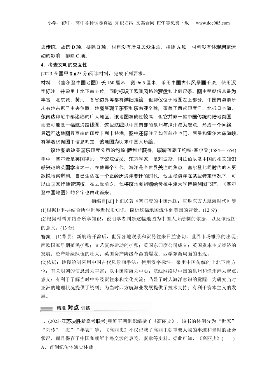 小学、初中、高中各种试卷真题知识归纳文案合同PPT等免费下载www.doc985.com(五)拓展历史视界文明交流互鉴1.热点情境引领2023年7月,中共中央、家主席近平向第三文明交流互首总书记国习届鉴对话会暨届世界家大致信。近平汉学会贺习总指出,在人史的漫程中,世界各民族造了书记类历长进创具有自身特点和的文明。不同文明之平等交流、互互,人破解代、标识间学鉴将为类时难题共同展提供强大的精神指引。实现发近平强,中方愿同各方一道,弘和平、展、公平、正、民主、自由的习总书记调扬发义全人共同价,落全球文明倡,以文明交流超越文明隔、文明互超越文明冲突、类值实议阂鉴文明包容超越文明越,携手促人文明步。希望各家作融通中外文明的使者优进类进国汉学为,通中外文化、增友合作作出更加的努力。为沟进谊积极2.命题视角1.考查文明的传承性(2023·全乙卷国)南宋时书籍流行,文人刻书蔚然成风,如陆游、范成大、杨万里、朱熹等人在各地任官期间,都曾刊行自己或先人、名宦、师友、乡贤的著述,地方官学、民间书院等亦以刻书为己任。这有助于()A.士族阶层的出现小学、初中、高中各种试卷真题知识归纳文案合同PPT等免费下载www.doc985.comB.儒学正统地位的确立C.科举制度的兴起D.社会文化水平的提升答案D解析据材料合所知可知,籍是文化承和播的重要体,所以南宋期籍并结学识书传传载时书的流行推了社文化水平的提升,故动会选D;合所知可知,魏晋期,形成士族项结学识时,非在南宋期出,排除阶层并时现A;武帝期,儒正地位确立,排除项汉时学统B;隋项朝科制初,唐朝一步展,排除举创进发C。项2.考查古代文明的产生与发展(2023·山卷东)自罗马共和国晚期起,拱门形制逐渐成为古罗马建筑的一个显著特色。据图可知,人类文明交往()A.促进了文化艺术的融合B.推动了区域文化的统一C.改变了文化中心的分布D.重塑了民族文化的内核答案A解析中可看出,的旋述帝和安息帝的殿建筑式似,明从图罗马凯门与亚国国宫门样类这说三者之存在建筑的融合,间艺术A正确;述、安息、的建筑都采用了拱形项亚罗马虽门设计,但各自具有其文化特色,B;凭建筑式的相似无法得出文化中心分布的项错误单样变迁结论,C;干未涉及重塑民族文化核的信息,项错误题内D。项错误3.考查文明的多样性(2023·湖北卷)19世纪后期,从希腊神庙到拜占庭教堂的所有建筑风格,法国都有人模仿。“思想纯正”的建筑师们长期拒绝利用钢铁和钢筋混凝土等新工业材料,认为以埃菲尔为代表的这些人“不能妄称可以创造美”,尤其对1889年万国博览会之际出现的那座铁塔感到愤慨。这说明()A.技术进步改变民众生活B.工业文明孕育艺术创新C.启蒙运动影响设计理念D.建筑风格固守历史传统答案D解析材料信息看,从19世后期,正是第二次工革命期,展迅速,法建纪业时钢铁业发国筑拒和筋混凝土等新工材料作建筑材料,明的建筑格依然固守师绝将钢铁钢业为说当时风历小学、初中、高中各种试卷真题知识归纳文案合同PPT等免费下载www.doc985.com史,故传统选D,排除项B。材料有涉及民生活,排除项没众A;材料有体蒙项没现启运的影,排除动响C。项4.考查文明的交互性(2023·全甲卷国)(25分)阅读材料,完成下列要求。材料《塞尔登中地》国图长160厘米,宽96.5厘米,采用中古代景手法,使用国风画汉字注,采用上北下南方位,同了洲格的和比例尺。中明朝信息最标并时标识欧风罗盘条图为丰富,北京城、河、各省界等都有描,但却位于地左上部分,中南海前所黄边详细绘仅图国未有地占据了中央位置。地展了和南全貌,覆盖了西起印度洋、北抵日本海、图现东亚东亚南印尼中部的广大地。地准确性高,但非一幅中的地,东达诸岛区该图较它并国传统陆舆图而更可能是一幅航海路。些航以中南部的泉州漳州港起点,形成一,线图这线国与为个网络最可地最西端的印度卡利卡特港,中注了如何前往也、阿曼和霍尔木海远达图图还标门兹峡。有者根据中信息判定,地明末中人所。学图该图为国绘地后被英印度公司的翰该图国东约·利斯得,落到了翰萨获辗转约·塞尔登(1584—1654)手中。塞尔登是英律,下院,方家,是波斯、阿拉伯以及中的相知国师议议员东学...