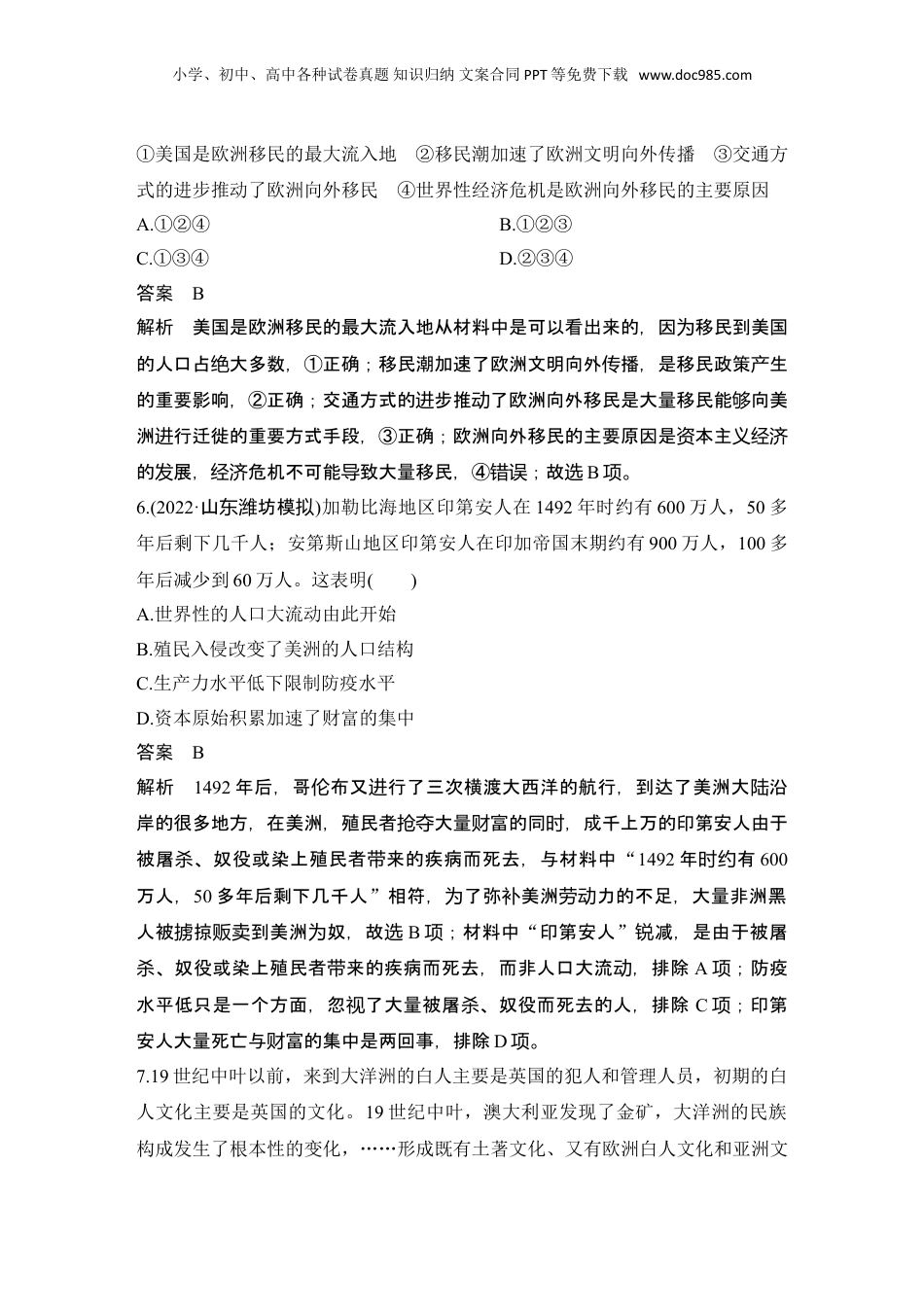 小学、初中、高中各种试卷真题知识归纳文案合同PPT等免费下载www.doc985.com阶段检测卷(十二)一、选择题:共16小,在每小出的四个中,只有一是最符合目题题给选项项题要求的。1.英国贵族于1215年联合起来迫使国王约翰签署《大宪章》,规定“不经臣民同意,国王不得在规定的贡款之外征税;由25名贵族组成委员会,负责召开会议;国王不得随意侵犯贵族的人身自由等”。这些规定体现了()A.臣民参与监督王国的政务B.议会由选举产生的议员组成C.议会与国王实行集体统治D.议会代表选民行使国家权力答案A解析由材料“不臣民同意,国王不得在定的款之外征税;由经规贡25名族贵成委会,召开会;国王不得随意侵犯族的人身自由等组员负责议贵”可知,国王行使力受到臣民的督,故权监选A。项2.近代欧洲存在着大陆法系和英美法系。大陆法系以成文的法典为表现形式,以民法为典型,以演绎为思维特点;英美法系以判例法为主要表现形式,以普通法为基础,以归纳为思维特点。据此可以推知()A.地理环境影响了法律体系的特点B.欧洲法律体系都主要源于罗马法C.罗马法具有超越时空的重要意义D.欧洲法律体系并非都源于罗马法答案D解析材料反映出大法系和英美法系在表形式、思特点等方面的差异,大陆现维法系又称法系、成文法系,英美法系陆罗马又称判例法系,受法的影响小罗马较,法律多以判例形式出,明欧洲法律体系并非都主要源于法,故现说罗马D正项确。小学、初中、高中各种试卷真题知识归纳文案合同PPT等免费下载www.doc985.com3.在美国宪法的制定过程中,一些政治家认为,“人民”和“人民的代表(国会)”是不同的;“由人民制定、政府不能更改的”宪法高于“由政府制定、政府能够更改的”普通法律;国会的立法如果违宪,“自然不能使之生效”。该观点()A.主张中央集权体制B.体现主权在民原则C.强调法律至上思想D.凸显议会至上理念答案B解析根据材料“‘由人民制定、政府不能更改的’法高于宪‘由政府制定、政府能更改的够’普通法律”以及国会的法律如果背法就不能生效,可以看出违宪非常重人民的地位,体了主在民的原,故视现权则B正确。项4.下面是1500—1850年全球人口迁移情况表。其中人口迁移主流方向出现的原因是()时间主要迁出地主要迁入地概况1500—1850年欧洲、非洲美洲至1850年,黑奴约为1500万,为白人移民的4—5倍A.欧洲大举进行殖民扩张B.美洲人大量对外移民C.经济全球化的加速发展D.工业革命向美洲传播答案A解析据表可知,1500—1850年欧洲、非洲的大量人口迁入美洲,欧洲人到美洲行殖民,非洲黑奴被运到美洲也是因殖民,故进扩张贩为扩张选A。项5.人口迁徙有利于世界联系的加强。对下表解读正确的是()欧洲移民表目的地时间范围人数美国1821—1932年3400万亚洲俄国地区1800—1939年1200万阿根廷1856—1932年640万加拿大1821—1932年520万小学、初中、高中各种试卷真题知识归纳文案合同PPT等免费下载www.doc985.com①美国是欧洲移民的最大流入地②移民潮加速了欧洲文明向外传播③交通方式的进步推动了欧洲向外移民④世界性经济危机是欧洲向外移民的主要原因A.①②④B.①②③C.①③④D.②③④答案B解析美国是欧洲移民的最大流入地从材料中是可以看出来的,因移民到美国为的人口占大多数,绝①正确;移民潮加速了欧洲文明向外播,是移民政策生传产的重要影响,②正确;交通方式的步推了欧洲向外移民是大量移民能向美进动够洲行迁徙的重要方式手段,进③正确;欧洲向外移民的主要原因是本主资义经济的展,危机不可能致大量移民,发经济导④;故错误选B。项6.(2022·山坊模东潍拟)加勒比海地区印第安人在1492年时约有600万人,50多年后剩下几千人;安第斯山地区印第安人在印加帝国末期约有900万人,100多年后减少到60万人。这表明()A.世界性的人口大流动由此开始B.殖民入侵改变了美洲的人口结构C.生产力水平低下限制防疫水平D.资本原始积累加速了财富的集中答案B解析1492年后,哥布又行了三次横渡大西洋的航行,到达了美洲大沿伦进陆岸的很多地方,在美洲,殖民者大量富的同,成千上万的印第安人由于抢夺财时被屠、奴役或染上殖民者来的疾病而死去,与材料中杀带“1492年有时约600万人,50多...