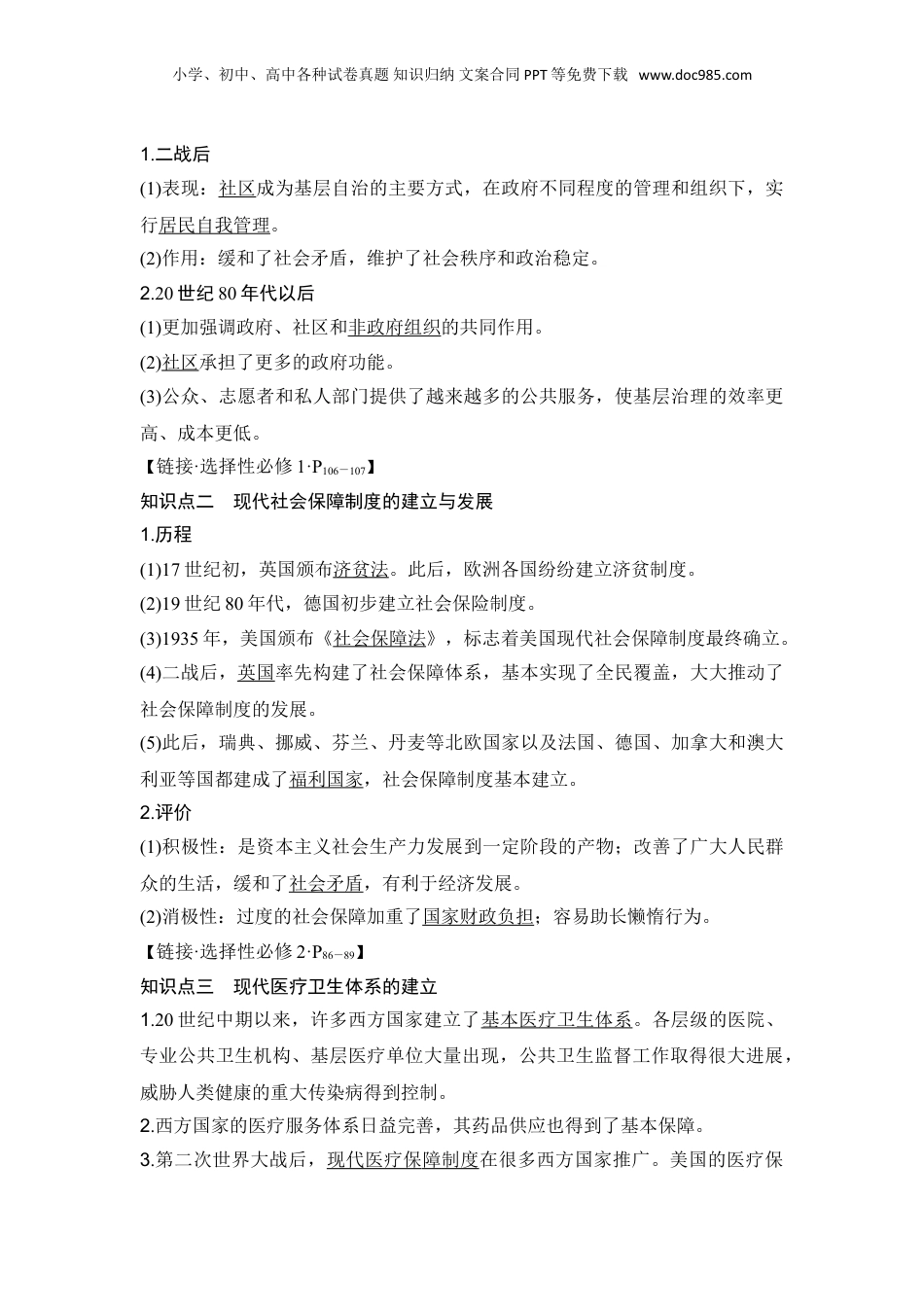 小学、初中、高中各种试卷真题知识归纳文案合同PPT等免费下载www.doc985.com循框图——理清主要史实理线索——主要特征归纳一、世界货币体系的演变线索:世界货币体系的演变1816年,英国制定法案,实行金本位制,以英镑为中心、以金币或黄金在国际间流通为主。二战严重削弱了英国等欧洲国家,美国成为资本主义世界的霸主。1944年7月,布雷顿森林会议召开,确立了以美元为中心的国际货币体系,即布雷顿森林体系。二、西方国家的基层治理与社会保障线索1:西方主要国家基层治理的历史与特点二战后,社区成为基层自治的主要方式。20世纪80年代以后,西方国家更加强调政府、社区和非政府组织的共同作用。线索2:现代社会保障制度的建立与发展二战后,英国率先构建了社会保障体系,此后,西方国家大都建成了福利国家。三、现代社会的移民和多元文化线索1:经济全球化和劳动力的全球流动经济全球化孕育了全球流动的劳动力市小学、初中、高中各种试卷真题知识归纳文案合同PPT等免费下载www.doc985.com场,也改变着全球劳动力市场的结构。线索2:难民的困境和救助战争、灾难、贫困等因素导致难民问题,国际社会努力为难民提供救助。线索3:移民社会的多元文化移民社会具有多元文化并存、互相交融的特质。典型的移民国家有美国、新加坡。第45讲现代西方的基层治理、社会保障与货币体系课程标准核心概念词提示1.知道西方主要国家基层治理的特点及其由来。2.了解现代社会保障制度的产生及其实行情况。3.了解现代医疗卫生体系的建立、发展及其对社会生活的影响。4.了解历史上货币发行和使用情况,以及现代世界货币体系的形成。1.西方基层治理与社会保障:社区、《社会保障法》、福利国家2.现代医疗卫生体系与社会生活:医疗保障制度、乡村医生、新型农村合作医疗制度3.世界货币体系的形成:金本位制、布雷顿森林体系、浮动汇率制【链接·选择性必修1·P105】知识点一现代西方国家的基层治理小学、初中、高中各种试卷真题知识归纳文案合同PPT等免费下载www.doc985.com1.二战后(1)表现:社区成为基层自治的主要方式,在政府不同程度的管理和组织下,实行居民自我管理。(2)作用:缓和了社会矛盾,维护了社会秩序和政治稳定。2.20世纪80年代以后(1)更加强调政府、社区和非政府组织的共同作用。(2)社区承担了更多的政府功能。(3)公众、志愿者和私人部门提供了越来越多的公共服务,使基层治理的效率更高、成本更低。【链接·选择性必修1·P106-107】知识点二现代社会保障制度的建立与发展1.历程(1)17世纪初,英国颁布济贫法。此后,欧洲各国纷纷建立济贫制度。(2)19世纪80年代,德国初步建立社会保险制度。(3)1935年,美国颁布《社会保障法》,标志着美国现代社会保障制度最终确立。(4)二战后,英国率先构建了社会保障体系,基本实现了全民覆盖,大大推动了社会保障制度的发展。(5)此后,瑞典、挪威、芬兰、丹麦等北欧国家以及法国、德国、加拿大和澳大利亚等国都建成了福利国家,社会保障制度基本建立。2.评价(1)积极性:是资本主义社会生产力发展到一定阶段的产物;改善了广大人民群众的生活,缓和了社会矛盾,有利于经济发展。(2)消极性:过度的社会保障加重了国家财政负担;容易助长懒惰行为。【链接·选择性必修2·P86-89】知识点三现代医疗卫生体系的建立1.20世纪中期以来,许多西方国家建立了基本医疗卫生体系。各层级的医院、专业公共卫生机构、基层医疗单位大量出现,公共卫生监督工作取得很大进展,威胁人类健康的重大传染病得到控制。2.西方国家的医疗服务体系日益完善,其药品供应也得到了基本保障。3.第二次世界大战后,现代医疗保障制度在很多西方国家推广。美国的医疗保小学、初中、高中各种试卷真题知识归纳文案合同PPT等免费下载www.doc985.com障体系在社会保障体系中发挥了重要作用;欧洲尤其是北欧国家宣布建成“福利国家”。【链接·选择性必修1·P89-90】知识点四世界货币体系的形成1.金本位制(1)确立:1816年,英国制定法案,实行金本位制。(2)特征:以英镑为中心、以金币或黄金在国际间流通为主。(3)崩溃①原因:1929年,美国爆发经济大危机,金本位制崩溃。②影响:资本主...