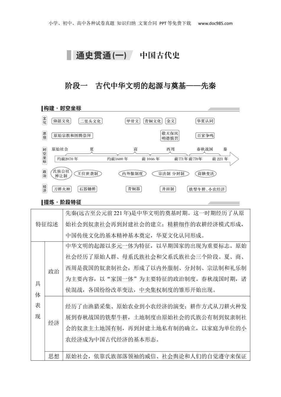 小学、初中、高中各种试卷真题知识归纳文案合同PPT等免费下载www.doc985.com阶段一古代中华文明的起源与奠基——先秦特征综述先秦(远古至公元前221年)是中华文明的奠基时期。这一时期经历了从原始社会到奴隶社会再到封建社会的建立;精耕细作的农耕经济模式形成,中国传统文化的基本精神基本奠定,华夏文化认同形成。具体表现政治中华文明的起源以多元一体为特征,以早期国家的出现为重要标志。原始社会经历了原始人群、母系氏族社会和父系氏族社会三个阶段。夏、商、西周是我国的奴隶制社会,形成了以内外服制、分封制、宗法制和礼乐制为主要内容,以“家国一体”为主要特征的政治制度。春秋战国时期,诸侯混战,各国纷纷改革变法,中央集权制度的雏形开始出现。经济经历了由渔猎采集、原始农业到小农经济的演变;耕作方式从刀耕火种发展到春秋战国的铁犁牛耕,土地制度由原始社会的氏族公有制到奴隶制社会的奴隶主土地国有制,再到封建土地私有制的确立,以家庭为单位的小农经济成为中国古代经济的基本形态。思想原始社会,依靠氏族部落领袖的威信、社会舆论和人们的自觉遵守来保证小学、初中、高中各种试卷真题知识归纳文案合同PPT等免费下载www.doc985.com文化社会规范的实施。殷人尊神事鬼、崇尚巫术,周人则“敬天保民”、“明德慎罚”、崇尚礼乐教化,民族认同、文化认同逐渐形成,甲骨文已成为一种成熟的文字体系。“百家争鸣”是中国历史上第一次思想解放运动,奠定了中国传统思想文化发展的基础。预测依托考古发现考查早期文化的传承1.(2022·辽宁大连高三双基测试)从新石器时代早期开始出现简单质朴的“龙”的形象至今,对每一个炎黄子孙来说,龙的形象一直是一种符号、一种意绪、一种血肉相连的情感。观察图1、图2,可以看出()A.玉器崇拜的统一性B.民族文化的多源性C.文字书写的传承性D.中华文明的延续性答案D解析据材料“的形象一直是一符、一意、一血肉相的情感龙种号种绪种连”并合结图1和图2可知,中的有一定相似性,明中文明是延的,故两图龙说华续选D;据材料,项图1是玉而图2是刻在甲骨上的文字,二者材不同,不能明质说玉器崇拜的一性,排除统A;材料主旨是的形象的延,体的是文化的项龙续现共性,而非多源性,排除B;据材料可知,项图1是玉器而非文字,排除C项。预测从文明演进角度考查早期的农耕生产2.(2022·北京海淀区一模)《史记·五帝本纪》写道:“炎帝欲侵陵诸侯,诸侯咸归轩辕。”轩辕即黄帝,轩辕采取了“修德振兵”“艺五种(种植五谷),抚万民,度四方”等一系列措施,增强了自身的力量,然后“与炎帝战于阪泉之野”,最小学、初中、高中各种试卷真题知识归纳文案合同PPT等免费下载www.doc985.com终战胜了炎帝。上述传说反映了()A.仰韶文化前期部落间战争频繁B.黄帝部落以从事农耕生产为主C.黄帝的胜利标志万邦时代结束D.华夏族形成后与周边族群交流答案B解析根据“炎帝欲侵陵侯,侯咸诸诸归轩辕”“修德振兵”“五艺种(植五种谷),万民,度四方抚”可知,帝部落重生,以事耕生主,黄视农业产从农产为B正确;材料不能体仰韶文化前期部落繁,排除项现间战争频A;项C中的项“标志”法,排除;材料有体交流,排除说错误没现D。故项选B。项预测从史料实证角度考查早期的治国理念3.(2022·辽宁沈阳二模)《礼记·王制》云:“……天地寒暖燥湿,广谷大川异制。民生其间者异俗……”西周封建着眼于天、地、人,尊“地之义”“民之行”“修其教,不易其俗;齐其政,不易其宜”,以求“藏天下于地方,由地方以见天下”。据此可知,西周封建()A.消弭了地域间的文化差异B.源于自然风土民情C.秉持天下一家的治国理念D.以神权政治为核心答案C解析材料大意是根据候的寒暖燥,广的山谷或大河等地理件,采取不气湿宽条同的建制。人民生活在其中有不同的俗。西周封建注重他行方面的习对们进礼义化,而无改他原有的俗;注重政令的一,而无改他的生活教须变们习统须变们习,以到天下即地方,地方即天下。体出惯达这现“因俗而治,天下一家”,C项正确;A表述,排除;西周封建的出点是固治,排除项绝对发巩统B;神在项权材料中未体,排除并现D。故项选C。项预测...