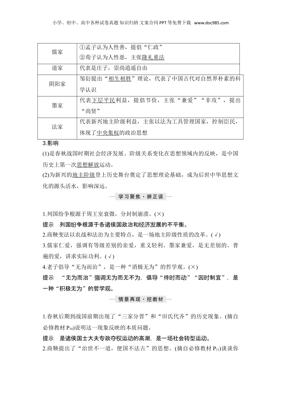 小学、初中、高中各种试卷真题知识归纳文案合同PPT等免费下载www.doc985.com第2讲诸侯纷争与变法运动课程标准核心概念词提示1.通过了解春秋战国时期的经济发展和政治变动,理解战国时期变法运动的必然性。2.了解老子、孔子学说;通过孟子、荀子、庄子等了解“百家争鸣”的局面及其意义。1.春秋时期:春秋五霸、三家分晋、铁农具、孔子、“仁”、“为政以德”、老子、“道”、无为而治、士阶层2.战国时期:战国七雄、华夏认同、商鞅变法、废井田、县制、“仁政”、隆礼重法、“兼爱”、中央集权知识点一列国纷争与华夏认同1.列国纷争(1)概况:“春秋五霸”“三家分晋”“田氏代齐”“战国七雄”。(2)影响:周朝传统的政治秩序完全被破坏。2.华夏认同(1)时间:春秋到战国时期。(2)表现:春秋时期,在频繁往来和密切联系中,产生了华夏认同观念。战国之后,戎狄蛮夷逐渐融入华夏族。知识点二经济发展与变法运动1.经济发展(1)农业:铁制农具开始使用,牛耕推广,兴建水利工程。(2)工商业:手工业分工细密,货币流通广泛,涌现出一批中心城市。2.变法运动——商鞅变法时间开始于公元前356年目的富国强兵小学、初中、高中各种试卷真题知识归纳文案合同PPT等免费下载www.doc985.com内容①重农抑商,奖励耕织;奖励军功,剥夺和限制贵族特权②强制大家庭拆散为个体小家庭③“废井田、开阡陌”,授田于百姓④实行什伍连坐,互相纠察告发⑤普遍推行县制,主要官员由君主任免结果秦国国富兵强,为秦统一中国奠定了基础【链接·选择性必修1·P30】3.官员选拔(1)世官制:西周至春秋官位世袭的制度,贵族世代垄断高官。(2)举荐和军功授爵制①背景:春秋战国时期,尚贤思想兴起,各国争霸图强。②方式:举荐有才能的人为官,或依据军功大小授予官职。知识点三孔子和老子1.孔子(1)主要思想①核心观念是“仁”,主张“为政以德”。②主张恢复西周等级森严的礼乐制度。③承认制度随着时代变化应当有所改良。(2)教育成就①“有教无类”,打破了贵族阶层垄断文化教育的局面,推动了私学的发展。②整理文献,对夏、商、西周的文化传承作出了重要贡献。2.老子(1)思想(2)著作:《老子》。知识点四百家争鸣1.历史背景(1)经济:社会经济的发展。(2)阶级关系:旧的贵族等级体系开始瓦解,新兴的士阶层崛起。(3)统治者重视:各国统治者礼贤下士,争相招揽人才。2.重要派别小学、初中、高中各种试卷真题知识归纳文案合同PPT等免费下载www.doc985.com儒家①孟子认为人性善,提倡“仁政”②荀子认为人性恶,主张隆礼重法道家代表是庄子,崇尚逍遥自由阴阳家邹衍提出“相生相胜”理论,代表了中国古代对自然界朴素的科学认识墨家代表下层平民利益,提倡节俭,主张“兼爱”“非攻”,提出“尚贤”法家代表新兴地主阶级利益,主张以法为工具管理国家,控制臣民,体现了中央集权的政治思想3.影响(1)是春秋战国时期社会经济发展、阶级关系变化在思想领域内的反映,是中国历史上第一次思想解放运动。(2)为新兴的地主阶级登上历史舞台奠定了思想理论基础,成为后世中华思想文化的源头活水,影响深远。1.列国纷争根源于周王室衰微,分封制崩溃。(×)提示列国争根源于各侯国政治和展的不平衡。纷诸经济发2.商鞅变法以农战和法治为主要特点,是一场地主阶级性质的改革。(√)3.儒家仁爱,强调有等级差别的亲爱,重义轻利。墨家兼爱,是无差别的、普遍的爱,讲求实际功利。(√)4.老子倡导“无为而治”,是一种“消极无为”的哲学观。(×)提示“无而治为”无而无不,倡强调为为导“待而时动”“因制宜时”,是一种“极无积为”的哲学。观1.春秋后期到战国前期出现了“三家分晋”和“田氏代齐”的历史现象。(摘自必修教材P10)说明这一现象反映的本质问题。提示是侯国士大夫政运的高潮,是一社会型运。诸专夺权动场转动2.商鞅提出了“治世不一道,便国不法古”的思想。(摘自必修教材P11)谈谈你小学、初中、高中各种试卷真题知识归纳文案合同PPT等免费下载www.doc985.com对商鞅变法思想的认识。提示表达了商鞅敢于挑旧念的新精神,体了商鞅法代潮战陈观创现变顺应时流的步性。进3.百家争鸣是社会大变革在意识形态上的反映。(摘自必...
