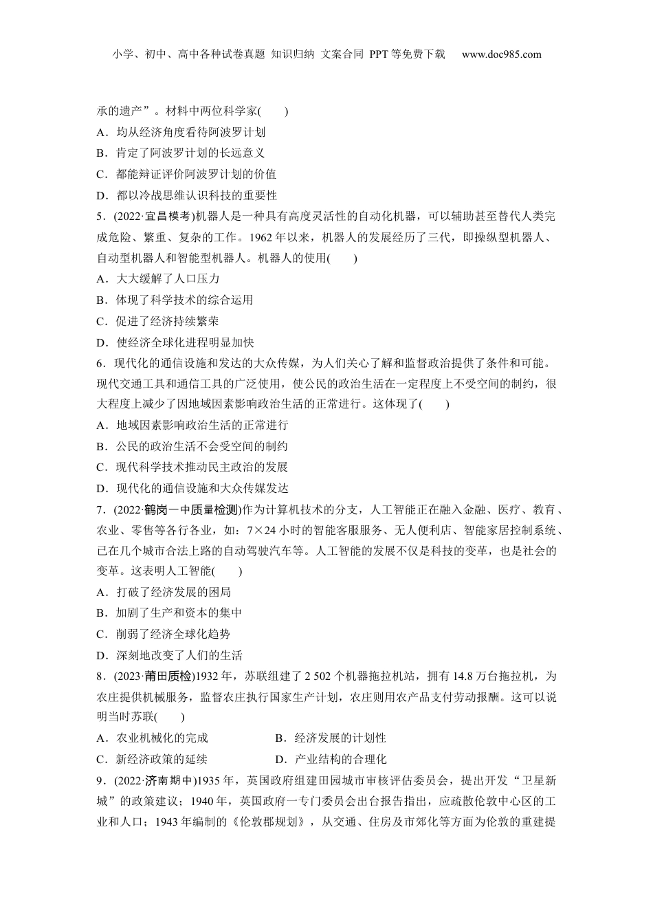 小学、初中、高中各种试卷真题知识归纳文案合同PPT等免费下载www.doc985.com一、选择题(每题3分,共36分)1.(2023·坊潍质检)1945年,联合国粮食及农业组织成立。该组织早期着重于粮农生产和贸易的情报信息工作。20世纪70年代以后,逐渐将工作重点转向帮助发展中国家制定农业发展政策和战略以及为发展中国家提供技术援助。这一变化()A.减缓了发展中国家的工业化进程B.基于世界经济新秩序的建立C.反映了发达国家已解决粮食问题D.有利于消除饥饿目标的实现2.(2022·衡水期末)某学生在学习过程中整理了如下表格。据此可知()时间国家法律1860年英《食品与饮料掺假法》1906年美《纯净食品和药品法》2003年日《食品卫生法》2018年中《中华人民共和国食品安全法》(2018年修正)A.食品安全的监管水平得到提高B.杜绝了食品安全事故的发生C.国家以法律手段保障食品安全D.世界各国政府重视食品安全3.(2022·定育才校模考远县学)19世纪50年代,纽约消费者对牛奶的需求不断增加,一种“儿童卫生奶”在纽约市场上打响。奶农们将奶牛关在狭小、潮湿的牛圈里,将酿酒厂的酒糟喂给它们,把污水、臭鸡蛋、淀粉等混入牛奶,用蜂蜜、糖浆等来掩盖异色、异味。这种“泔水奶”虽然被不断打击,但直到19世纪末巴氏低温消毒法的普及,才最终在历史的洪流中销声匿迹。这说明()A.食品储备技术进步增加食品供给B.美国政府完全忽视食品安全保障C.市场需求导致出现食品安全问题D.保障食品安全需要发挥多维力量4.(2022·岩一中月考龙)美国某科学家指出:“阿波罗计划促进了计算机工业的迅速发展,该产业的收益从1969年的10亿美元增加到1972年的80亿美元。”另一科学家这样评价阿波罗计划,“肯尼迪总统的愿望实现了,只是代价过高。可以说,阿波罗计划是一份难以继小学、初中、高中各种试卷真题知识归纳文案合同PPT等免费下载www.doc985.com承的遗产”。材料中两位科学家()A.均从经济角度看待阿波罗计划B.肯定了阿波罗计划的长远意义C.都能辩证评价阿波罗计划的价值D.都以冷战思维认识科技的重要性5.(2022·宜昌模考)机器人是一种具有高度灵活性的自动化机器,可以辅助甚至替代人类完成危险、繁重、复杂的工作。1962年以来,机器人的发展经历了三代,即操纵型机器人、自动型机器人和智能型机器人。机器人的使用()A.大大缓解了人口压力B.体现了科学技术的综合运用C.促进了经济持续繁荣D.使经济全球化进程明显加快6.现代化的通信设施和发达的大众传媒,为人们关心了解和监督政治提供了条件和可能。现代交通工具和通信工具的广泛使用,使公民的政治生活在一定程度上不受空间的制约,很大程度上减少了因地域因素影响政治生活的正常进行。这体现了()A.地域因素影响政治生活的正常进行B.公民的政治生活不会受空间的制约C.现代科学技术推动民主政治的发展D.现代化的通信设施和大众传媒发达7.(2022·一中量鹤岗质检测)作为计算机技术的分支,人工智能正在融入金融、医疗、教育、农业、零售等各行各业,如:7×24小时的智能客服服务、无人便利店、智能家居控制系统、已在几个城市合法上路的自动驾驶汽车等。人工智能的发展不仅是科技的变革,也是社会的变革。这表明人工智能()A.打破了经济发展的困局B.加剧了生产和资本的集中C.削弱了经济全球化趋势D.深刻地改变了人们的生活8.(2023·田莆质检)1932年,苏联组建了2502个机器拖拉机站,拥有14.8万台拖拉机,为农庄提供机械服务,监督农庄执行国家生产计划,农庄则用农产品支付劳动报酬。这可以说明当时苏联()A.农业机械化的完成B.经济发展的计划性C.新经济政策的延续D.产业结构的合理化9.(2022·南期中济)1935年,英国政府组建田园城市审核评估委员会,提出开发“卫星新城”的政策建议;1940年,英国政府一专门委员会出台报告指出,应疏散伦敦中心区的工业和人口;1943年编制的《伦敦郡规划》,从交通、住房及市郊化等方面为伦敦的重建提小学、初中、高中各种试卷真题知识归纳文案合同PPT等免费下载www.doc985.com出了解决方案。这些政策建议的出现说明英国()A.工业化带来的城市病比较严重B.城市遭到战争严重破坏C.传统的自由主义...