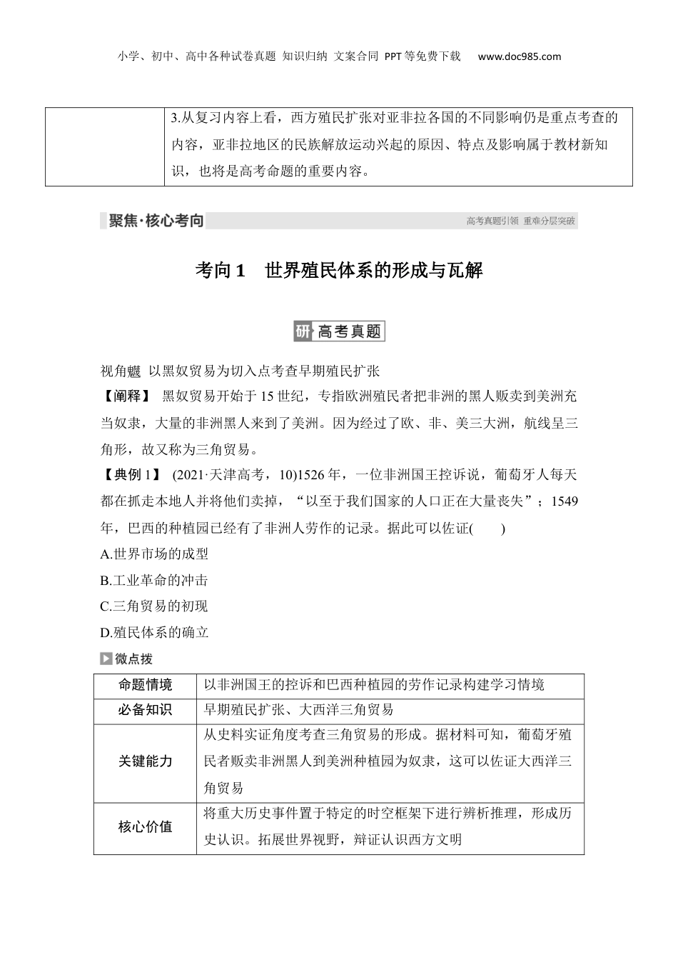 小学、初中、高中各种试卷真题知识归纳文案合同PPT等免费下载www.doc985.com专题十三屈辱到独立——世界殖民体系的演进与亚非拉民族国家的崛起命题统计命题要点2022年2021年2020年热考角度世界殖民体系的形成与瓦解①湖南·T19·世界殖民体系的瓦解②广东·T12·荷兰在早期殖民扩张中崛起①湖南·T18·1870年到1914年间的殖民扩张推动经济全球化②福建·T14·西方存在固有的种族偏见①北京·T18·英国的殖民扩张与工业革命②山东·T19·17世纪英国的对外殖民扩张③海南·T23·西欧的殖民扩张亚非拉民族民主运动的高涨①湖南·T19·亚非拉民族解放运动的高涨②浙江·T29·西方殖民扩张与印度的民族解放运动③山东·T13·亚洲觉醒的目标①北京·T7·列宁提到辛亥革命对亚洲的影响②山东·T15·不结盟运动的发展③湖北·T16·尼日利亚作家对民族文化认同的忧虑①天津·T18·凡尔赛—华盛顿体系下的亚非拉民族解放运动②海南·T19·二战后拉美外交政策的不断调整命题分析1.从命题形式上看,以主观题命题形式为主,选择题涉及内容较少,史料形式以文字史料和数据表格为主,重点考查学生对史料信息的获取和解读能力,以及发现问题、论证观点的探究能力。2.从命题内容上看,西方殖民扩张的特点和影响是考查的核心区域,亚非拉地区的民族解放运动也有所涉及。小学、初中、高中各种试卷真题知识归纳文案合同PPT等免费下载www.doc985.com3.从复习内容上看,西方殖民扩张对亚非拉各国的不同影响仍是重点考查的内容,亚非拉地区的民族解放运动兴起的原因、特点及影响属于教材新知识,也将是高考命题的重要内容。考向1世界殖民体系的形成与瓦解视角以黑奴贸易为切入点考查早期殖民扩张【阐释】黑奴贸易开始于15世纪,专指欧洲殖民者把非洲的黑人贩卖到美洲充当奴隶,大量的非洲黑人来到了美洲。因为经过了欧、非、美三大洲,航线呈三角形,故又称为三角贸易。【典例1】(2021·天津高考,10)1526年,一位非洲国王控诉说,葡萄牙人每天都在抓走本地人并将他们卖掉,“以至于我们国家的人口正在大量丧失”;1549年,巴西的种植园已经有了非洲人劳作的记录。据此可以佐证()A.世界市场的成型B.工业革命的冲击C.三角贸易的初现D.殖民体系的确立命题情境以非洲国王的控诉和巴西种植园的劳作记录构建学习情境必备知识早期殖民扩张、大西洋三角贸易关键能力从史料实证角度考查三角贸易的形成。据材料可知,葡萄牙殖民者贩卖非洲黑人到美洲种植园为奴隶,这可以佐证大西洋三角贸易核心价值将重大历史事件置于特定的时空框架下进行辨析推理,形成历史认识。拓展世界视野,辩证认识西方文明小学、初中、高中各种试卷真题知识归纳文案合同PPT等免费下载www.doc985.com答案C视角从香皂广告切入,考查美国的种族主义【阐释】从1619年贩卖进北美大陆的第一批黑奴开始,美国政府就开始了对黑人的种族歧视。在北美殖民地时期,对非洲黑人奴隶的贩卖和奴役构成了资本原始积累的重要内容。美国独立后,南方诸州种植园主仍然实行奴隶制。1862年,林肯发表《解放黑人奴隶宣言》,宣布黑人奴隶获得自由,但美国国内长期存在种族歧视问题。【典例2】(2021·福建高考,14)1884年,美国某公司推出一则主题为“给非洲带去文明”的香皂广告。此后近30年间,该公司的广告经常宣称,使用其香皂可以让非洲人皮肤变白,变得文明。同时期,法国和希腊的老牌香皂公司也声称其产品能“让黑人变白”。这主要体现了西方()A.推广欧美生活方式B.存在着固有的种族偏见C.重视争夺非洲市场D.旨在推动非洲文明进步命题情境以欧美香皂广告的内容构建学习情境必备知识西方国家的种族歧视关键能力从史料实证和历史解释角度考查欧美的种族歧视现象。材料“给非洲带去文明……让黑人变白”体现的是西方国家对非洲黑人的歧视核心价值运用历史的观点、方法观察和分析社会历史现象,形成理性思维,培养正确的人生观、价值观,增强人文意识答案B1.近代西方国家殖民扩张的特点(1)葡萄牙:以侵占军事据点、建立商站为主,同时利用武力垄断商路、暴力掠夺和敲诈勒索来获取财富。小学、初中、高中各种试卷真题知识归纳文案合同PPT等免费下载www.doc985...