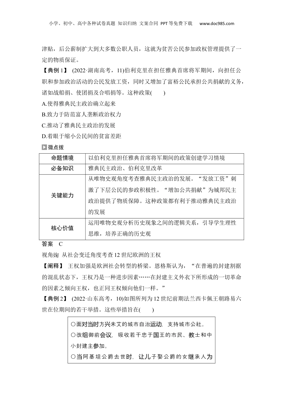 小学、初中、高中各种试卷真题知识归纳文案合同PPT等免费下载www.doc985.com专题九贵族到民主——西方国家的政治制度与社会治理命题统计命题要点2022年2021年2020年热考角度西方政治制度与文官制度①湖南·T11·雅典民主政治②湖南·T13·美国与德意志的联邦制度③浙江·T19·美国“制约与平衡”原则④浙江·T27·古希腊城邦与民主政治⑤山东·T10·中世纪王权的加强①北京·T11·苏格拉底与雅典民主②北京·T18·美国共和制的确立③湖南·T15·美国三权分立体制④湖北·T20·法国大革命与三色旗⑤广东·T13·法兰西代议制度的曲折发展⑥山东·T10·雅典公民大会的职能⑦河北·T13·美国联邦政府①北京·T11·雅典民主政治②天津·T10·雅典公民的权利义务③山东·T10·雅典参政的公民群体④海南·T15·德意志帝国的君主立宪制⑤浙江·T17·光荣革命的意义小学、初中、高中各种试卷真题知识归纳文案合同PPT等免费下载www.doc985.com的权威西方基层治理与社会保障①山东·T12·反对政府对经济的过多干预①天津·T9·罗马货币兼具的经济政治功能②河北·T11·古罗马城市治理实践丰富罗马法西方法律教化与民族国家①浙江·T16·罗马万民法的作用②广东·T14·1871年《德意志帝国宪法》①湖南·T12·罗马法债权转移②河北·T11·罗马法的发展③北京·T13·俄法战争和拿破仑④福建·T13·明治维新与文明开化⑤浙江·T19·拿破仑编纂《民法典》①海南·T14·欧美国家法律蕴含人文主义精神②浙江·T16·西塞罗的自然法体系③浙江·T20·法国1875年共和国宪法命题分析1.从命题形式上看,以选择题形式为主,以文字材料为载体,创设历史新情境,考查学生对材料隐形信息的获取、解读以及论证和探讨问题的能力,尤其是运用辩证思维看待历史问题的能力。2.从命题内容上看,雅典民主政治中的公民群体、公民大会、放逐法以及近代资产阶级代议制是本专题考查的重点内容。3.从复习内容上看,罗马法的形成、特点及对后世的影响,近代资产阶级代议制的运行特点及影响,是复习备考的重点内容。考向1西方国家的政治制度与文官制度视角从经济角度考查雅典民主政治【阐释】伯利克里执政时期实行公薪制。最初,由国家给予陪审法官每日生活小学、初中、高中各种试卷真题知识归纳文案合同PPT等免费下载www.doc985.com津贴,后公薪制扩大到大多数公职人员,这就为贫苦公民参加政权管理提供了一定的物质保证。【典例1】(2022·湖南高考,11)伯利克里在担任雅典首席将军期间,向担任公职和参加政治活动的公民发放工资,同时又增加了富裕公民承担公共捐献的义务,诸如战船捐、使团捐及合唱捐等。这种政策()A.使得雅典民主政治确立起来B.致力于防范富人垄断政治权力C.推动了雅典民主政治的发展D.着眼于缩小公民间的贫富差距命题情境以伯利克里担任雅典首席将军期间的政策创建学习情境必备知识雅典民主政治、伯利克里改革关键能力从唯物史观角度考查雅典民主政治的发展。“发放工资”刺激了下层公民的参政积极性。“增加公共捐献”为城邦民主政治提供了物质保障。这种政策都有利于推动雅典民主政治的发展核心价值运用唯物史观分析历史现象之间的逻辑关系,引导学生理性思维,培养正确的历史观答案C视角从社会变迁角度考查12世纪欧洲的王权【阐释】王权加强是欧洲社会转型的桥梁。恩格斯认为,“在普遍的封建割据的混乱状态下,王权乃是一种进步因素……在封建主义外衣下所形成的一切革命的因素之倾向王权,也正同王权倾向他们一样。”【典例2】(2022·山东高考,10)如图所列为12世纪前期法兰西卡佩王朝路易六世在位期间的若干举措。这些举措旨在()○面方未艾的城市自治,支持城市公社。对当时兴运动○改御前,吸收若干忠于王的市民、士和中组会议国教小封建主加。参○阿基坦公爵去世,子娶公爵的女承人当时让儿继为小学、初中、高中各种试卷真题知识归纳文案合同PPT等免费下载www.doc985.com妻,借此控制阿基坦的土。领A.推动城市崛起B.加强国王权力C.建立民族国家D.发展庄园经济命题情境以法兰西卡佩王朝路易六世在位期间的若干举措创设学习情境必备知识中古欧洲的发展,12世纪的城市自治运动关键能力从史料实...