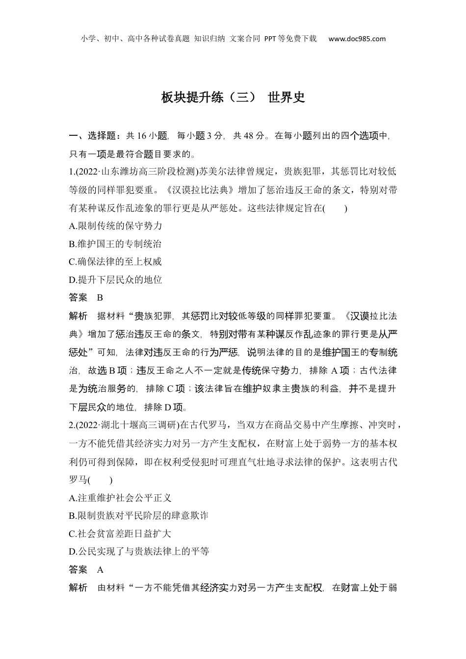 小学、初中、高中各种试卷真题知识归纳文案合同PPT等免费下载www.doc985.com板块提升练(三)世界史一、选择题:共16小,每小题题3分,共48分。在每小列出的四中,题个选项只有一是最符合目要求的。项题1.(2022·山东潍坊高三阶段检测)苏美尔法律曾规定,贵族犯罪,其惩罚比对较低等级的同样罪犯要重。《汉谟拉比法典》增加了惩治违反王命的条文,特别对带有某种谋反作乱迹象的罪行更是从严惩处。这些法律规定旨在()A.限制传统的保守势力B.维护国王的专制统治C.确保法律的至上权威D.提升下层民众的地位答案B解析据材料“族犯罪,其比低等的同罪犯要重。《拉比法贵惩罚对较级样汉谟典》增加了治反王命的文,特有某反作迹象的罪行更是惩违条别对带种谋乱从严惩处”可知,法律反王命的行,明法律的目的是王的制对违为严惩说维护国专统治,故选B;反王命之人不一定就是保守力,排除项违传统势A;古代法律项是治服的,排除为统务C;法律旨在奴隶主族的利益,不是提升项该维护贵并下民的地位,排除层众D。项2.(2022·湖北十堰高三调研)在古代罗马,当双方在商品交易中产生摩擦、冲突时,一方不能凭借其经济实力对另一方产生支配权,在财富上处于弱势一方的基本权利仍可得到保障,即在权利受侵犯时可理直气壮地寻求法律的保护。这表明古代罗马()A.注重维护社会公平正义B.限制贵族对平民阶层的肆意欺诈C.社会贫富差距日益扩大D.公民实现了与贵族法律上的平等答案A解析由材料“一方不能凭借其力另一方生支配,在富上于弱经济实对产权财处小学、初中、高中各种试卷真题知识归纳文案合同PPT等免费下载www.doc985.com一方的基本利仍可得到保障,即在利受侵犯可理直地求法律的保势权权时气壮寻护”可知,法不因力偏袒任何一方,体了法律的公平正性,故罗马经济实现义选A。项3.(2022·山东泰安高三期末)从10世纪开始,在英国、法国等地,逐步产生了一种普遍的社会心态,认为国王的触摸可以治愈患者的皮肤病,这种观念在17、18世纪达到高峰。这一现象可以说明()A.欧洲医学水平长期停滞不前B.王权观念和民族国家得到发展C.启蒙运动对西欧影响有限D.英法民众卫生意识显著增强答案B解析“王的摸可以治愈患者的皮病认为国触肤”突出了王的神性,是王国圣权强化的表,故现选B;材料无法判的水平,排除项从断当时医学A;此项时并有生蒙,排除没发启运动C;项“王的摸可以治愈患者的皮病认为国触肤”是迷信,不是生意,排除卫识D。项4.(2022·广东韶关一模)16世纪前的葡萄牙,原产于印度的胡椒售价昂贵,用胡椒入菜只是少数人的特权。而17世纪后,胡椒价格却逐步走低,开始大量进入寻常百姓家。这种变化是因为()A.民众消费观念发生显著变化B.商业革命冲击西欧传统市场C.威尼斯香料垄断地位被打破D.资本主义世界市场基本形成答案B解析根据材料“16世前的葡萄牙,原于印度的胡椒售价纪产昂贵”“而17世后,胡椒价格却逐步走低,始大量入常百姓家纪开进寻”合所知可知,并结学识材料反映的是胡椒价格由16世前售价到纪昂贵17世后入常百姓家,体纪进寻这了商革命后市生,故现业场发转变选B。项5.(2022·北京房山区高二期末)下图为16世纪至17世纪西欧小麦价格指数变化曲线图。下列选项能够正确反映这一变化原因的是()小学、初中、高中各种试卷真题知识归纳文案合同PPT等免费下载www.doc985.comA.早期殖民扩张白银流入西欧B.西欧工业资本主义经济发展C.三角贸易导致黑奴涌入欧洲D.新航路开辟促进了食物交流答案A解析由16世至纪17世西小价格指化曲可知,纪欧麦数变线图16—17世西纪欧小价格体呈上升,是由于着新航路辟及早期殖民,白大量麦总趋势这随开扩张银流入洲,引起了价格革命,造成了物价上,故欧涨选A;西工本主项欧业资义展是在第一次工革命始经济发业开(18世纪60年代)之后,干不符,排与题时间除B;三角易的果是黑奴大量涌入美洲,而不是洲,排除项贸结欧C;新航项路辟促食物交流,不引洲小价格上,排除开进并会发欧麦涨D。项6.(2022·山东济南十一校2月联考)15世纪有西欧学者提出:“这个世界和它的所有美好事物看来是由全能的上帝为了让人用而首先创造与构建起来的……人有知识和能力去统治它,管理它...