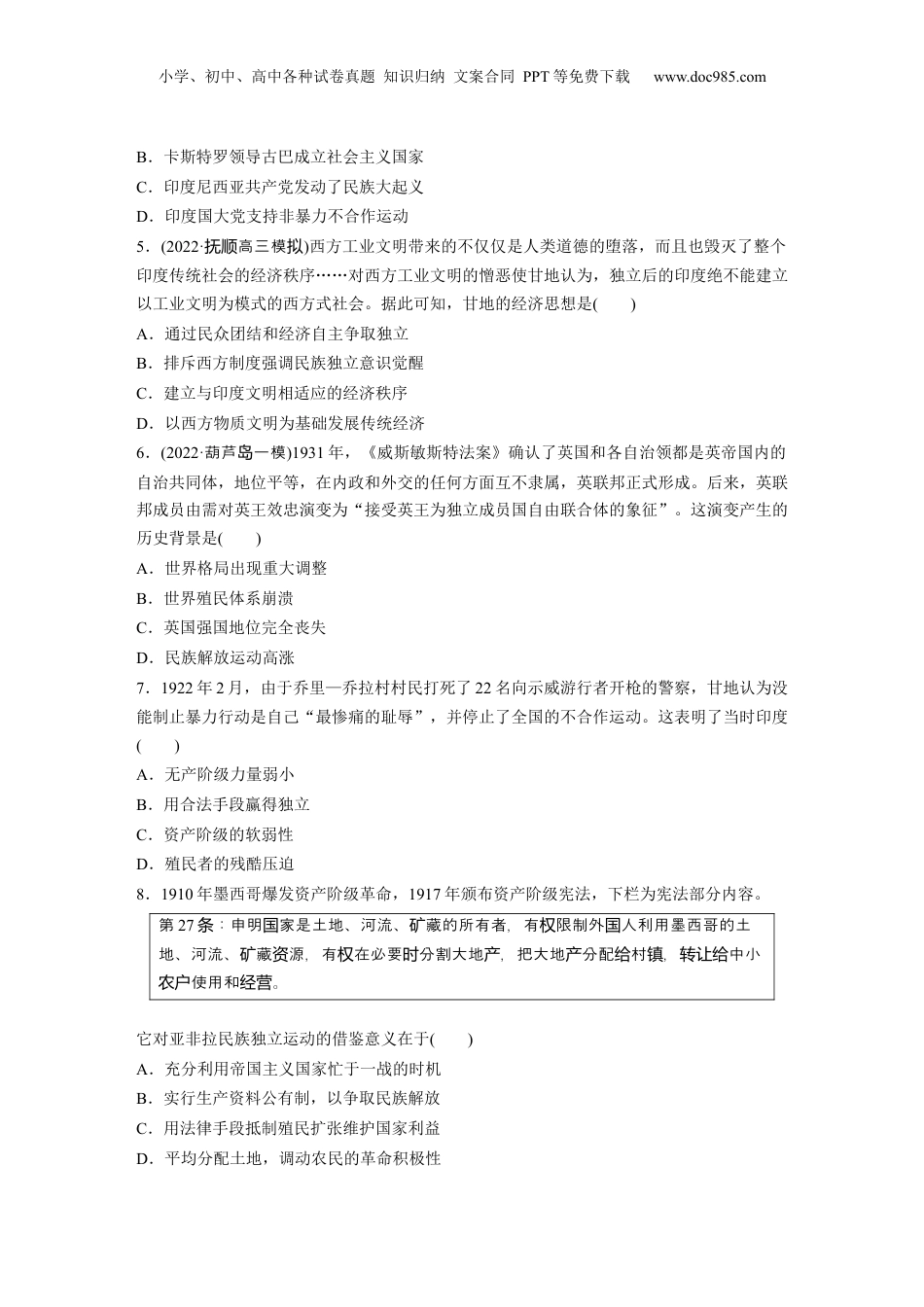 小学、初中、高中各种试卷真题知识归纳文案合同PPT等免费下载www.doc985.com一、选择题(每题3分,共36分)1.(2022·坊模潍拟)下表反映了一战后亚洲各地区的革命新气象,这主要得益于()地区内容东亚中国共产党领导中国人民进行反帝反封建斗争东南亚越南掀起了反抗法国殖民统治的斗争西亚伊拉克、叙利亚等地爆发了反对英法占领的斗争南亚印尼共产党领导工农反对荷兰殖民统治A.亚洲民族忧患意识的觉醒B.世界殖民体系的瓦解C.帝国主义国际新秩序建立D.十月革命胜利的效应2.(2023·厦十中高三身考门双学热试)20世纪初兴起的亚洲革命风暴,是继19世纪初拉丁美洲革命风暴之后的全世界历史新阶段的重大标志性事件,是第三世界历史进程中的历史性开端。列宁把这次革命风暴称为“亚洲觉醒”。之所以被称为“亚洲觉醒”,主要是因为()A.民族资产阶级成为革命领导阶级B.无产阶级开始登上政治舞台C.社会主义国家地理范围不断扩大D.革命后各国实现了民族独立3.(2023·沈三模阳)1930年1月30日,甘地向英印政府提出11条要求,主要包括降低田赋、保护关税以限制外国布和服装的进口、废除食盐专卖法和盐税、释放政治犯等。甘地意在()A.摆脱经济危机对印度的冲击B.团结广大阶层争取民族独立C.发展印度经济摆脱英国控制D.展示非暴力不合作运动4.(2022·北京丰台高三第二期合区学综)第一次世界大战后,殖民地半殖民地人民的民族解放运动“超越资产阶级民主主义范畴,开始注入新的内容,有了新的方向”。以下史实符合这一特点的是()A.俄国十月革命和社会主义建设的实践小学、初中、高中各种试卷真题知识归纳文案合同PPT等免费下载www.doc985.comB.卡斯特罗领导古巴成立社会主义国家C.印度尼西亚共产党发动了民族大起义D.印度国大党支持非暴力不合作运动5.(2022·高三模抚顺拟)西方工业文明带来的不仅仅是人类道德的堕落,而且也毁灭了整个印度传统社会的经济秩序……对西方工业文明的憎恶使甘地认为,独立后的印度绝不能建立以工业文明为模式的西方式社会。据此可知,甘地的经济思想是()A.通过民众团结和经济自主争取独立B.排斥西方制度强调民族独立意识觉醒C.建立与印度文明相适应的经济秩序D.以西方物质文明为基础发展传统经济6.(2022·葫芦一模岛)1931年,《威斯敏斯特法案》确认了英国和各自治领都是英帝国内的自治共同体,地位平等,在内政和外交的任何方面互不隶属,英联邦正式形成。后来,英联邦成员由需对英王效忠演变为“接受英王为独立成员国自由联合体的象征”。这演变产生的历史背景是()A.世界格局出现重大调整B.世界殖民体系崩溃C.英国强国地位完全丧失D.民族解放运动高涨7.1922年2月,由于乔里—乔拉村村民打死了22名向示威游行者开枪的警察,甘地认为没能制止暴力行动是自己“最惨痛的耻辱”,并停止了全国的不合作运动。这表明了当时印度()A.无产阶级力量弱小B.用合法手段赢得独立C.资产阶级的软弱性D.殖民者的残酷压迫8.1910年墨西哥爆发资产阶级革命,1917年颁布资产阶级宪法,下栏为宪法部分内容。第27:申明家是土地、河流、藏的所有者,有限制外人利用墨西哥的土条国矿权国地、河流、藏源,有在必要分割大地,把大地分配村,中小矿资权时产产给镇转让给使用和。农户经营它对亚非拉民族独立运动的借鉴意义在于()A.充分利用帝国主义国家忙于一战的时机B.实行生产资料公有制,以争取民族解放C.用法律手段抵制殖民扩张维护国家利益D.平均分配土地,调动农民的革命积极性小学、初中、高中各种试卷真题知识归纳文案合同PPT等免费下载www.doc985.com9.桑地诺明确提出“要祖国,要自由”,坚决反对民族压迫和独裁统治,明确提出美帝国主义是尼加拉瓜人民的主要敌人;实行民族统一战线政策,团结各阶层和各政治力量共同对敌。材料反映了()A.美国的殖民统治阻碍了尼加拉瓜经济的发展B.桑地诺领导的反美斗争具有资产阶级民主革命性质C.桑地诺思想具有狭隘的民族主义色彩D.桑地诺反美斗争得到了国际社会的帮助10.1919年是世界革命运动频发的一年。下表为部分国家和地区革命运动,据此可知()1918.11—1919.5德国人民起义,推翻了德意志帝国,资产阶...