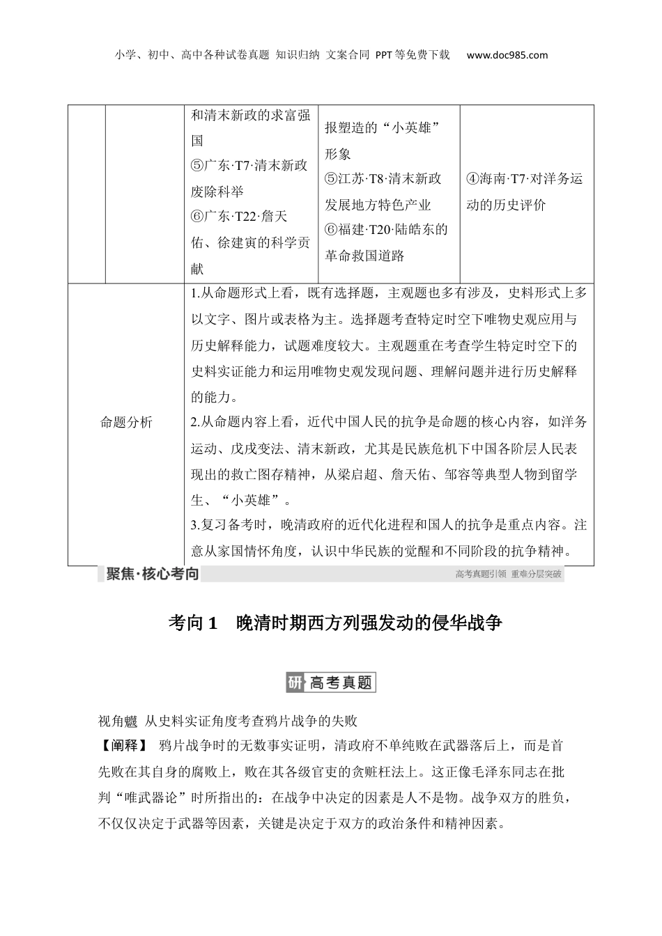 小学、初中、高中各种试卷真题知识归纳文案合同PPT等免费下载www.doc985.com专题五侵略与抗争——期的列强侵略与中国人民的抗争命题统计命题要点2022年2021年2020年热考角度晚清时期的列强侵华①浙江·T8·黄海海战①北京·T6·近代开放的通商口岸②湖南·T7·近代海关的半殖民地化③广东·T6·近代列强的经济入侵①北京·T7·近代列强的侵略②山东·T8·近代列强的经济侵略晚清中国人民的探索与抗争①湖南·T20·1898年和1901年科举改革②浙江·T8·中国人民的抗争③广东·T6·张之洞与李鸿章的争论④山东·T6·洋务运动①湖北·T17·晚清中央与地方财政变革②福建·T7·维新运动的历史局限性③湖北·T18·清末新政星期日公休制度④山东·T17·1902年画①天津·T5·《良友》画报激励民众共御外侮②天津·T17·近代留学生留学与归国情况③山东·T17·对梁启超思想的认识小学、初中、高中各种试卷真题知识归纳文案合同PPT等免费下载www.doc985.com和清末新政的求富强国⑤广东·T7·清末新政废除科举⑥广东·T22·詹天佑、徐建寅的科学贡献报塑造的“小英雄”形象⑤江苏·T8·清末新政发展地方特色产业⑥福建·T20·陆皓东的革命救国道路④海南·T7·对洋务运动的历史评价命题分析1.从命题形式上看,既有选择题,主观题也多有涉及,史料形式上多以文字、图片或表格为主。选择题考查特定时空下唯物史观应用与历史解释能力,试题难度较大。主观题重在考查学生特定时空下的史料实证能力和运用唯物史观发现问题、理解问题并进行历史解释的能力。2.从命题内容上看,近代中国人民的抗争是命题的核心内容,如洋务运动、戊戌变法、清末新政,尤其是民族危机下中国各阶层人民表现出的救亡图存精神,从梁启超、詹天佑、邹容等典型人物到留学生、“小英雄”。3.复习备考时,晚清政府的近代化进程和国人的抗争是重点内容。注意从家国情怀角度,认识中华民族的觉醒和不同阶段的抗争精神。考向1晚清时期西方列强发动的侵华战争视角从史料实证角度考查鸦片战争的失败【阐释】鸦片战争时的无数事实证明,清政府不单纯败在武器落后上,而是首先败在其自身的腐败上,败在其各级官吏的贪赃枉法上。这正像毛泽东同志在批判“唯武器论”时所指出的:在战争中决定的因素是人不是物。战争双方的胜负,不仅仅决定于武器等因素,关键是决定于双方的政治条件和精神因素。小学、初中、高中各种试卷真题知识归纳文案合同PPT等免费下载www.doc985.com【典例1】(2017·江苏高考,6)鸦片战争后,两江总督耆英说,“良民与莠民亦成水火……民已焦头烂额,官犹诩诩自得,扬言……民情柔懦,安得闹事”,更“欺压良善,自命为能员”,“此实不能御寇之由”。耆英认为鸦片战争失败的主要原因是()A.贫富不均B.莠民作乱C.民性懦弱D.吏治败坏命题情境以鸦片战争后两江总督耆英的阐述构建学习情境必备知识鸦片战争的背景和结果关键能力从史料实证角度考查吏治腐败对鸦片战争结局的影响。题干材料“民已焦头烂额,官犹诩诩自得”“欺压良善,自命为能员”体现了官员的腐败与无能核心价值探讨所述历史事件与特定历史环境之间的关系。从屈辱中汲取历史教训,厚植爱国主义情怀答案D视角解读统计数据考查近代列强的侵略【阐释】1861年起海关由新设的总理各国事务衙门统辖,英国人赫德任总税务司。一方面,近代海关引进了西方先进的管理制度,成为近代中国效率较高的行政机构;另一方面,洋税务司们利用关税操纵中国的财政,扩大帝国主义的势力,加深了中国社会的半殖民地化。【典例2】(2021·湖南高考,7)据下表可知,当时中国()1867年和1894年部分进口商品统计表1867年1894年数量货值(海关两)数量货值(海关两)铁113441(担)2645031185411(担)2467590锡33502(担)58214697008(担)2046897火柴79263(箩)713846615327(箩)1638931煤113430(吨)992649486295(吨)3221343小学、初中、高中各种试卷真题知识归纳文案合同PPT等免费下载www.doc985.com糖186176(担)7546091823890(担)9507153A.对外贸易由出超转变为入超B.政府放宽对民间设厂的限制C.民族工业出现了较快的发展D.海关的半殖民地化程度加深命题情境以1867年和1894年的进口商品统...