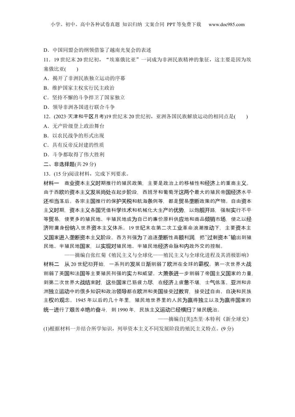 小学、初中、高中各种试卷真题知识归纳文案合同PPT等免费下载www.doc985.com一、选择题(每题3分,共36分)1.(2022·坊三模潍)19世纪,拉美国家在获得独立后的发展中,“没有经历工业化,也没有经历像美国和加拿大那样的经济发展”。这是因为拉美各国()A.重新沦为美国的殖民地或半殖民地B.经济体制具有很强的封闭性C.各国间矛盾重重导致社会动荡不安D.保留了大量殖民体制的残余2.(2022·宁德高三质检)19世纪后期,英属印度殖民当局鼓励本国军队、传教士及教育家在印度自由地推广英式体育运动,认为“相同的娱乐爱好能确保英印国民在更重大事件上的共识”。英属印度殖民当局的这项倡议意欲()A.提升印度国民的体育素质B.消除印度新旧教派的矛盾C.确保英印国民的平等地位D.扩大对印度殖民文化渗透3.伊朗门户被打开后,外国特别是英国的廉价商品便如潮水般地涌入伊朗,扼杀了刚刚萌芽的伊朗资本主义工场手工业,造成大批手工业者和中小商人破产。同时封建统治阶级为满足其奢侈的生活,大大加强了对劳动人民的剥削。材料主要说明了()A.英国加强了对伊朗的经济侵略B.伊朗民族矛盾和阶级矛盾并存C.伊朗的封建统治阻碍了社会进步D.伊朗成为了英国的殖民地4.美国某学者认为,19、20世纪出现了一个非常流行的现象,许多帝国日益重视“教化工程”。就是说,越来越多的帝国声称,帝国最终会把一部分“异域”臣民转化为像帝国中心区的人那样思考、生活和接受管理。这些帝国重视“教化工程”的主要目的是()A.为其殖民统治制造合法性B.缩小不同地区文化差异C.促进世界市场的最终形成D.在世界范围内争夺势力5.某探险家对非洲的人文地理非常感兴趣,用了33年时间,多次深入中非、南非探险和考察,并做了详细记录,使原来非洲地图的许多空白处逐渐得以填补。他的活动()A.客观上刺激了殖民者瓜分非洲小学、初中、高中各种试卷真题知识归纳文案合同PPT等免费下载www.doc985.comB.使殖民者开始关注非洲C.满足了殖民者侵略非洲的愿望D.中断了非洲文明的进程6.1910年,各大洲沦为殖民地的国家占各洲土地总面积的比例分别是:非洲90.4%;亚洲56.6%;南、北美洲27.2%;大洋洲100%,这尚且不包括为数众多的半殖民地和附属国。由此可知()A.主要工业国经济扩张以商品输出为主B.三角贸易的规模进一步扩大C.世界市场地理界限的扩展已基本告终D.英国成为世界最大殖民帝国7.(2022·岩月考龙)1815年,玻利瓦尔提议:“使新世界组成一个国家,依靠一种联系将各部分同整体连接起来,这是一个伟大的理想。”1819年,他领导成立了“大哥伦比亚共和国”;1826年,他又提出了:“新世界将由以一项共同法律相联结的一切独立国家组成。”上述史实说明玻利瓦尔的理想是()A.美洲真正获得独立B.成为拉美“解放者”C.实行资产阶级统治D.美洲联合建国8.墨西哥独裁者迪亚斯统治期间,铁路和电报线路连接了整个墨西哥,采矿业产量激增,企业家们还建立起了炼钢、玻璃、化工和纺织行业,首都墨西哥城也经历了一次转变。然而1910年暴力革命突然爆发,墨西哥人民赶走了独裁者。这说明()A.工业化造就新型革命力量B.贫富差距引爆暴力革命C.独裁统治落后于时代发展D.经济发展推动政治变革9.(2022·北京市海淀二模区)19世纪末20世纪初,国大党领袖提拉克提出“印度人的印度”口号以及“战斗,不要乞求”和“自由是我与生俱来的权利,我将得到它”等主张,要求英国人离开印度,并在全国赢得众多追随者。对这一现象认识正确的是()A.一战后英国加紧对印度的控制B.印度人民的民族民主意识已经觉醒C.非暴力不合作运动在印度展开D.印度民族独立斗争受十月革命影响10.(2022·北京市西城二模区)1912年初,越南维新会改组为越南光复会,并确定其政治纲领为“驱逐法贼、恢复越南、建立越南共和民国”。由此可以看出()A.东亚和东南亚均已沦为殖民地和半殖民地B.越南与中国的藩属国关系维持到民国初年C.辛亥革命对越南民族解放运动产生直接影响小学、初中、高中各种试卷真题知识归纳文案合同PPT等免费下载www.doc985.comD.中国同盟会的纲领借鉴了越南光复会的表述11.19世纪末20世纪初,“埃塞俄比亚”...
