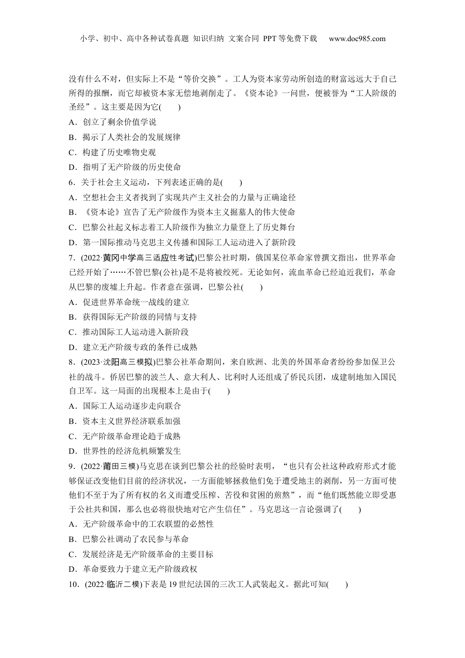 小学、初中、高中各种试卷真题知识归纳文案合同PPT等免费下载www.doc985.com一、选择题(每题3分,共36分)1.(2022·北京西城一模区)19世纪三四十年代,欧洲三大工人运动分别提出以下口号“工作不能生活,毋宁战斗而死”“没有给面包,就要革命”和“宁愿做自由人死在绞架上,而不愿过着奴隶生活”。这些口号反映出欧洲工人运动()A.受到启蒙思想和工业革命的影响B.提出了推翻资产阶级政权的要求C.得到马克思主义科学理论的指导D.从各国自发斗争走向了联合斗争2.(2023·坊模潍拟)早在19世纪40年代初,在曼彻斯特的一个纺织厂区里,每到星期天就有3000多个工人集体坐在路边谈论政治、社会和文化。工人们把宗教歌曲或赞美诗改为世俗歌曲,唱出他们希望联合力量改变社会现状的心声。这反映出()A.马克思主义诞生的必要性B.资本主义经济危机周期性爆发C.工人运动已走向国际联合D.无产阶级建立政党的迫切要求3.马克思在《共产党宣言》中批判了这样一批人:“他们向统治阶级呼吁,以为人们只要理解他们的体系,就会承认这种体系是最美好的社会的最美好的计划。他们拒绝一切政治行动,特别是一切革命行动;他们想通过和平的途径达到自己的目的,并且企图通过示范的力量来为新的社会福音开辟道路。”他们是()A.近代启蒙思想家B.宗教改革家C.空想社会主义者D.工业无产阶级4.(2022·天津市一模红桥区)恩格斯指出:“解决社会问题的办法还隐藏在不发达的社会生产中,因此新的社会制度,它愈是制定得详尽周密,就愈要陷入纯粹的幻想。”据此可知,社会主义由“空想”转为“科学”的根本条件是()A.无产阶级不断觉醒B.科学理论科学指导C.社会生产力的发展D.社会矛盾日益加剧5.(2023·大一模连)马克思在《资本论》中指出,工人干活,资本家付给他钱,这看起来并小学、初中、高中各种试卷真题知识归纳文案合同PPT等免费下载www.doc985.com没有什么不对,但实际上不是“等价交换”。工人为资本家劳动所创造的财富远远大于自己所得的报酬,而它却被资本家无偿地剥削走了。《资本论》一问世,便被誉为“工人阶级的圣经”。这主要是因为它()A.创立了剩余价值学说B.揭示了人类社会的发展规律C.构建了历史唯物史观D.指明了无产阶级的历史使命6.关于社会主义运动,下列表述正确的是()A.空想社会主义者找到了实现共产主义社会的力量与正确途径B.《资本论》宣告了无产阶级作为资本主义掘墓人的伟大使命C.巴黎公社起义标志着工人阶级作为独立力量登上了历史舞台D.第一国际推动马克思主义传播和国际工人运动进入了新阶段7.(2022·中高三适性考黄冈学应试)巴黎公社时期,俄国某位革命家曾撰文指出,世界革命已经开始了……不管巴黎(公社)是不是将被绞死。无论如何,流血革命已经迫近我们,革命从巴黎的废墟上升起。作者意在强调,巴黎公社()A.促进世界革命统一战线的建立B.获得国际无产阶级的同情与支持C.推动国际工人运动进入新阶段D.建立无产阶级专政的条件已成熟8.(2023·沈高三模阳拟)巴黎公社革命期间,来自欧洲、北美的外国革命者纷纷参加保卫公社的战斗。侨居巴黎的波兰人、意大利人、比利时人还组成了侨民兵团,成建制地加入国民自卫军。这一局面的出现根本上是由于()A.国际工人运动逐步走向联合B.资本主义世界经济联系加强C.无产阶级革命理论趋于成熟D.世界性的经济危机频繁发生9.(2022·田三模莆)马克思在谈到巴黎公社的经验时表明,“也只有公社这种政府形式才能够保证改变他们目前的经济状况,一方面能够拯救他们免于遭受地主的剥削,另一方面可使他们不至于为了所有权的名义而遭受压榨、苦役和贫困的煎熬”,而“他们既然能立即受惠于公社共和国,那么也必将很快地对它产生信任”。马克思这一言论强调了()A.无产阶级革命中的工农联盟的必然性B.巴黎公社调动了农民参与革命C.发展经济是无产阶级革命的主要目标D.革命要致力于建立无产阶级政权10.(2022·沂二模临)下表是19世纪法国的三次工人武装起义。据此可知()小学、初中、高中各种试卷真题知识归纳文案合同PPT等免费下载www.doc985.com时间地点特点1831年里昂提出“做工不能生活,毋宁战斗而死”的口...
