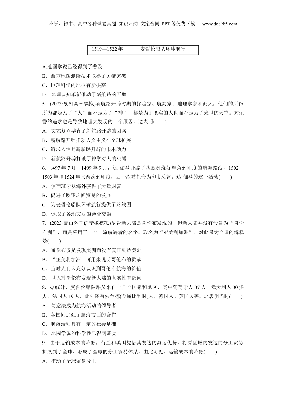 小学、初中、高中各种试卷真题知识归纳文案合同PPT等免费下载www.doc985.com一、选择题(每题3分,共36分)1.(2022·房山一模)“西欧人急于寻求由海洋上直达远东的航路……奥斯曼人想要继续维持旧商路。”意大利人也想继续与阿拉伯商人做生意,双方都“颇称心如意”,但一些欧洲人深感不满,他们想自己另寻一条到东方的航路,“以分享厚利”。由此,可以推测出()A.奥斯曼人维护了旧商路的畅通B.意大利最先开辟远东的航路C.西欧人热衷开辟新航路的意图D.阿拉伯商人做生意获利最多2.(2022·吉安期末)16世纪前后的葡萄牙和西班牙,封建专制王权十分强大,封建生产关系还很牢固。两国的君主之所以大力支持开辟新航路,主要目的是满足自己享受的需要,并且进一步巩固自己的统治地位,而不是用于扩大再生产。据此可知,新航路开辟()A.充分体现了封建性的统治因素B.开启了东西方政治经济的交流之路C.反映封建国家对经济干预加强D.动力源于封建国家人文主义的鼓励3.(2022·沙月考长)一位美国历史学家这样总结道:“在欧洲的海外扩张中最重要的人物不是哥伦布、达·伽马和麦哲伦,而是那些拥有资本的企业家们。”这是因为()A.企业家为航海家提供航行资本B.欧洲经济出现货币化趋势C.新的经济内驱主导了世界经济D.欧洲封建经济逐渐走向瓦解4.(2023·重高三模庆拟)在《古地图密码》一书中,有两幅地图值得人们深思:一幅是绘于1459年,藏于威尼斯马尔西亚那国家图书馆的“毛罗地图”,能清晰地看到欧亚大陆和非洲大陆;另一幅是绘于1507年的“瓦德西穆勒地图”,绘出了美洲大陆和太平洋海域,且太平洋海域大于大西洋海域。如表是相关史实简表。据此可知当时()时间事件1459年毛罗绘制地图1488年迪亚士抵达好望角1492年哥伦布到达美洲1498年达·伽马绕过好望角到达印度1507年瓦德西穆勒绘制地图小学、初中、高中各种试卷真题知识归纳文案合同PPT等免费下载www.doc985.com1519—1522年麦哲伦船队环球航行A.地圆学说已经得到了普及B.西方地图测绘技术取得了关键突破C.地理科学的地位有所提高D.地理认知革新推动了新航路的开辟5.(2023·泉州高三模拟)新航路开辟时期的探险家、航海家、地理学家和商人,他们的所作所为都是为了“人”而不是为了“神”,都是为了现实的人世而不是为了来世的天堂。对荣誉的追求也是导致地理大发现的一个原因。这表明()A.文艺复兴孕育了新航路开辟的因素B.新航路开辟推动人文主义在全球扩展C.追求人性是新航路开辟的根本动力D.新航路开辟打破了神学对人的束缚6.1497年7月-1499年9月,达·伽马开辟了从欧洲绕好望角到印度的航海路线,1502-1503年和1524年又两次到印度,后一次被任命为印度总督。达·伽马的这一活动()A.使西班牙从海外获得了大量财富B.促进了欧亚之间贸易的发展C.为麦哲伦船队环球航行提供了路线图D.促成了各地文明的会合交融7.(2023·唐山外校模国语学拟)尽管新大陆是哥伦布发现的,但新大陆并没有命名为“哥伦布洲”,而是采用了一个二流航海者的名字,取名为“亚美利加洲”。对此最为合理的解释是()A.哥伦布仅是发现美洲而没有真正到达美洲B.“亚美利加洲”可用来说明哥伦布的贡献C.当时人们未充分认识到哥伦布航海的价值D.世人对哥伦布发现新大陆的真实性有疑问8.据统计,麦哲伦船队船员来自十几个国家和地区,其中葡萄牙人37人,意大利人30多人,法国人19人,此外还有佛兰德(今属比利时)人、德国人、英国人等。这表明当时()A.葡意法成为航海活动的领导者B.各国间加强了航海方面的合作C.航海活动具有一定的社会基础D.地圆学说的科学性已得到证实9.由于运输成本的降低,荷兰和英国凭借其发达的海运优势,将原区域内发达的分工贸易扩展到了全球,形成了全球的分工贸易体系。由此可见,运输成本的降低()A.推动了全球贸易分工小学、初中、高中各种试卷真题知识归纳文案合同PPT等免费下载www.doc985.comB.标志着分工体系最终确立C.使英国成为世界工厂D.增加了世界各国的出口额10.下图为1400—1800年中国及其他地区人口数量的变化(单位:百万)。据此可知()A.黑奴贸易的扩大改变了拉丁美洲的人种构成B.殖民活...