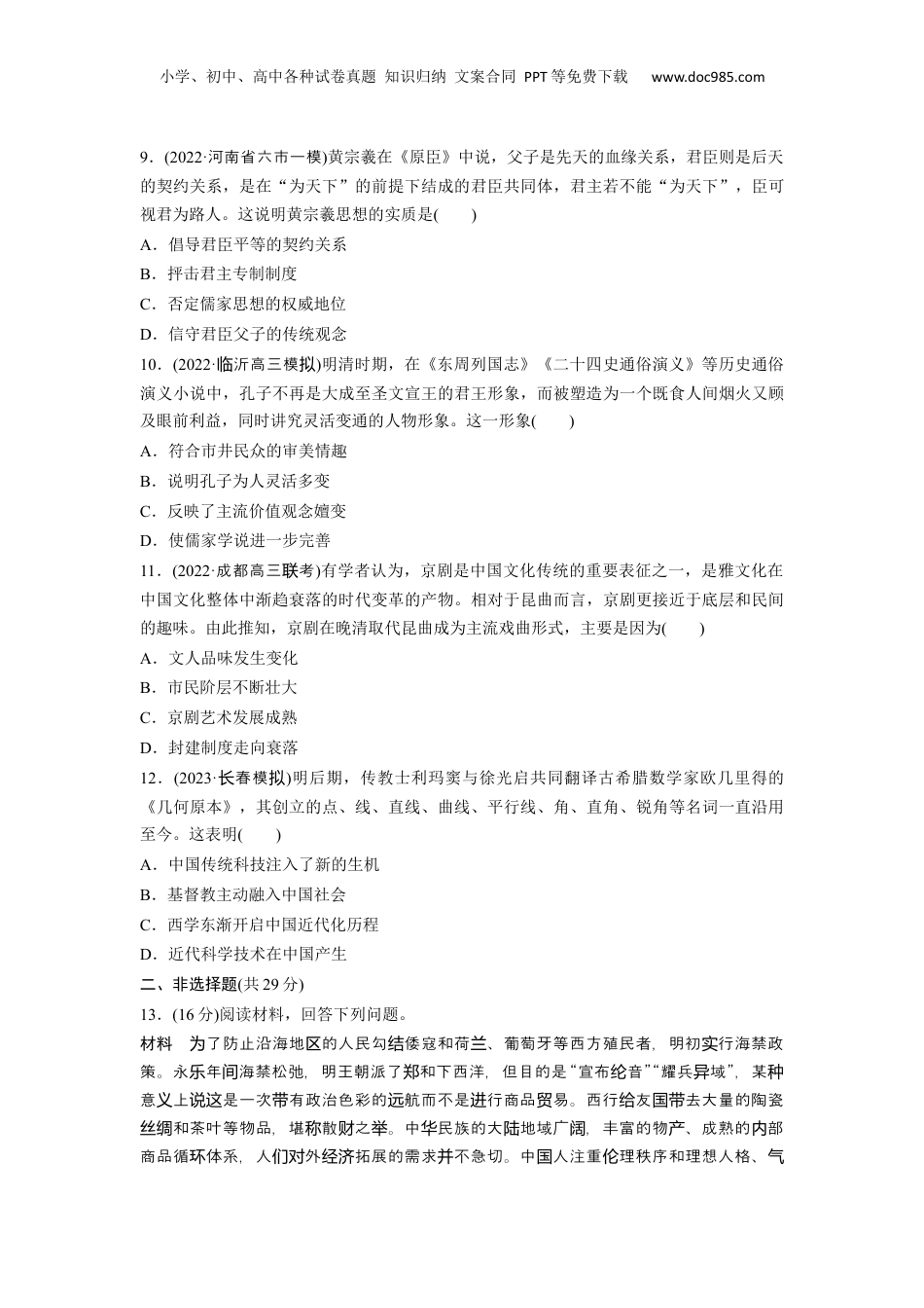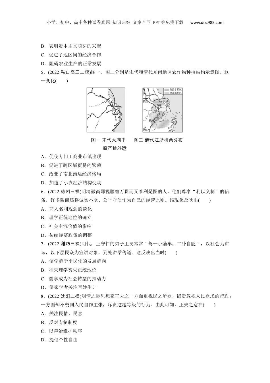 小学、初中、高中各种试卷真题知识归纳文案合同PPT等免费下载www.doc985.com一、选择题(每题3分,共36分)1.(2022·重模庆拟)明朝天启元年(公元1621年),农学家王象晋在《群芳谱》中提及:“番柿,一名六月柿,茎如蒿,高四五尺,叶如艾,花如榴,一枝结五实或三四实,一树二三十实。缚作架,最堪观。火伞火珠,未足为喻,草本也。来自西番,故名。”这是中国最早有关番茄的详细记载。这段记载可用来说明此时()A.东西方间物品交流速度加快B.海上丝绸之路得到稳步发展C.我国可用食物种类更加丰富D.中国与美洲开始了直接往来2.(2022·德州高三模拟)如表为明朝中后期南方手工业生产与原料供应状况。由此可见()手工业生产中心原料供应地丝织业苏州、杭州等地湖州棉织业松江河北、山东、河南等地冶铁业广东佛山镇广东罗定、阳春、阳江各县A.新的经营方式出现B.经济重心南移完成C.手工工场规模扩大D.区域经济联系加强3.明太祖禁用金银,实行宝钞(纸币)制度,而建文帝(1398-1402年)时民间交易使用白银的趋向表现明显,永乐帝(1402-1424年)即位又禁止使用金银交易,至成化年间(1465-1487年)白银几乎成了通用货币。这一现象反映了()A.中国在对外贸易中长期入超B.新的生产方式促进货币改革C.明朝政府经济政策摇摆不定D.商品经济发展推动货币变革4.明代中叶以后,江南市镇的分布十分密集,以苏州府吴江县盛泽镇为例,东南至新杭市五里,东至王江泾镇六里,北至平望镇十五里,西南至新城镇三十里,至濮院镇五十里,西至震泽镇三十里,至南浔镇五十里。这些密集的市镇网络()A.体现了长途贩运贸易发展小学、初中、高中各种试卷真题知识归纳文案合同PPT等免费下载www.doc985.comB.表明资本主义萌芽的兴起C.促进了地区间的经济合作D.阻碍农业生产的正常发展5.(2022·鞍山高三二模)图一、图二分别是宋代和清代东南地区农作物种植结构示意图。这一变化()一宋代太湖平二代江浙棉桑分布图图清原粮外产运A.促使专门工商业市镇出现B.促进了跨区域贸易的繁荣C.改变了南北漕运经济格局D.加速了小农经济结构变动6.(2022·德州三模)明清徽商鄙视腰缠万贯而又唯利是图的人,他们尊奉“利以义制”的信条,许多徽商还将诚实不欺、公平守信作为自己的经营原则。该现象反映出()A.商人名利观念的淡化B.理学正统地位的确立C.社会主流价值的影响D.传统经济政策的调整7.(2022·坊三模潍)明代,王守仁的弟子王艮常常“驾一小蒲车,二仆自随”,以社会为讲坛,以下层民众为宣讲对象,到处讲学传道。这反映出当时()A.儒学趋于平民化的发展趋向B.程朱理学丧失正统地位C.儒学成为社会转型的推动力D.儒家学者关注百姓生计8.(2022·沈二模阳)明清之际思想家王夫之一方面重视民之所欲,谴责忽视人民欲求的苛政;一方面却不赞同人民自作主张,斥责逾越等级的行为。由此可知,王夫之意在()A.关注民情、民意B.反对专制制度C.以善治维护秩序D.提倡个性自由小学、初中、高中各种试卷真题知识归纳文案合同PPT等免费下载www.doc985.com9.(2022·河南省六市一模)黄宗羲在《原臣》中说,父子是先天的血缘关系,君臣则是后天的契约关系,是在“为天下”的前提下结成的君臣共同体,君主若不能“为天下”,臣可视君为路人。这说明黄宗羲思想的实质是()A.倡导君臣平等的契约关系B.抨击君主专制制度C.否定儒家思想的权威地位D.信守君臣父子的传统观念10.(2022·沂高三模临拟)明清时期,在《东周列国志》《二十四史通俗演义》等历史通俗演义小说中,孔子不再是大成至圣文宣王的君王形象,而被塑造为一个既食人间烟火又顾及眼前利益,同时讲究灵活变通的人物形象。这一形象()A.符合市井民众的审美情趣B.说明孔子为人灵活多变C.反映了主流价值观念嬗变D.使儒家学说进一步完善11.(2022·成都高三考联)有学者认为,京剧是中国文化传统的重要表征之一,是雅文化在中国文化整体中渐趋衰落的时代变革的产物。相对于昆曲而言,京剧更接近于底层和民间的趣味。由此推知,京剧在晚清取代昆曲成为主流戏曲形式,主要是因为()A.文人品味发生变化B.市民阶层不断壮大C.京剧艺术发展成熟D.封建制度走...