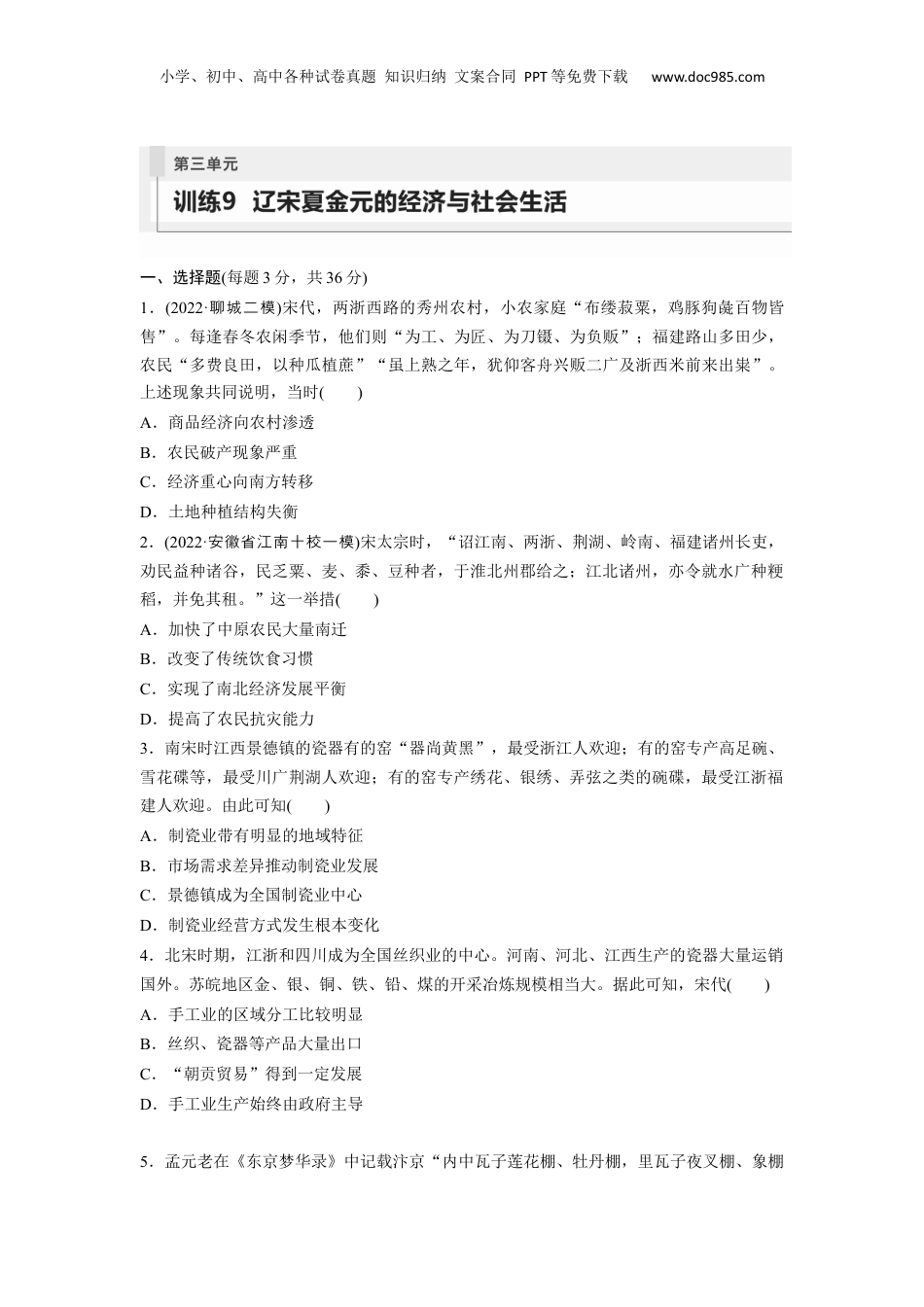 小学、初中、高中各种试卷真题知识归纳文案合同PPT等免费下载www.doc985.com一、选择题(每题3分,共36分)1.(2022·聊城二模)宋代,两浙西路的秀州农村,小农家庭“布缕菽粟,鸡豚狗彘百物皆售”。每逢春冬农闲季节,他们则“为工、为匠、为刀镊、为负贩”;福建路山多田少,农民“多费良田,以种瓜植蔗”“虽上熟之年,犹仰客舟兴贩二广及浙西米前来出粜”。上述现象共同说明,当时()A.商品经济向农村渗透B.农民破产现象严重C.经济重心向南方转移D.土地种植结构失衡2.(2022·安徽省江南十校一模)宋太宗时,“诏江南、两浙、荆湖、岭南、福建诸州长吏,劝民益种诸谷,民乏粟、麦、黍、豆种者,于淮北州郡给之;江北诸州,亦令就水广种粳稻,并免其租。”这一举措()A.加快了中原农民大量南迁B.改变了传统饮食习惯C.实现了南北经济发展平衡D.提高了农民抗灾能力3.南宋时江西景德镇的瓷器有的窑“器尚黄黑”,最受浙江人欢迎;有的窑专产高足碗、雪花碟等,最受川广荆湖人欢迎;有的窑专产绣花、银绣、弄弦之类的碗碟,最受江浙福建人欢迎。由此可知()A.制瓷业带有明显的地域特征B.市场需求差异推动制瓷业发展C.景德镇成为全国制瓷业中心D.制瓷业经营方式发生根本变化4.北宋时期,江浙和四川成为全国丝织业的中心。河南、河北、江西生产的瓷器大量运销国外。苏皖地区金、银、铜、铁、铅、煤的开采冶炼规模相当大。据此可知,宋代()A.手工业的区域分工比较明显B.丝织、瓷器等产品大量出口C.“朝贡贸易”得到一定发展D.手工业生产始终由政府主导5.孟元老在《东京梦华录》中记载汴京“内中瓦子莲花棚、牡丹棚,里瓦子夜叉棚、象棚小学、初中、高中各种试卷真题知识归纳文案合同PPT等免费下载www.doc985.com最大,可容数千人”,而每个勾栏的演出,是从早上一直演到晚上,从春天演到冬天,“全年不歇”的。该文献所记载的现象()A.表明我国古代的戏剧走向了成熟B.体现了宋代城乡百姓业余生活多彩C.与北宋时社会经济的繁荣相适应D.反映了宋代中央集权对文艺的影响6.北宋统一后,首都汴京是南北饮食技术的交流中心,南宋时汴京的饮食业涌入杭州等地。宋朝人普遍喜欢饮酒和饮茶,城市中还有许多凉饮店,出售甘豆汤、漉梨浆、木瓜汁、沉香水、荔枝膏水等饮料。由此推知,宋朝()A.商品经济发展助推社会生活变化B.经济重心完成转移C.城市经济结构发生了革命性变革D.商业市镇经济繁荣7.(2022·一模菏泽)宋初,市舶管理实行“州郡兼领”;神宗时期,《广州市舶条》规定市舶事务由漕臣兼领、由转运使主持;徽宗初年到南宋末年,官府对市舶事务设置“专置提举”。这反映出()A.中央和地方在博弈中分权B.国家政治形势的重大变化C.宋朝的税收政策摇摆不定D.海外贸易的地位日益重要8.元朝《市舶则法》规定,诸王、驸马、权豪、势要、僧、道等“下番(到国外去)博易到物货……依例抽解”,行省官、宣慰司官、市舶司官不得“拘占舶船”,不得“捎带钱物下番买卖”。这些规定()A.说明元朝严格限制外贸活动B.提高了外贸管理效率C.反映政府重视规范海外贸易D.有利于实现外贸平衡9.(2022·烟台模考)下面为元朝对外贸易交往情况表,其中最能说明当时()项目城市物品商人北方大都外国输入:珠玉、药材、珍禽异兽、食品中国输出:丝绸和瓷器中国、阿拉伯和欧洲商人南方泉州、广州、庆元A.政府积极鼓励对外贸易B.中国对外贸易处于入超地位小学、初中、高中各种试卷真题知识归纳文案合同PPT等免费下载www.doc985.comC.对外交流海陆交通发达D.阿拉伯失去东西方交流中转作用10.(2022·庄三模枣)唐代,即使家道破落人们也会在传记和墓志中追溯远祖如何显赫;宋代士大夫却不觉得贫贱是耻辱,反而会回顾当年的艰难,激励自己和清贫士子,如范仲淹就有“断齑画粥”的故事。这种变化()A.根源于商品经济的发展B.表明宗法观念逐渐消亡C.有利于社会阶层的流动D.体现社会主流思想改变11.(2022·田三模莆)北宋文人在诗中写道:“读书不求官,但与耕稼亲。”南宋士人交代其子孙“治生不求富,读书不求官”。据此可知,宋代()A.商业活动受到重视B.冗官现象日益严重C.四民社会地...