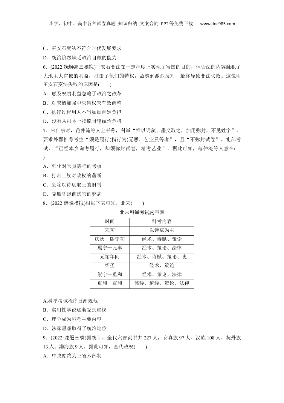 小学、初中、高中各种试卷真题知识归纳文案合同PPT等免费下载www.doc985.com一、选择题(每题3分,共36分)1.(2022·州二模滨)唐后期至五代时,枢密使一职先是以宦官充任,曾一度左右宰相任免,插手皇帝废立,后多为武将,权倾将相。宋初,枢密使多以文臣出任,专掌军政,与宰相分权。宋初统治者此举意在()A.削弱宰相权力B.结束藩镇割据C.防止权臣乱政D.提高行政效率2.(2022·重庆调研)宋初的统治者以路作为高层行政区,按照交通路线为主划分。每路设转运司、刑狱司、常平司和安抚司四个机构,隶属中央各部,分别负责地方财赋、监察司法粮食储备平抑物价、治安边防的职能。据此可知,路的设立()A.体现重文轻武的理念B.提高了地方行政效率C.对后世体制影响深远D.削弱地方割据的基础3.景德元年(1004年)澶渊之盟,北宋承认契丹占领燕云十六州的合法性;庆历二年(1042年)辽索取周世宗时收复的关南十县地,宋增加银绢十万了事;绍兴十一年(1141年)宋高宗割让北中国与女真贵族。上述现象的出现反映出宋代采取的治国策略是()A.重文轻武B.强干弱枝C.岁币政策D.守内虚外4.“湖湘学派”创始人胡安国(1074—1138年),评述秦灭梁之事曰:“按《春秋》灭梁者,秦也。圣人不书‘秦灭’,而书‘梁亡’者,不能守在四邻而沟公宫,亡其自致也。今勤王大众不以击敌,而以治城池。金帛用物不以募战士,而以赂敌国。堂堂大宋,万里幅员奚至陵藉如此其甚哉!”胡安国意在()A.痛斥秦灭梁的行径B.纠正历史记载错误C.唤起强国御敌意识D.巩固理学主导地位5.(2022·二模菏泽)有学者认为,北宋中期,地主阶级内部剧烈分化,为变法提供了一些条件,但始终没有产生过一股足以不断推动变法前进的强大力量,王安石变法中各股地主政治势力都是朝后退步。这意在说明,当时()A.经济的发展导致地主阶级的分化B.过度中央集权的弊端日益显现小学、初中、高中各种试卷真题知识归纳文案合同PPT等免费下载www.doc985.comC.王安石变法不符合时代发展要求D.统治阶级缺乏政治自救的能力6.(2022·高三模抚顺拟)王安石变法在一定程度上实现了富国的目的,但变法的内容触犯了大地主大官僚的利益,打击了他们的特权,故遭到激烈反对,最终导致变法失败。这说明王安石变法失败的原因是()A.触及权贵利益忽略了政治之改革B.对宋初加强中央集权未有效调整C.执行过程用人不当加重百姓负担D.没有从根本上摆脱封建统治危机7.宋仁宗时,范仲淹等人上书称,科举“惟以词藻、墨义取之,加用弥封,不见姓字”,要求外郡推荐考生“须是履行(指行为)无恶、艺业及等者”,且“不弥封试卷”。礼部考试,“已经本乡询考履行,却须弥封试卷,精考艺业”。据此可知,范仲淹等人意在()A.强化对官员德行的考核B.打击士族对政权的垄断C.废除以诗赋取士的旧制D.克服凭恩荫选官的弊病8.(2022·蚌埠模拟)根据下表可知,北宋()北宋科考容表举试内时间科考内容宋初以诗赋为主庆历—熙宁初经术、诗赋、策论熙宁—元丰经术、策论、法律元祐年间经术、诗赋、策论、史绍圣经术、策论崇宁—重和经术、策论、法律重和—宣和儒经、道经、策论、法律A.科举考试程序日渐规范B.实用性学说逐渐受到重视C.理学成为科考主要内容D.法家思想取得了统治地位9.(2022·沈三模阳)据统计,金代六部尚书共227人,女真族97人、汉族108人、契丹族13人、渤海族9人。据此可知,金代政权()A.中央始终为三省六部制小学、初中、高中各种试卷真题知识归纳文案合同PPT等免费下载www.doc985.comB.北方汉族占据主导地位C.促进了北方民族的交融D.实现了各民族一律平等10.(2022·泰安四模)下表为不同史籍中对元朝的相关记载。由此可知,元朝建立初期()记载出处“至元元年(1264年)……中、西凉、甘、、垦兴肃瓜、沙等州之土水田若干,于是民之者四五为归户万,悉授田,具种颁农”宋濂《元史》至元十一年(1274年),在州有多因避泽许为躲战乱没有回家的民,地官主他失去的土地农当长张将们归,还认为“俟主至,析而之业当归”宋濂《元史》至元二十六年(1289年),政府曾下令,“凡北方色诸人寓居者亦就籍之”吴松弟《中国人口史》A.流民问题有所缓解B.政...