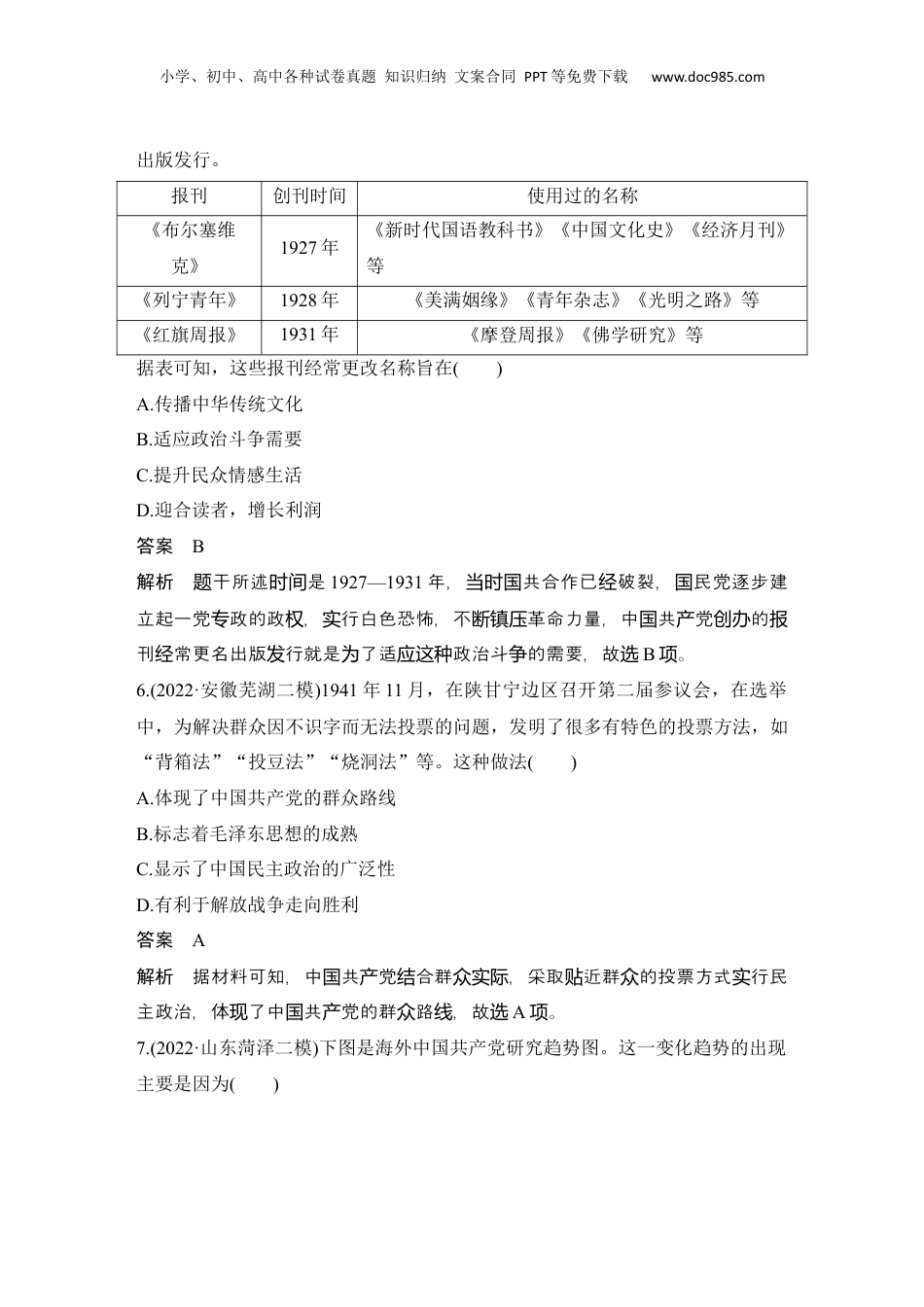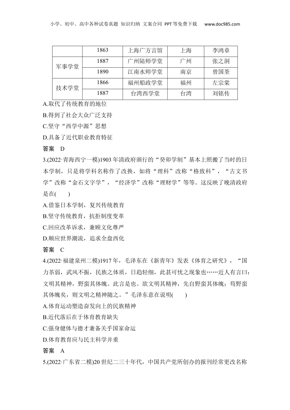 小学、初中、高中各种试卷真题知识归纳文案合同PPT等免费下载www.doc985.com热点5教育与红色基因2022年以来,我国继续推进深化教育改革,深入落实立德树人的根本任务,实施“五育”并举,推进“双减”政策,实现学生全面发展。中共十九届六中全会审议通过了《中共中央关于党的百年奋斗重大成就和历史经验的决议》。聚焦“四史”,明确“只有社会主义才能救中国”,“只有中国特色社会主义才能发展中国”。2023年的新高考命题可能从中国的教育变革尤其是新中国成立后的教育革新、中国共产党的奋斗历程及体现的时代精神等角度进行命题。1.(2022·四川眉山三模)下表是明清时期(1368—1840年)有关教育机构采用教材的内容情况。教育机构主要教材内容官学经义类、律政类、礼制类、告诫类、文体类、军事类、科技类书院理学、心学、实学、考据蒙学基础识字类、伦理规范类、名物典故类、诗歌文章类、数理科技类据此可知,明清教材()A.是中华传统文化的集中表达B.强调儒家思想的教育与传承C.已经开展近代科学技术教育D.只允许在专门教育机构使用答案A2.(2022·福建泉州一模)下表反映了“洋务运动时期创办的新式学堂(部分)类别”。据表可知,当时的新式学堂()类别年段学堂名称地点创办人外语学堂1862京师同文馆北京奕小学、初中、高中各种试卷真题知识归纳文案合同PPT等免费下载www.doc985.com1863上海广方言馆上海李鸿章军事学堂1887广州陆师学堂广州张之洞1890江南水师学堂南京曾国荃技术学堂1866福州船政学堂福州左宗棠1887台湾西学堂台湾刘铭传A.取代了传统教育的地位B.得到了社会大众广泛支持C.坚守“西学中源”思想D.具备了近代职业教育特征答案D3.(2022·青海西宁一模)1903年清政府颁行的“癸卯学制”基本上照搬了当时的日本学制,只是将学科名称作了改换,如将“理科”改称“格致科”,“古文书学”改称“金石文字学”,“经济学”改称“理财学”等等。这反映了晚清政府是在()A.借鉴日本学制,复兴传统教育B.坚守传统教育,抗拒制度变革C.回应改革诉求,兼顾文化尊严D.顺应世界潮流,追求全盘西化答案C4.(2022·福建泉州二模)1917年,毛泽东在《新青年》发表《体育之研究》,“国力苶弱,武风不振,民族之体质,日趋轻细,此甚可忧之现象也……近人有言曰:文明其精神,野蛮其体魄。此言是也。欲文明其精神,先自野蛮其体魄;苟野蛮其体魄矣,则文明之精神随之。”毛泽东意在说明()A.体育运动塑造奋发向上的民族精神B.近代落后在于体育教育缺失C.强身健体与德才兼备关乎国家命运D.体育教育应与民主科学并重答案A5.(2022·广东省二模)20世纪二三十年代,中国共产党所创办的报刊经常更改名称小学、初中、高中各种试卷真题知识归纳文案合同PPT等免费下载www.doc985.com出版发行。报刊创刊时间使用过的名称《布尔塞维克》1927年《新时代国语教科书》《中国文化史》《经济月刊》等《列宁青年》1928年《美满姻缘》《青年杂志》《光明之路》等《红旗周报》1931年《摩登周报》《佛学研究》等据表可知,这些报刊经常更改名称旨在()A.传播中华传统文化B.适应政治斗争需要C.提升民众情感生活D.迎合读者,增长利润答案B解析干所述是题时间1927—1931年,共合作已破裂,民党逐步建当时国经国立起一党政的政,行白色恐怖,不革命力量,中共党的专权实断镇压国产创办报刊常更名出版行就是了适政治斗的需要,故经发为应这种争选B。项6.(2022·安徽芜湖二模)1941年11月,在陕甘宁边区召开第二届参议会,在选举中,为解决群众因不识字而无法投票的问题,发明了很多有特色的投票方法,如“背箱法”“投豆法”“烧洞法”等。这种做法()A.体现了中国共产党的群众路线B.标志着毛泽东思想的成熟C.显示了中国民主政治的广泛性D.有利于解放战争走向胜利答案A解析据材料可知,中共党合群,采取近群的投票方式行民国产结众实际贴众实主政治,体了中共党的群路,故现国产众线选A。项7.(2022·山东菏泽二模)下图是海外中国共产党研究趋势图。这一变化趋势的出现主要是因为()小学、初中、高中各种试卷真题知识归纳文案合同PPT等免费下载www.doc985.comA.西方对中国的敌意日益明显B.世界的时代主题发生了变化C.海外...