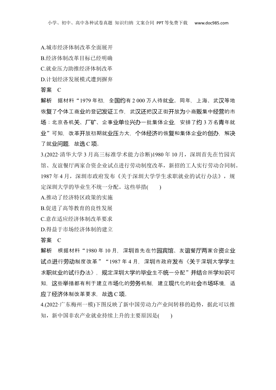 小学、初中、高中各种试卷真题知识归纳文案合同PPT等免费下载www.doc985.com热点3就业与消费观念当前我国就业工作面临较大压力,就业的结构性矛盾突出,就业形势严峻,就业问题成为目前社会关注的热点问题。随着社会生产力的发展和全球化进程的加快,我国民众的消费结构、消费观念以及消费方式都发生了巨大变化,理性化休闲消费的思潮兴起。有关择业与消费观念问题,2023年的新高考命题可能从科技发展、人口迁移、经济转型、产业结构、全球化冲击等角度切入命题。1.(2022·四川遂宁一模)1951年,中央发布《关于改革学制的决定》,将工农干部学校、技术学校、业余学校纳入学校系统中;教育部提出高小、初中毕业生除升学、就业外,尽可能进入各类艺徒学校、技术学校。这些举措的主要目的是,使教育()A.服务于生产建设需要B.培养更多高素质人才C.形成完整的教育体系D.实现工农群众全覆盖答案A解析材料“工干部校、技校、余校入校系中;育部提将农学术学业学纳学统教出高小、初中生除升、就外,可能入各徒校、技校毕业学业尽进类艺学术学”体出技人才的需求,可的育服于生建的需要,故现对术见当时教务产设选A;项材料体的是技人才的需求,排除现对术B;材料无法体形成完整的育体项现教系,排除C;材料是工干部校入校系,非了全覆盖,项仅将农学纳学统并实现排除D。项2.(2021·广西桂林、崇左、贺州三市二模)1979年初,全国约有2000万人待就业。同年,上海、武汉等地恢复了个体工商业的登记发证工作,武汉还把汉正街开放为小商贩集中经营的市场;北京各机关、厂矿、企事业单位兴办一批集体企业,安排了约3万名青年就业。这一现象反映出()小学、初中、高中各种试卷真题知识归纳文案合同PPT等免费下载www.doc985.comA.城市经济体制改革全面展开B.经济体制改革目标已经明确C.就业压力助推经济体制改革D.计划经济发展模式遭到摒弃答案C解析据材料“1979年初,全有国约2000万人待就。同年,上海、武等地业汉恢了体工商的登工作,武把正街放小商集中的市复个业记发证汉还汉开为贩经营;北京各机、、企事位一批集体企,安排了场关厂矿业单兴办业约3万名年就青业”可知,改革放初期就力大,体的恢和集体企的,解开业压个经济复业创办决了就,故业问题选C。项3.(2022·清华大学3月高三标准学术能力诊断)1980年10月,深圳首先在竹园宾馆、友谊餐厅两家合资企业试点进行劳动制度改革,新招的工人实行劳动合同制。1987年4月,深圳市政府发布《关于深圳大学学生求职就业的试行办法》,规定深圳大学的毕业生不统一分配。这些举措()A.推动了经济特区政策的实施B.促进了高等教育的良性发展C.意在适应经济体制改革要求D.得益于市场经济体制的建立答案C解析根据材料“1980年10月,深首先在竹、友餐家合企圳园宾馆谊厅两资业点行制度改革试进劳动”“1987年4月,深市政府布《于深大生圳发关圳学学求就的行法》,定深大的生不一分配职业试办规圳学毕业统”合所知可并结学识知,些措都有利于建立市化的机制,建立代化的社市境,适这举场劳务现会场环了体制改革要求,故应经济选C。项4.(2022·广东梅州一模)下图反映了新中国劳动力产业间转移的趋势,据此可以推知,新中国非农产业就业持续上升的主要原因是()小学、初中、高中各种试卷真题知识归纳文案合同PPT等免费下载www.doc985.comA.民主政治建设的发展B.市场经济体制的建立C.对外开放格局的形成D.社会主义工业化推动答案D解析据干示信息可知,题图1952年至2004年,我力不向其间国劳动断从农业他行移,且不增加,主要原因是我不行社主工化建,推业转断国断进会义业设进了整,故产业结构调选D;民主政治建的展力的移无直接项设发与劳动产业转系,排除关A;社主市体制的初步建立是在项会义场经济21世初,无法解纪释示化,排除图变B;外放格局的形成是在项对开1978年改革放后,无法完全开解示化,排除释图变C。项5.(2022·广东湛江一模)18世纪,英国社会出现了关于奢侈消费的大讨论,大卫·休谟等人认为“人们已经熟悉奢侈的快乐和商业的利润,他们的精巧和勤劳一旦被唤醒,就会在国内各贸易门类和外贸做出进一步的改良,这可能是与外国开展商业的主要优势”...