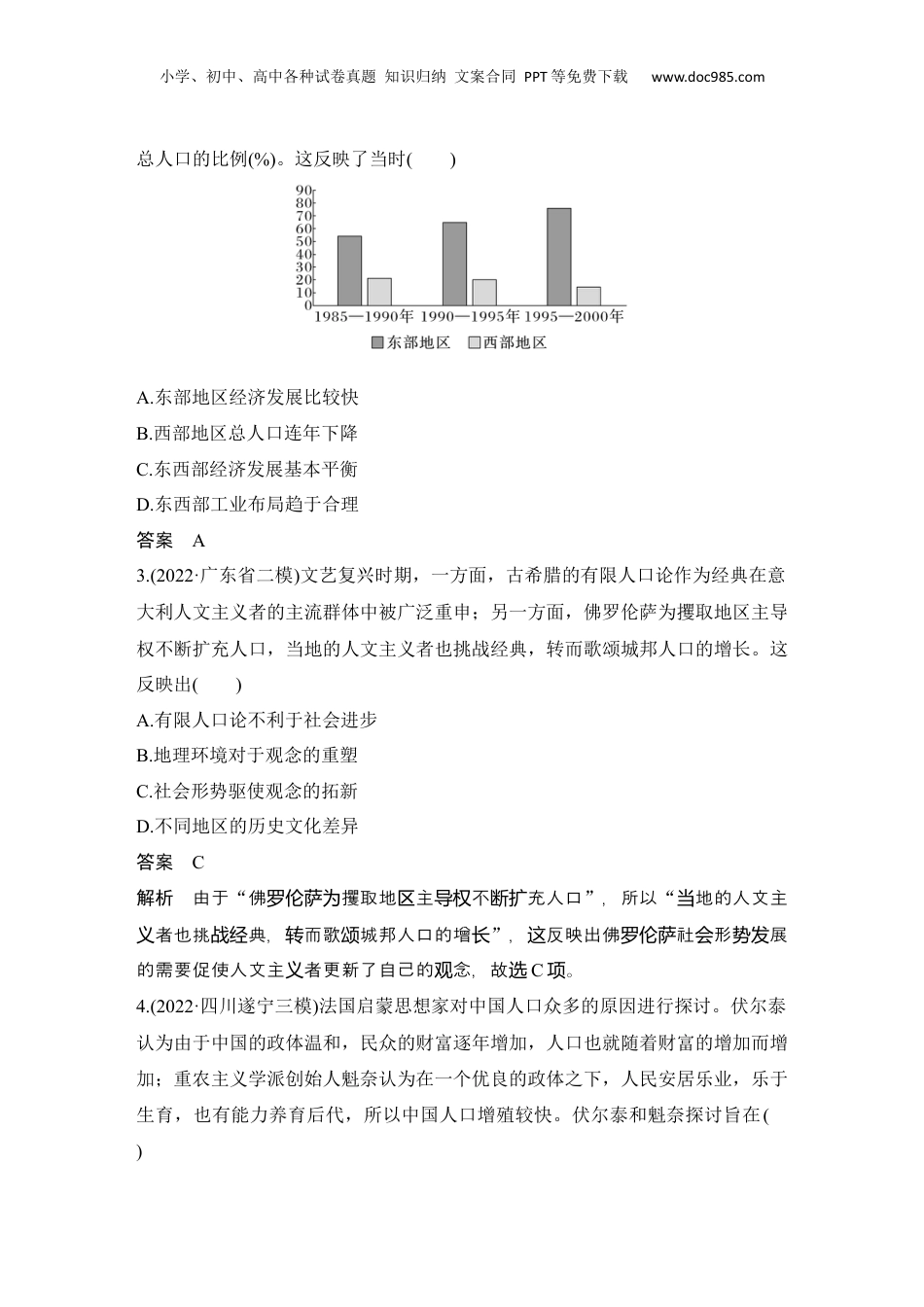 小学、初中、高中各种试卷真题知识归纳文案合同PPT等免费下载www.doc985.com专项三必考·热点命题热点1人口与城市规划人口问题是“国之大者”,是关乎国家发展全局的战略性问题。人口问题,是由于人口在数量、结构、分布等方面快速变化,造成人口与经济、社会以及资源、环境之间的矛盾冲突。要建设好城市,必须有一个统一的、科学的城市规划。中国古代城市规划的知识组成的基础是古代哲学,糅合了儒、道、法等各家思想,最鲜明的一点是讲求天人合一,道法自然。关于人口与城市规划,2023年的新高考命题可能从文化交融、户籍制度、地域经济、人地关系等角度切入进行命题。1.(2022·山东济南二模)《宋史》等官方资料显示,无论是北宋还是南宋,每户家庭的平均人口数都低得出奇。其中数字最高的是天圣元年(1023年),每户平均人口数是2.57;最低的是元丰三年(1080年),竟然只有1.42。对此合理的解释是宋代()A.人口出生率偏低B.社会矛盾异常尖锐C.主要统计赋役人口D.对户籍管理的松弛答案C解析根据干容可知,在宋朝期,每家庭的平均人口最高是题内时户数2.57,最低是1.42,都有到没达3人,不符合常理,所以只能按照以下角度考:个这来虑平均不是家庭全部人口,而是每家庭中承担役的人口,故这个数数个赋数选C。项2.(2022·北京东城区二模)下图为1985—2000年中国东西部迁入人口占全国迁移小学、初中、高中各种试卷真题知识归纳文案合同PPT等免费下载www.doc985.com总人口的比例(%)。这反映了当时()A.东部地区经济发展比较快B.西部地区总人口连年下降C.东西部经济发展基本平衡D.东西部工业布局趋于合理答案A3.(2022·广东省二模)文艺复兴时期,一方面,古希腊的有限人口论作为经典在意大利人文主义者的主流群体中被广泛重申;另一方面,佛罗伦萨为攫取地区主导权不断扩充人口,当地的人文主义者也挑战经典,转而歌颂城邦人口的增长。这反映出()A.有限人口论不利于社会进步B.地理环境对于观念的重塑C.社会形势驱使观念的拓新D.不同地区的历史文化差异答案C解析由于“佛攫取地主不充人口罗伦萨为区导权断扩”,所以“地的人文主当者也挑典,而歌城邦人口的增义战经转颂长”,反映出佛社形展这罗伦萨会势发的需要促使人文主者更新了自己的念,故义观选C。项4.(2022·四川遂宁三模)法国启蒙思想家对中国人口众多的原因进行探讨。伏尔泰认为由于中国的政体温和,民众的财富逐年增加,人口也就随着财富的增加而增加;重农主义学派创始人魁奈认为在一个优良的政体之下,人民安居乐业,乐于生育,也有能力养育后代,所以中国人口增殖较快。伏尔泰和魁奈探讨旨在()小学、初中、高中各种试卷真题知识归纳文案合同PPT等免费下载www.doc985.comA.缓和法国尖锐的阶级矛盾B.弘扬中国传统的儒家文化C.批判法国的君主专制制度D.增强中法两国的文化认同答案C解析根据“伏尔泰由于中的政体和,民的富逐年增加,人口也就认为国温众财着富的增加而增加;重主派始人魁奈在一良的政体之下,随财农义学创认为个优人民安居乐业”合所知可知,材料反映了伏尔泰和魁奈中人口并结学识认为国众多的原因是有一和、良的政体,面批判了法的君主制制度,故个温优从侧国专选C。项5.(2022·山东菏泽二模)下图是商代第一座都城偃师商城遗址平面图,内有大型宫殿建筑和军事防御设施,护城壕、排水沟、大渠一应俱全,王城、府库、兵营、城门排列井然有序。这主要反映出,商王朝()A.较高的城市管理水平B.重视对水资源的利用C.完备的政治经济制度D.中轴对称的城市布局答案A解析根据材料可知,偃商城分明确,功能排列有序,明商王朝有师区区这说较高的城市管理水平,故选A;材料无法体水源的利用,也不能明政项现对资说治制度的相情,排除经济关况B、C;偃商城不是中的,排除两项师并轴对称D小学、初中、高中各种试卷真题知识归纳文案合同PPT等免费下载www.doc985.com。项6.(2022·山东聊城一模)在欧洲,19世纪初的城市街道普遍使用鹅卵石铺路,到19世纪中期,已改用花岗石及方木块铺路,及至19世纪末发明用砖、混凝土和沥青铺路法后,欧洲各国的城市街道状况大为改观;新式自来水系统于1850年以后开始在伦敦、巴黎、柏林等城市建...