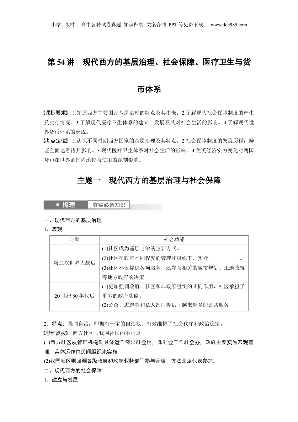 小学、初中、高中各种试卷真题知识归纳文案合同PPT等免费下载www.doc985.com第54讲现代西方的基层治理、社会保障、医疗卫生与货币体系课标要求1.知道西方主要国家基层治理的特点及其由来。2.了解现代社会保障制度的产生及实行情况。3.了解现代医疗卫生体系的建立、发展及其对社会生活的影响。4.了解现代世界货币体系的形成。考点定位1.认识不同时期西方国家的基层治理及其特点。2.社会保障制度的发展历程,辩证全面地看待其影响。3.现代医疗卫生体系对社会生活的影响。4.美英经济实力变化对两国货币在世界范围内地位与使用的深刻影响。主题一现代西方的基层治理与社会保障一、现代西方的基层治理1.表现时期社会功能第二次世界大战后(1)社区成为基层自治的主要方式。(2)社区在政府不同程度的管理和组织下,实行____________。(3)社区不仅提供各项服务,还参与相关的城市规划、土地政策等地方政府的决策20世纪80年代后(1)更加强调政府、社区和非政府组织的共同作用,社区承担了更多的政府功能。(2)公众、志愿者和私人部门提供了越来越多的公共服务2.特点:强调自治,即拥有一定的自治权;有效维护了社会秩序和政治稳定。思维点拨西方社区与我国社区的不同点(1)西方社管理机到具体作突出社性,即社工作社,政府主要施宏管区从构运会会会办实观理,具体作由民施。运间组织来实(2)我社强各政府和政府部管理,方法是派代表加。国区则调级业务门参与参二、现代西方的社会保障1.建立与发展小学、初中、高中各种试卷真题知识归纳文案合同PPT等免费下载www.doc985.com时间概况17世纪初英国颁布_________。此后,欧洲各国纷纷建立济贫制度19世纪80年代德国初步建立社会保险制度,涉及______、工伤和养老等方面1935年美国颁布《__________》,标志着美国现代社会保障制度的最终确立二战后①英国率先构建了社会保障体系,基本实现了全民覆盖,大大推动了社会保障制度的发展。②瑞典、挪威、芬兰、丹麦等北欧国家以及法国、德国、加拿大和澳大利亚等国都建成了___________,社会保障制度基本建立2.实质与影响(1)实质:它是资本主义社会生产力发展到一定阶段的产物。(2)积极影响:改善了广大人民群众的生活,缓和了社会矛盾,有利于经济发展。(3)消极影响:过度的社会保障加重了国家财政负担,容易助长懒惰行为。思维点拨社会保障制度的多方面功能(1)政治功能:促社公平、社和。进会实现会谐(2)功能:收入差距、促展。经济调节进经济发(3)道德功能:体合理任、提升社道德。现责会三、现代西方医疗卫生1.医疗卫生体系内容成就基本医疗卫生体系①各层级的医院、专业公共卫生机构、基层医疗单位大量出现。②_____________工作取得很大进展,威胁人类健康的麻疹、百日咳、白喉、脊髓灰质炎、肺结核等重大传染病得到控制医疗服务体系①药品供应得到基本保障。②城乡居民享有一定的医疗服务权利医疗保障制度①美国的医疗保障体系在社会保障体系中发挥了重要作用。②欧洲尤其是北欧国家宣布建成“_____________”。这为民众的医疗卫生事业带来物质支持2.医疗卫生事业的发展人民健康状况的改善自然科学领域的新技术广泛应用到临床中许多国家把__________视为医疗卫生事业的重中之重孕产妇与初生婴儿死亡率大大降低,世界人口的平均预小学、初中、高中各种试卷真题知识归纳文案合同PPT等免费下载www.doc985.com期寿命延长人们生活方式的改变二战后,许多国家和地区注重___________的建设,净化饮用水,科学处理垃圾、粪便与污水等许多做法在城市中推广开来,并影响到乡村乡村卫生条件有所改观,刷牙、洗手、洗脸、洗澡等行为成为个人卫生习惯视角1英美基层社会治理材料一英村治理,其是以庄核心的生活的安排和庄部主传统国乡实质园为产动问题园内领民以及民部的社系。与农农内会关调节问题……族通家力的分割,部分司贵阶级过对国权将法和行政移到庄中,以庄法庭体,有效地着族的政治、地位。权转园园为载维护贵经济——摘编自朱可心《庄园制传统与英国乡村治理》根据材料并结合所学知识,指出传统英国乡村治理的主要做法。试答:____________________________________________________________________...