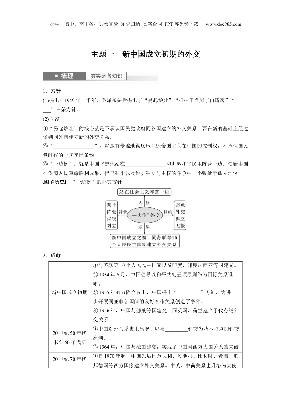 小学、初中、高中各种试卷真题知识归纳文案合同PPT等免费下载www.doc985.com一、中国现代史新中国成立后,坚持独立自主的和平外交方针,广泛发展同世界各国的友好关系。改革开放后,中国遵循和平发展理念,开展全方位外交,取得巨大成就。中共十八大以来,中国推进外交理论和实践创新,走出一条中国特色大国外交新路。二、世界现代史1.基层治理、社会保障、医疗卫生与货币体系:二战后,社区成为基层自治的主要方式;西方主要国家建成福利国家,社会保障制度基本建立;20世纪中期以来,许多西方国家建立了基本医疗卫生体系,许多国家和地区注重公共卫生的建设;美国利用两次世界大战使经济实力一次又一次地飞跃,为纽约成为世界性的金融中心提供了坚实的物质基础,二战后,美元通过布雷顿森林体系彻底击败英镑,成为货币霸主。2.食物生产、经济生活与科技进步:农业机械化、集约化、产业化提高了生产效率,保障了食品供应。科学技术的进步,增加了粮仓仓容量,实现了粮食储备自动化和智能化。冷冻食品工业迅猛发展。现代科技进步推动了生产力水平的提高和产业结构的调整,加强了世界各地间的经济联系,推动经济全球化进程和国际分工的变化,国际合作加强。3.人口迁徙、多元文化、战争与文化交锋:20世纪以来人口迁徙分布不均衡,主要是向发达国家和地区迁徙。一战进一步激发了亚欧非和拉丁美洲民族民主意识的觉醒;二战从政治理论上确立了民族自决原则与废除殖民主义的正义性,是对殖民主义的致命打击。二战后世界殖民体系土崩瓦解,新兴民族国家在建设现代化的过程中,形成了本土文化与西方文化相结合的新文化。第53讲当代中国的外交课标要求了解当代中国独立自主的和平外交政策及主要外交成就。考点定位1.新中国成立初期的外交政策与成就。2.改革开放时期的外交成就。小学、初中、高中各种试卷真题知识归纳文案合同PPT等免费下载www.doc985.com主题一新中国成立初期的外交1.方针(1)提出:1949年上半年,毛泽东先后提出了“另起炉灶”“打扫干净屋子再请客”“________”三条方针。(2)内容①“另起炉灶”的核心就是不承认国民党政府同各国建立的外交关系,要在新的基础上经过谈判同外国建立新的外交关系。②“________________”,就是有步骤地彻底地摧毁帝国主义在中国的控制权,不承认国民党时代的一切卖国条约。③“一边倒”,就是中国坚定地站在________________和世界和平民主阵营一边,使新中国在保障人民革命胜利成果、捍卫和平以及维护独立与主权的斗争中,不致处于孤立地位。图解历史“一边倒”的外交方针2.成就新中国成立初期①与苏联等10个人民民主国家以及印度、印度尼西亚等国建交。②1954年6月,中国倡导以和平共处五项原则作为国际关系准则。③1955年的万隆会议上,中国提出“_________”方针,为进一步开展同亚非各国间的友好合作关系创造了条件。④1956年,中国与挪威等国建交,同英国、荷兰建立了代办级外交关系20世纪50年代末至60年代初①中国对外关系史上出现了以与_________建交为基本特点的建交高潮。②1964年,中国与法国建交,实现了中国同西方大国关系的突破20世纪70年代①自1970年起,中国先后同意大利、奥地利、比利时、希腊、联邦德国等西方国家建立外交关系。中英、中荷关系也升格为大使小学、初中、高中各种试卷真题知识归纳文案合同PPT等免费下载www.doc985.com级。②1971年,中华人民共和国恢复在联合国的一切合法权利。③1972年,中美关系开始走向正常化,中日正式建交。④中国迎来建交高潮。到1976年,与中国建交的国家达到111个[思维点拨]20世纪六七十年代中国外交取得重大突破的原因(1)形上,共体成立、日本崛起、不盟起,世界格局出多化。国际势欧结运动兴现极趋势(2)中美系和。关缓(3)中整外交政策中的一些做法,采取的外交策略。国调务实(4)第三世界家在事中的作用越越大。国国际务发挥来视角和平共处五项原则材料一1949年上半年,毛先后提出了泽东“另起炉灶”“打干屋子再客扫净请”和“一倒边”三外交方。是根据中的史和以及的境作出的重大策。条针这国历现实当时国际环决——中共中央党史研究室《中国共产党历史》材料二世界各不...
