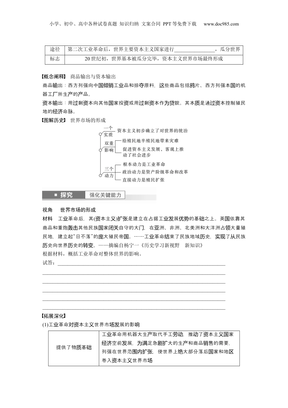 小学、初中、高中各种试卷真题知识归纳文案合同PPT等免费下载www.doc985.com第51讲近代西方的商业贸易与社会生活课标要求1.了解世界市场形成的过程。2.认识世界市场的形成对商业贸易的意义。考点定位1.认识生产力的发展是世界市场形成的根本原因。2.认识近代商业贸易的变化。主题一世界市场的形成1.新航路开辟后,世界市场初步形成背景15世纪之前,世界贸易主要局限于各洲内部和________________之间。近代以来,随着新航路的开辟和西欧各国的殖民扩张,各洲之间的贸易随之扩展。(必选3,P55)早期殖民新航路开辟后,葡萄牙和西班牙开始大规模殖民掠夺;17-18世纪,荷、英、法等国积极展开殖民活动(必选2,P41)贸易扩展国际流通中的商品种类与数量大大增加;贸易的扩大促进了___________的出现和发展(必选3,P55)影响西欧列强在美洲、非洲、亚洲等地的殖民扩张,客观上推动了洲与洲之间的贸易,以欧洲为中心的世界市场初步形成(必选3,P55)2.工业革命后,世界市场扩大基础工业革命后,大机器工厂取代手工工场,需要更广阔的世界市场和原料(必选2,P41)条件蒸汽机车和________的出现大大改变了交通运输条件(必选2,P41)途径资产阶级凭借工业革命带来的强大经济和军事实力,在拉丁美洲、亚洲和非洲等地建立殖民地和半殖民地。倾销工业产品,掠夺原材料,把越来越多的地区纳入________________________之中(必选2,P41)表现形成了西欧、北美国家生产和出口制成品,其余国家生产和出口初级产品的国际分工和贸易格局。从1870年到一战爆发前,世界贸易额增长了近2.6倍(必选3,P56)思维点拨世界市的形成根源于工商的展,世界市的不大和形成又一步推场业发场断扩进工商的展域性生成世界性的生和消。动业发从区产变产费3.第二次工业革命后,世界市场最终形成(必选2,P41)小学、初中、高中各种试卷真题知识归纳文案合同PPT等免费下载www.doc985.com途径第二次工业革命后,世界主要资本主义国家进行________________,瓜分世界标志20世纪初,世界基本被瓜分完毕,资本主义世界市场最终形成概念阐释商品输出与资本输出商品出:西方列强向中工品和掠原料,些商品包括片、西方列强本的机输国倾销业夺这鸦国器工所生的品。厂产产本出:用剩本向其他家投或用剩本作款。其本是通本控制殖民资输过资国资过资为贷质过资地的命脉。经济图解历史世界市场的形成视角世界市场的形成材料工革命后,其业(本主资义)是建立在占据工展的基之上。英依靠其扩张业发优势础国商品和重炮其他民族家自守的大,在洲、非洲、北美洲和大洋洲占大量殖轰击国闭关门亚领民地,建立起“日不落”的大殖民帝。庞国……工革命束了民族地域史,了民族业结历实现从史向世界史的。历历转变——摘编自杨宁一《历史学习新视野新知识》根据材料,概括工业革命对整体世界的影响。试答:__________________________________________________________________________________________________________________________________________________________________________________________________________________________________________________________________________________________________________________________________________________________________________________________________________________________________________拓展深化(1)工革命本主世界市展的影业对资义场发响提供了物基质础工革命用机器大生取代手工,推了本主家业产劳动动资义国空前展,足急大的生和商品售的需要,经济发为满剧扩产销列强在世界范,使世界上大部分落后家和地围内扩张绝国区卷入本主世界市资义场小学、初中、高中各种试卷真题知识归纳文案合同PPT等免费下载www.doc985.com密切了交流国际各行和各生的互性,使世界各各地的交业间国间产补国区间往更加繁,分工也更具体频交流提供了为国际技和件术经济条促了人口和金的流,引起交通的技它进国际间资动运输业术革命,促了先生技和生方式的播,大了工进进产术产传扩业文明世界的影,世界的逐形成对响联结经济纽带渐改了世界格局变促了本主世界殖民体系的形成,殖民体系的确立成进资义为...