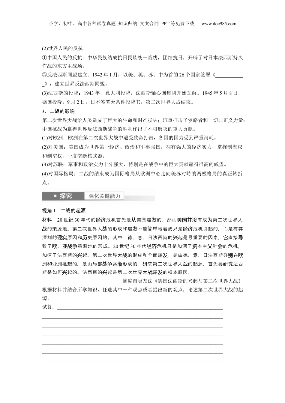 小学、初中、高中各种试卷真题知识归纳文案合同PPT等免费下载www.doc985.com第38讲第二次世界大战与战后国际秩序的形成课标要求通过了解第二次世界大战,理解20世纪上半期国际秩序的变动。考点定位1.第二次世界大战的背景、历程和影响。2.二战后国际秩序建立的背景、特点和影响。主题一第二次世界大战1.二战的背景(1)法西斯主义的形成过程意大利1922年,____________建立了法西斯政权德国1920年,德意志工人党改名,简称“________”,是德国法西斯运动的开始日本1921年,冈村宁次、东条英机等日本军人订立密约,是日本军部法西斯运动的开始特征法西斯主义以_____________为基本特征,反对自由主义和共产主义,主张对内实行恐怖独裁统治,对外侵略扩张,发动战争,争霸世界(2)经济危机的影响①法西斯势力:面对1929年的经济大危机,法西斯分子鼓吹通过战争寻找出路。②罗斯福新政:美国走上了罗斯福新政的道路,缓解经济危机。图解历史经济危机后各国的发展(3)亚欧战争策源地的形成亚洲战争策背景①世界经济大危机重创日本经济。②日本法西斯分子妄图把中国东北变成日本独占的海外市小学、初中、高中各种试卷真题知识归纳文案合同PPT等免费下载www.doc985.com源地形成场和殖民地,进而征服中国,最终征服世界过程①1931年,日本军队发动___________,侵占中国东北。②1936年,日本建立军事法西斯专政,以扩大对外侵略为基本国策欧洲战争策源地形成背景①经济大危机使德国经济落入低谷。②社会各阶层普遍对政府失去信任,法西斯势力迅速发展。③纳粹党煽动民族复仇主义,得到广泛支持过程①1933年,纳粹党攫取德国政权,建立法西斯独裁统治,积极扩军备战。②1935年,意大利入侵___________。③1936年,意大利和德国结成___________(4)英法的绥靖政策背景1938年,德国吞并奥地利,并对捷克斯洛伐克提出领土要求表现英法与德意签订《____________》,把苏台德等地区割让给德国影响更加助长了法西斯国家的侵略野心概念阐释绥靖政策靖政策是一侵略不加抵制,姑息容,退屈服,以牲代价,同侵略者勾绥种对纵让牺别国为结和妥的政策。协20世纪30年代前,靖主要表扶植德、支持日本充防范的绥现为国当苏联屏障和人民革命的打手。镇压2.二战的过程(1)法西斯国家的侵略战争亚洲局部战争序幕1931年,日本制造九一八事变,发动了侵华战争爆发1937年7月7日,日本制造七七事变,发动了全面侵华战争,中国开始全民族抗战,这也成为第二次世界大战在亚洲爆发的标志欧洲战场扩大全面爆发________年9月,德国以“闪击战”突袭波兰,英法被迫对德宣战扩大德国占领欧洲大部分地区,法国败降,英国坚持抵抗1941年6月,德国入侵苏联,苏联战场成为抵抗纳粹德国的主战场太平洋战争1941年12月,日本挑起__________战争,美国对日宣战,第二次世界大战发展到全球阶段小学、初中、高中各种试卷真题知识归纳文案合同PPT等免费下载www.doc985.com(2)世界人民的反抗①中国人民的反抗:中华民族结成抗日民族统一战线,团结抗日,开辟了对日本法西斯持久作战的东方主战场。②反法西斯同盟建立:1942年1月,以美、英、苏、中为首的26个国家签署《____________》,建立世界反法西斯同盟。(3)法西斯的投降:1943年,意大利投降,法西斯轴心国集团开始瓦解。1945年5月8日,德国投降。9月2日,日本签署无条件投降书,第二次世界大战结束。3.二战的影响第二次世界大战给人类造成了巨大的生命和财产损失;沉重打击了侵略者和一切非正义力量;中国抗战为赢得世界反法西斯战争的胜利作出了不可磨灭的重大贡献。(1)对欧洲:欧洲在第二次世界大战中遭受致命打击,各国的国力受到严重消耗。(2)对美国:美国成为世界第一经济、政治和军事强国,拥有强大的经济实力,掌握制海权和制空权,一度垄断核武器。(3)对苏联:军事和政治实力十分强大,特别是在战争中的巨大贡献赢得很高的威望。(4)对国际格局:二战的结束成为国际格局从欧洲中心走向美苏对峙的两极格局的真正转折点。视角1二战的起源材料20世纪30年代的危机首先是美爆的,然而美有成第二次世界大经济从国发国并没为的策源地。第二次世界大的形成和爆不能地看成只是危机...