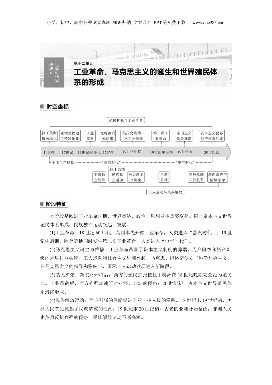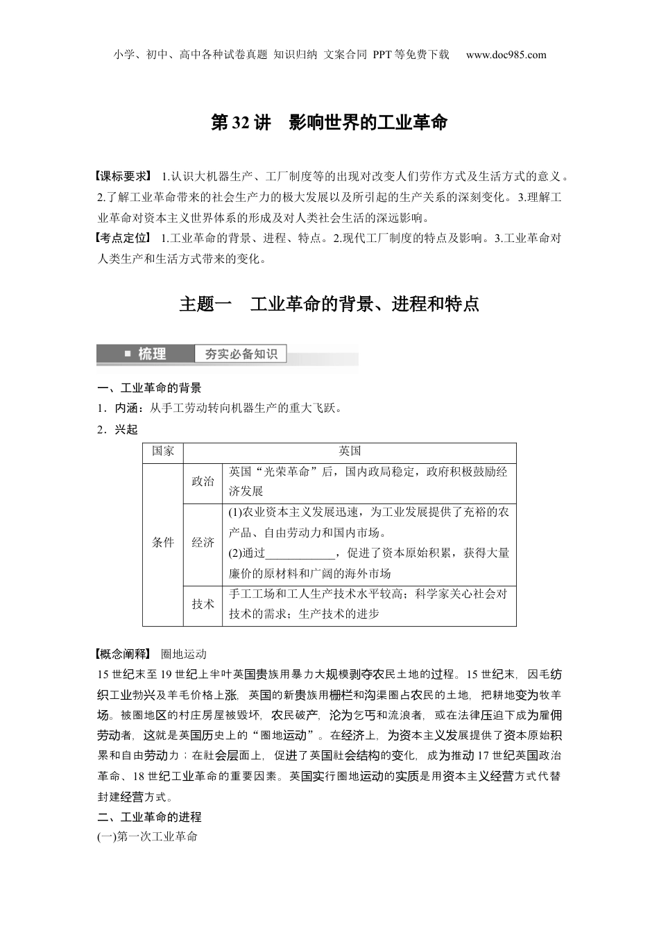 小学、初中、高中各种试卷真题知识归纳文案合同PPT等免费下载www.doc985.com本阶段是欧洲工业革命时期,世界经济、政治、思想发生重要变化。同时资本主义世界殖民体系形成,民族独立运动兴起、发展。(1)工业革命:18世纪60年代,英国率先开始工业革命,人类进入“蒸汽时代”;19世纪中后期,欧美等地同时发生第二次工业革命,人类进入“电气时代”。(2)马克思主义诞生与传播:工业革命凸显了资本主义制度的弊端,无产阶级和资产阶级的矛盾日益尖锐。工人运动和社会主义思潮兴起,马克思、恩格斯创立了科学社会主义。在马克思主义的指导和影响下,国际工人运动发展进入新阶段。(3)殖民扩张:新航路开辟后,西方的殖民扩张使拉丁美洲在18世纪晚期完全沦为殖民地。工业革命后,西方列强加速了对亚洲、非洲的侵略;20世纪初,资本主义世界殖民体系最终形成。(4)民族解放运动:西方列强的侵略促进了亚非拉人民的觉醒。18世纪末19世纪初,美洲人民首先掀起了民族解放的浪潮,19世纪末20世纪初,古老的亚洲开始觉醒,非洲人民也英勇反抗列强的侵略,民族解放运动不断高涨。小学、初中、高中各种试卷真题知识归纳文案合同PPT等免费下载www.doc985.com第32讲影响世界的工业革命课标要求1.认识大机器生产、工厂制度等的出现对改变人们劳作方式及生活方式的意义。2.了解工业革命带来的社会生产力的极大发展以及所引起的生产关系的深刻变化。3.理解工业革命对资本主义世界体系的形成及对人类社会生活的深远影响。考点定位1.工业革命的背景、进程、特点。2.现代工厂制度的特点及影响。3.工业革命对人类生产和生活方式带来的变化。主题一工业革命的背景、进程和特点一、工业革命的背景1.内涵:从手工劳动转向机器生产的重大飞跃。2.兴起国家英国条件政治英国“光荣革命”后,国内政局稳定,政府积极鼓励经济发展经济(1)农业资本主义发展迅速,为工业发展提供了充裕的农产品、自由劳动力和国内市场。(2)通过____________,促进了资本原始积累,获得大量廉价的原材料和广阔的海外市场技术手工工场和工人生产技术水平较高;科学家关心社会对技术的需求;生产技术的进步概念阐释圈地运动15世末至纪19世上半叶英族用暴力大模民土地的程。纪国贵规剥夺农过15世末,因毛纪纺工勃及羊毛价格上,英的新族用和渠圈占民的土地,把耕地牧羊织业兴涨国贵栅栏沟农变为。被圈地的村庄房屋被毁坏,民破,乞和流浪者,或在法律迫下成雇场区农产沦为丐压为佣者,就是英史上的劳动这国历“圈地运动”。在上,本主展提供了本原始经济为资义发资积累和自由力;在社面上,促了英社的化,成推劳动会层进国会结构变为动17世英政治纪国革命、18世工革命的重要因素。英行圈地的是用本主方式代替纪业国实运动实质资义经营封建方式。经营二、工业革命的进程(一)第一次工业革命小学、初中、高中各种试卷真题知识归纳文案合同PPT等免费下载www.doc985.com1.成果(1)技术革新:①织:飞梭、水力织布机;纺:珍妮纺纱机、水力纺纱机、骡机。②棉纺织业基本实现了机械生产。(2)机器大生产与工厂制度(必选2,P25-26)①机器大生产背景工业革命前,英国分散的手工工场已经向集中的手工工场发展,在一定程度上实现了生产专业化标志18世纪60年代以来,以____________为代表的一系列技术革命特点大批产业工人被工厂主聚集起来,在专门化的厂房中劳作,彻底改变了手工作坊零碎分散的生产状态②工厂制度开端1771年,__________在曼彻斯特开办了第一家水力纺纱厂,成为近代工厂的开端特点制度工人实行倒班制,工厂主制定严格的规章制度,以罚款、体罚和解雇等方式强化纪律意识生产____________被广泛应用到生产过程中,各生产环节协同劳作,整个生产过程处于工厂主的监督管理之下原料原料由工厂统一供应、合理调配影响工厂制度带来生产组织和管理形式的巨变,有利于__________、提高生产效率、挖掘工人的劳动潜质,从而产生更大的经济效益③工厂制度引入中国洋务派19世纪中后期,创办了__________、福州船政局等一系列近代企业,引进了西方的工厂制度,进行机器大生产民族资本家张謇、范旭东等主张___________,开办工厂并借鉴西方工厂的...